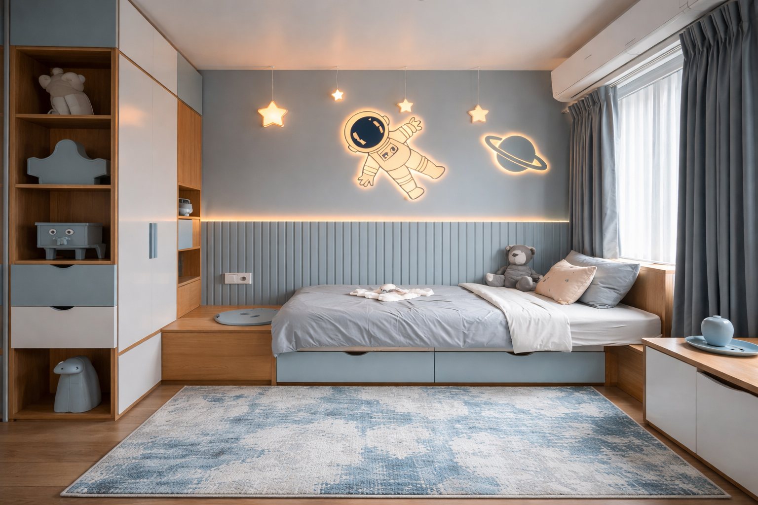 Современный подход к дизайну детской — это осознанность. Натуральные материалы (шерсть, хлопок, лён, джут) и экологичные производственные процессы — уже не просто тренд, а норма ответственного родительства. Они обеспечивают здоровый микроклимат в комнате. Актуальны природные мотивы в узорах — листья, волны, силуэты животных — которые создают гармоничную, умиротворяющую связь с природой.