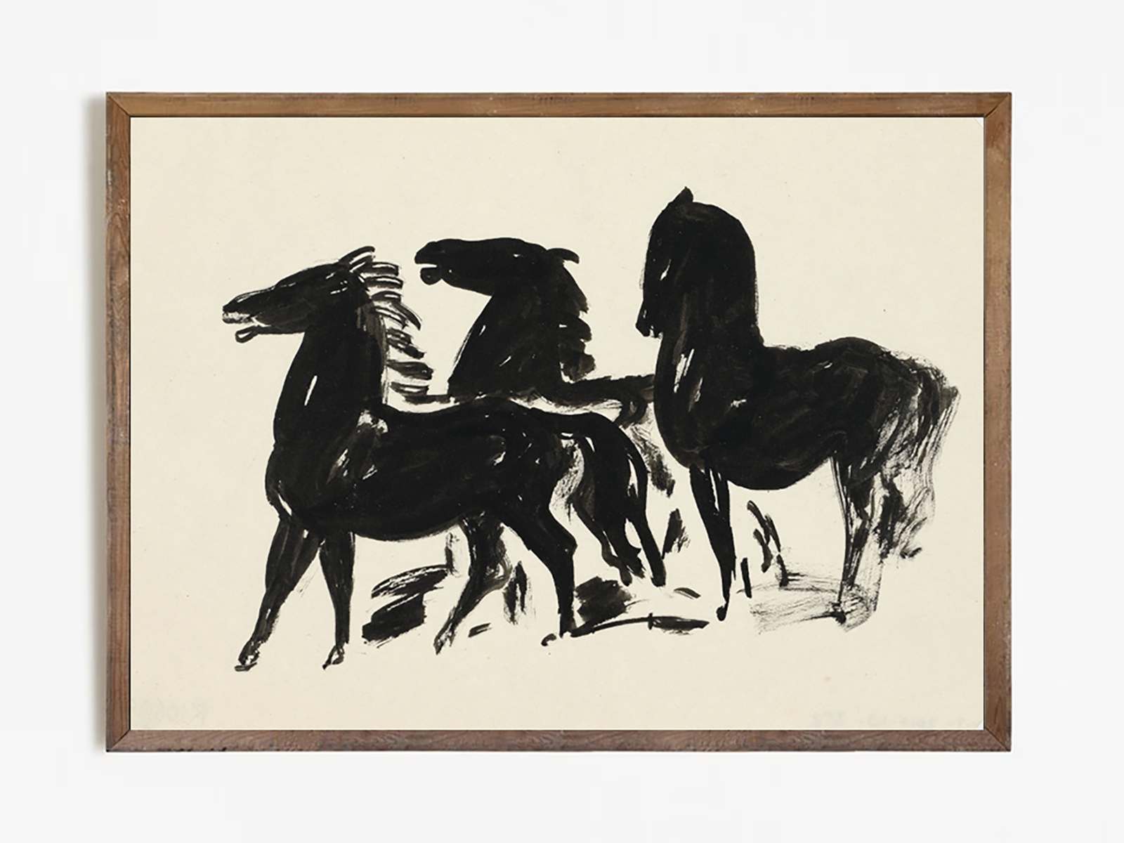 Арт-принт передаёт энергию движения и свободы. Фигуры лошадей, выполненные широкими, живыми мазками, будто вырастают из пространства холста и устремляются вперёд. Контраст чёрного силуэта и светлого фона создаёт напряжённый ритм — как диалог силы и грации, инстинкта и гармонии. Это не просто деталь, а способ рассказать историю дома, добавить эмоции и сделать пространство по-настоящему живым.