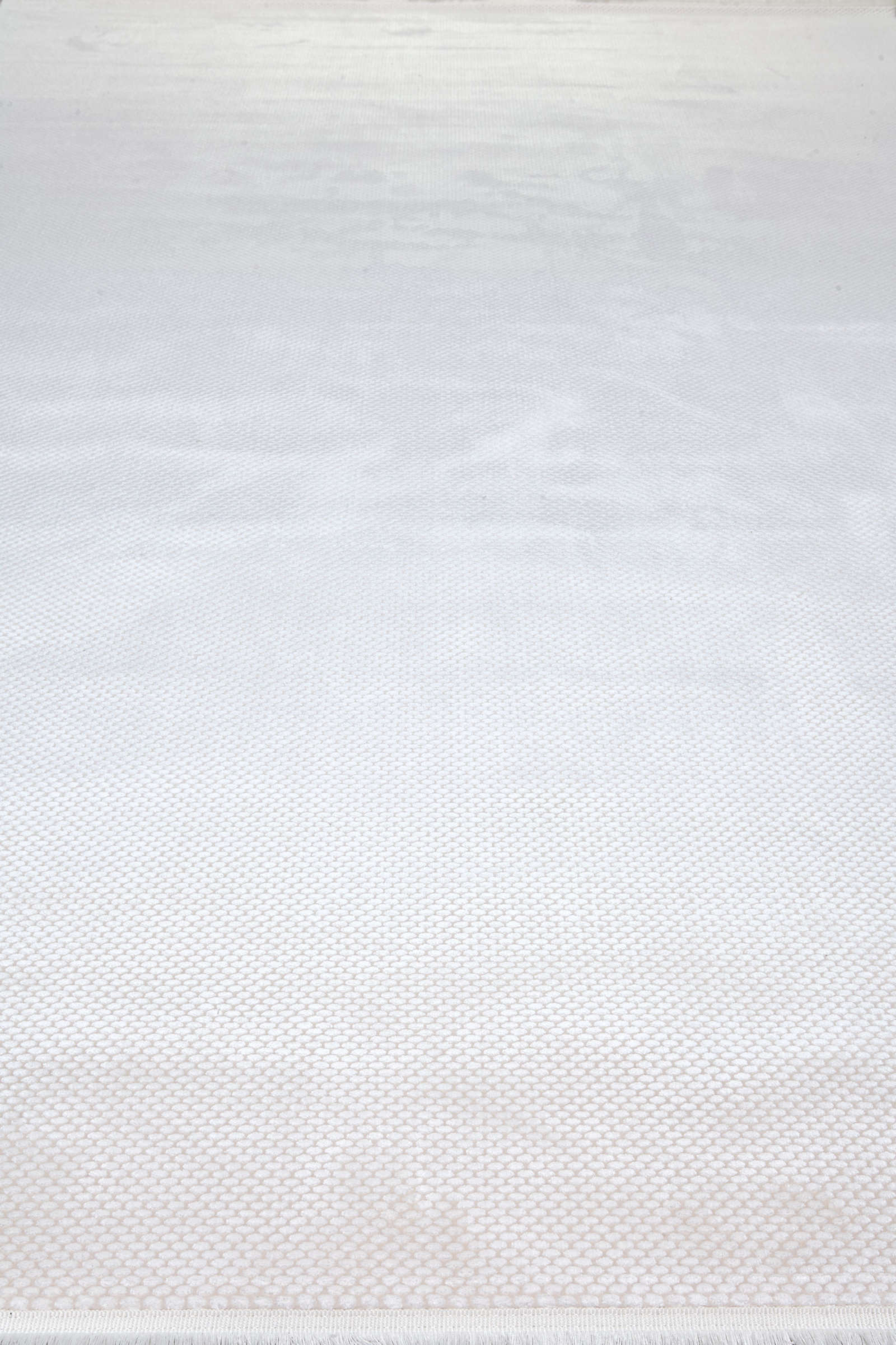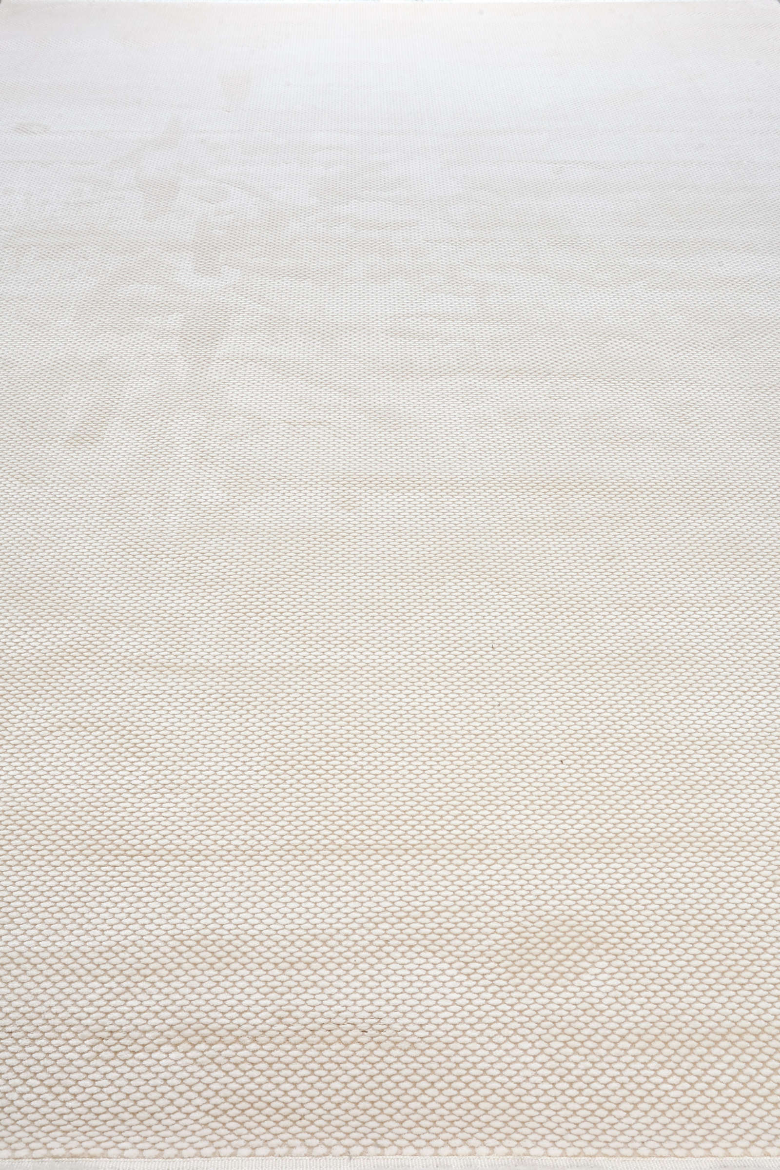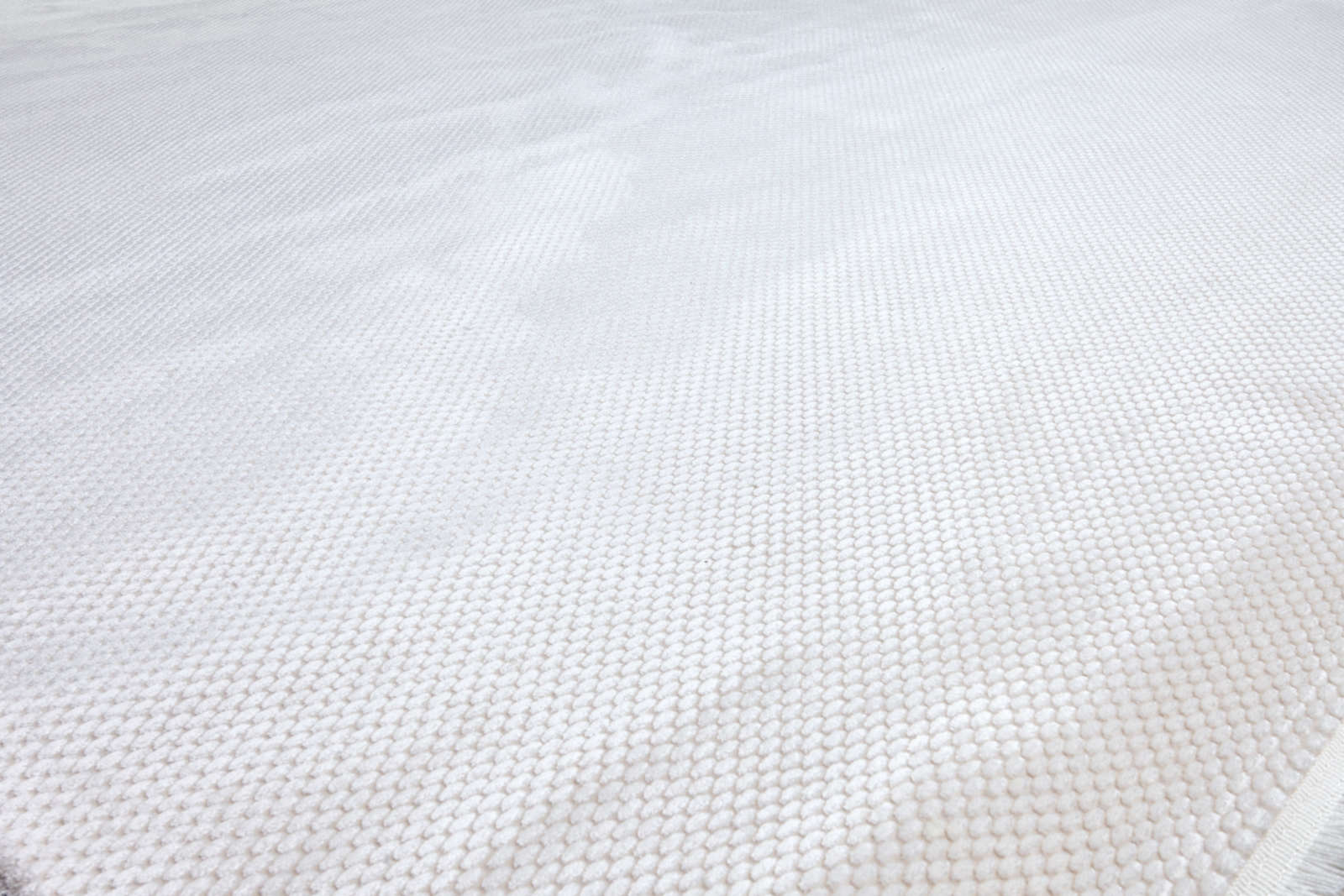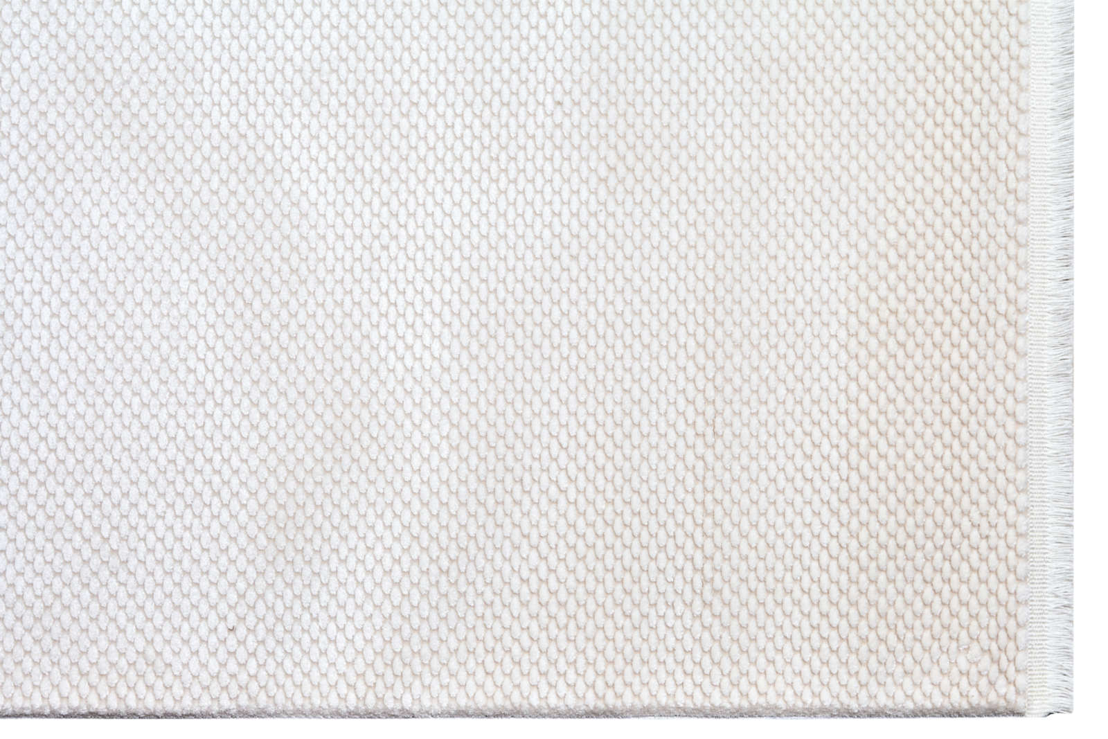 Ковёр выполнен в светлом нейтральном тоне. Тонкое равномерное переплетение придаёт поверхности аккуратную структуру и визуальную глубину. Фактура — тактильно приятная и спокойная — по ощущениям напоминает мягкий хлопковый плед. При ходьбе ковёр ощущается устойчивым и комфортным, без излишней рыхлости, добавляет интерьеру уюта и собранности. Благодаря своему оттенку и лаконичному рисунку он легко вписывается в современные, скандинавские и минималистичные интерьеры, работает как светлая основа, подчёркивает мебель, свет и архитектуру пространства.