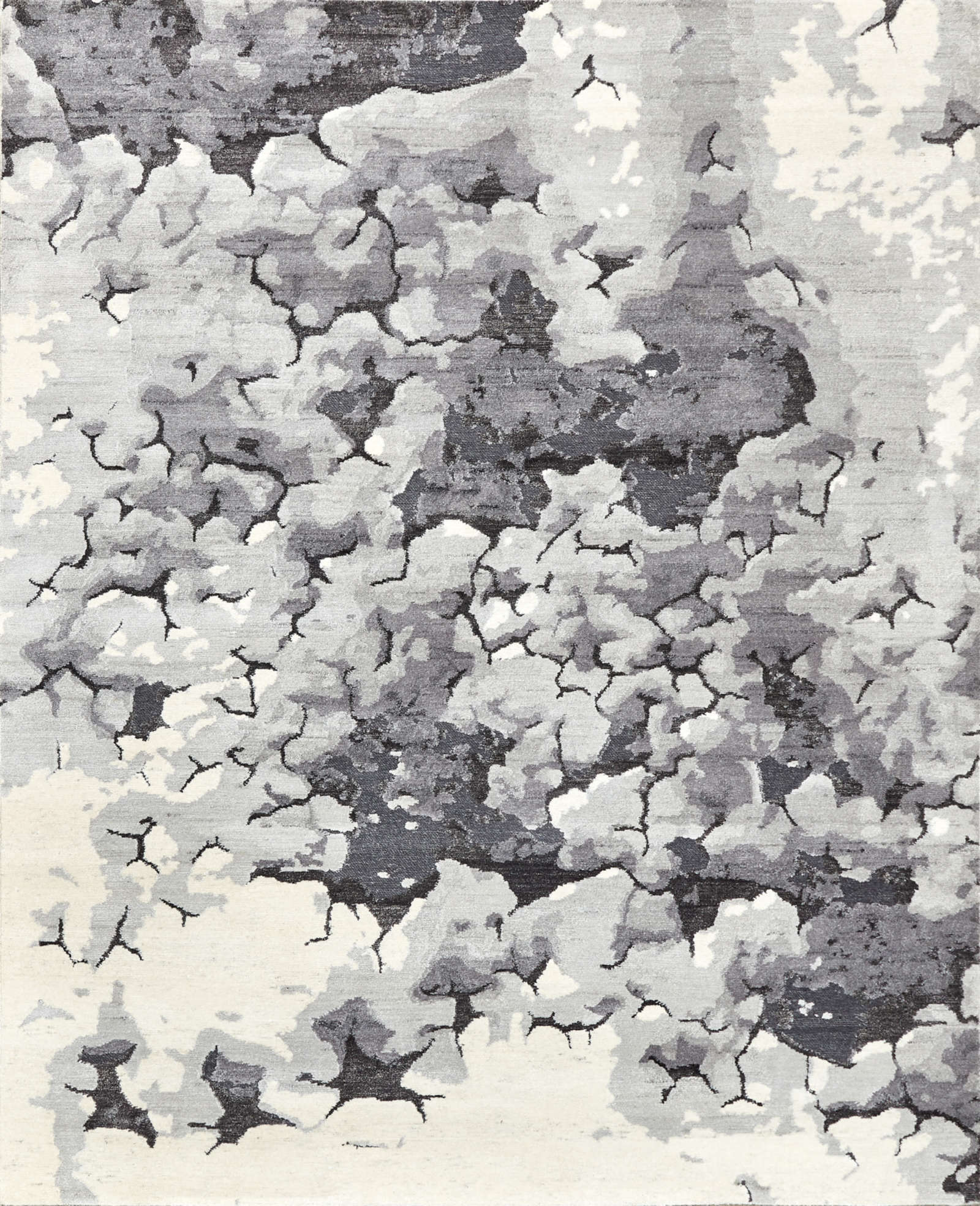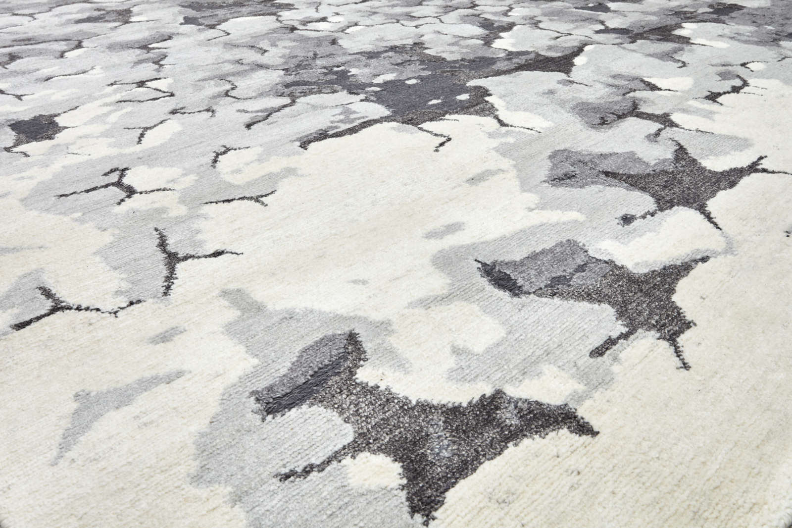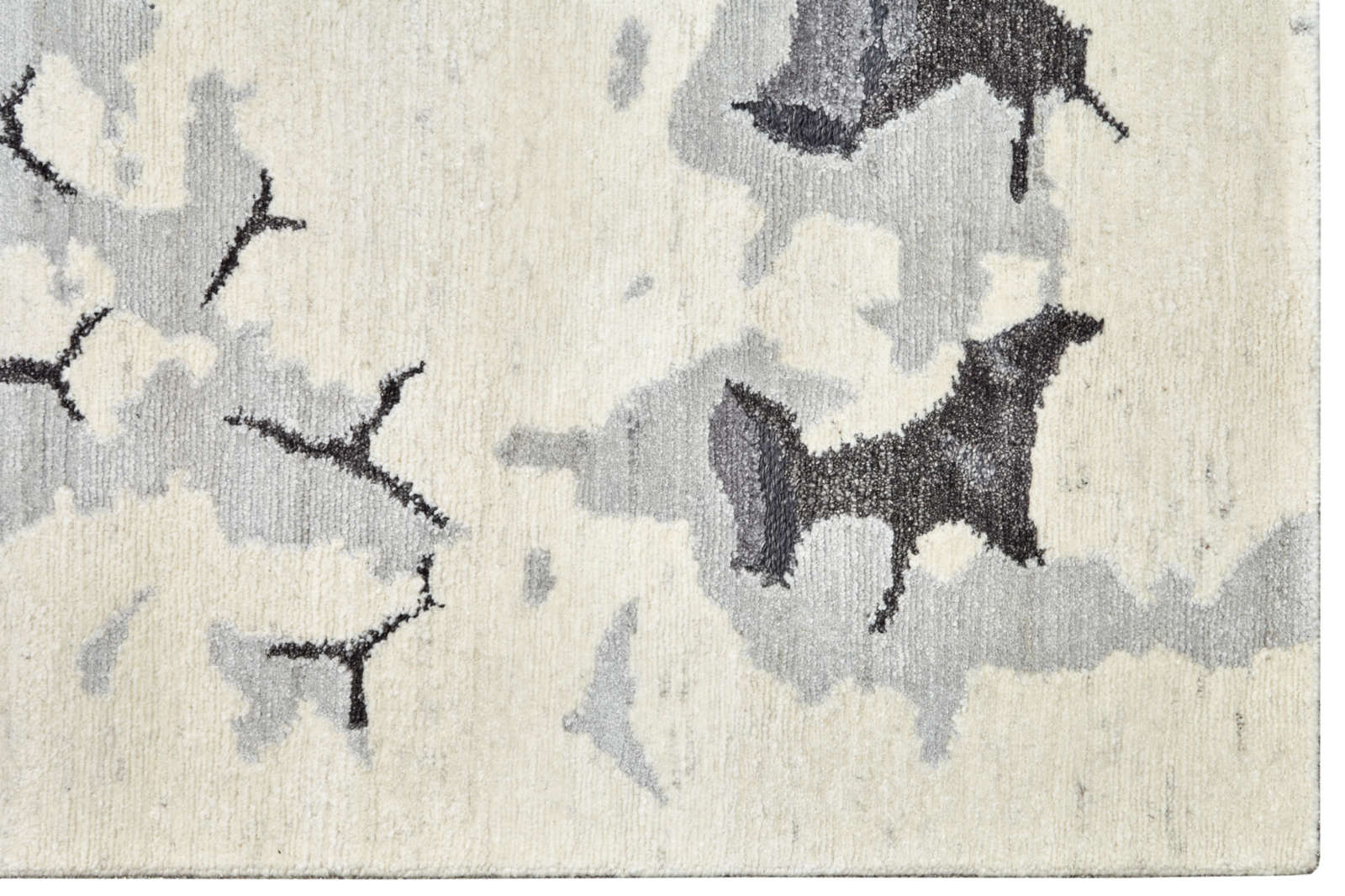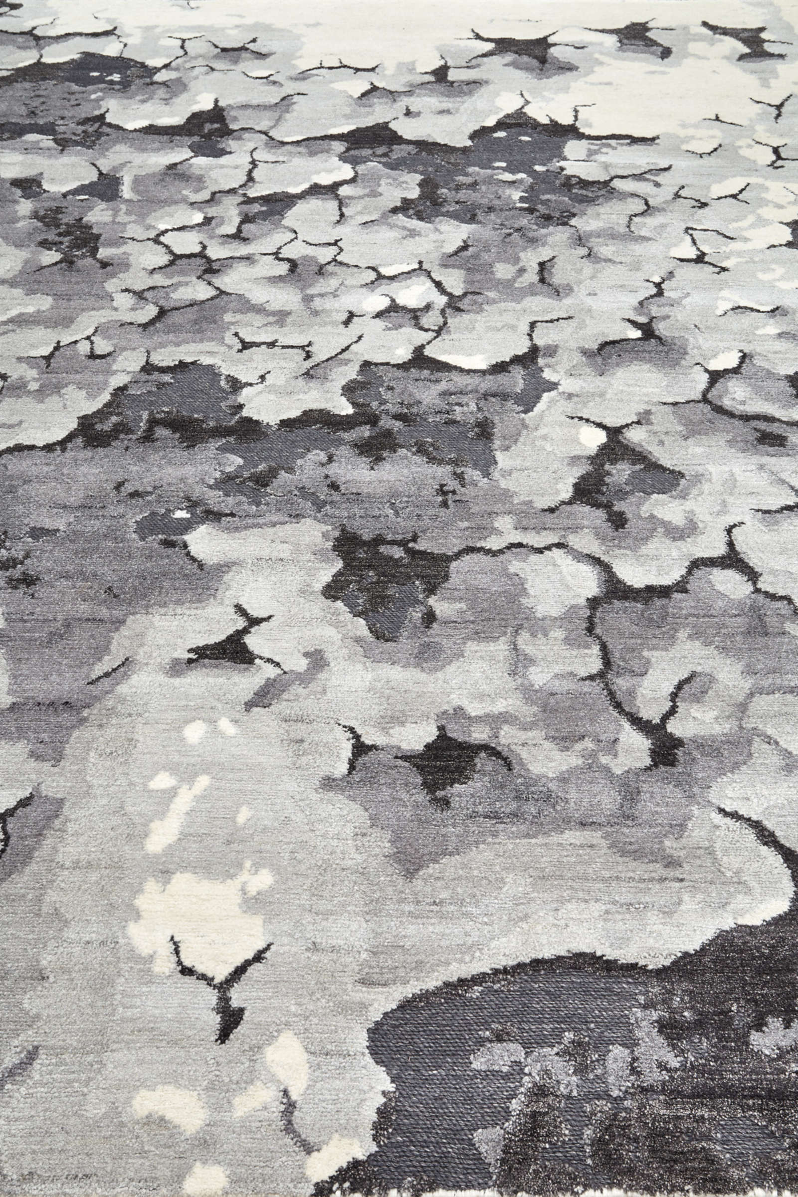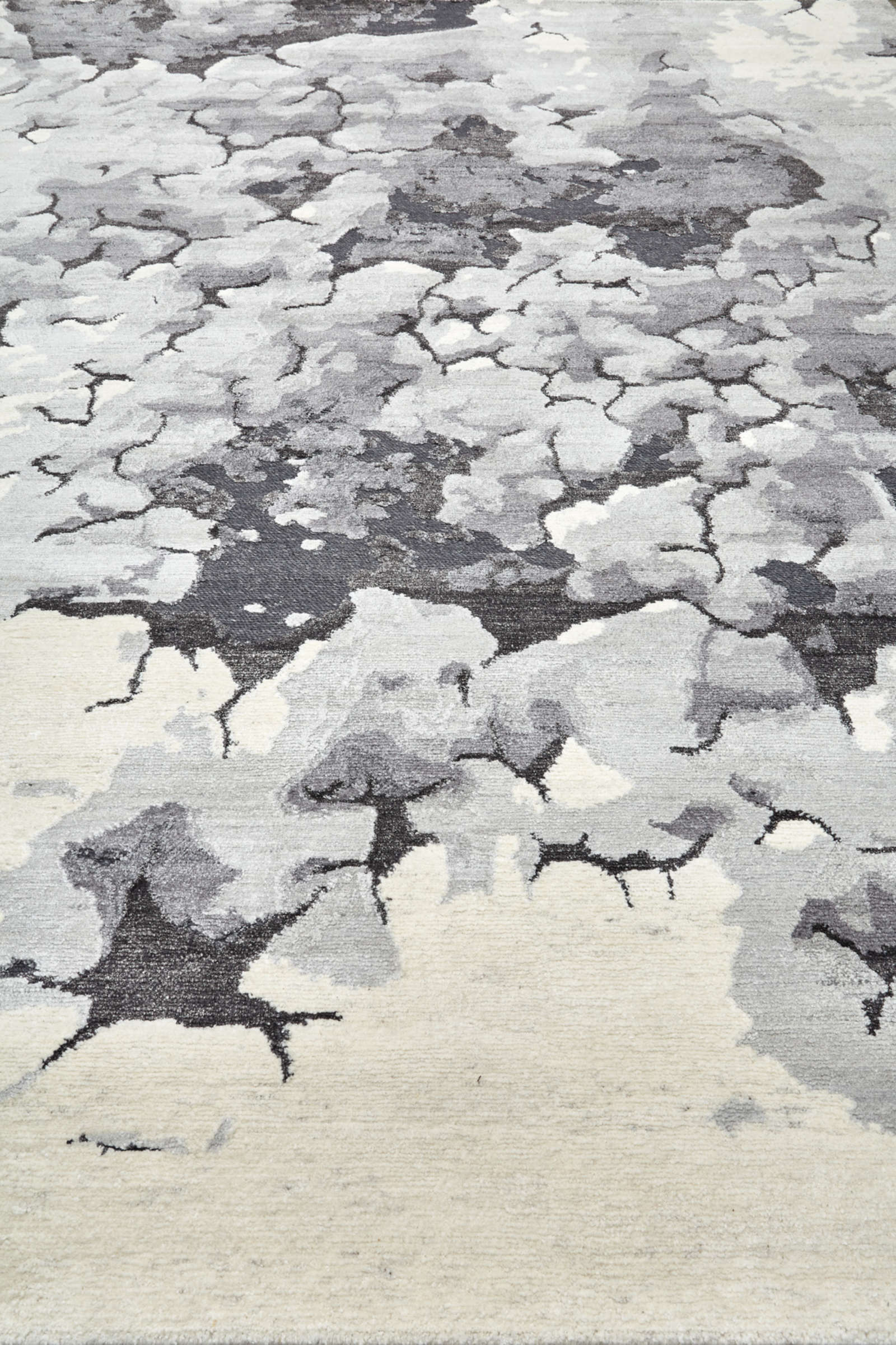 Индийский ковёр ручной работы из шерсти и артшёлка с выразительной абстрактной текстурой. Сложная палитра серых и молочных оттенков создаёт эффект глубины и многослойности. Контраст матовой шерсти и лёгкого сияния артшёлка усиливает объём и игру света.