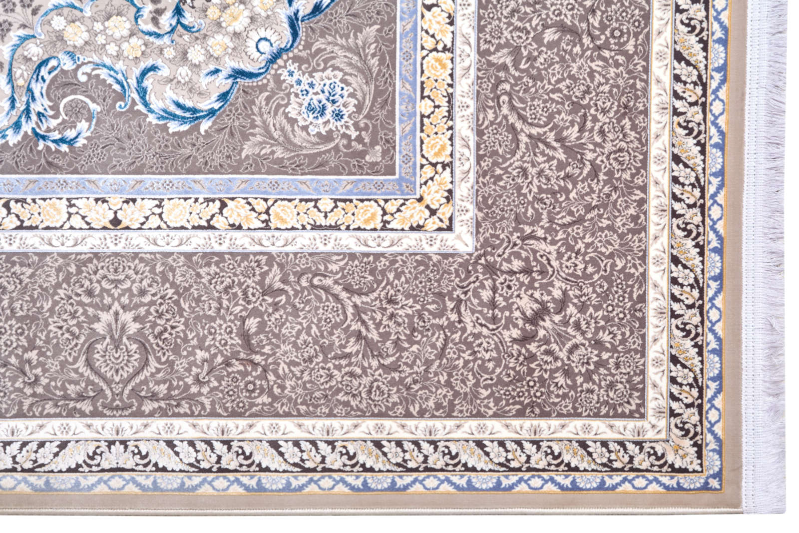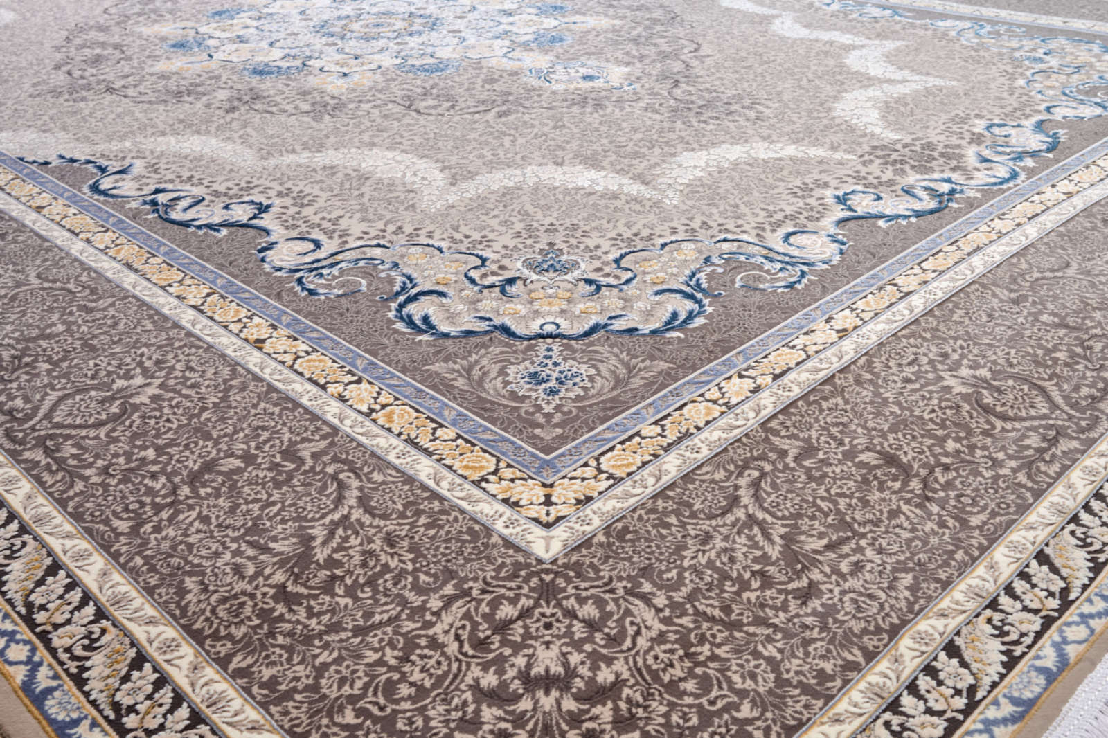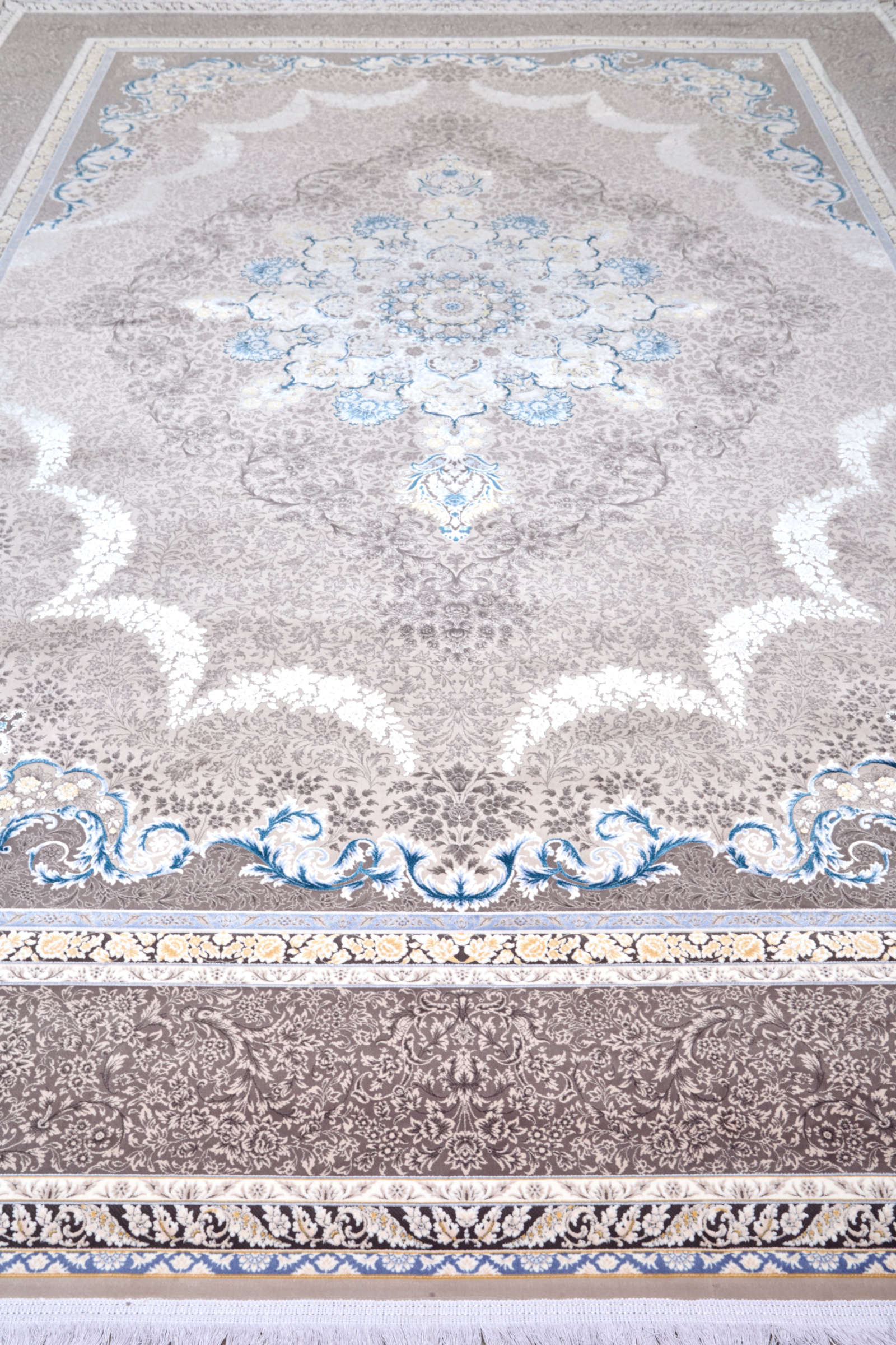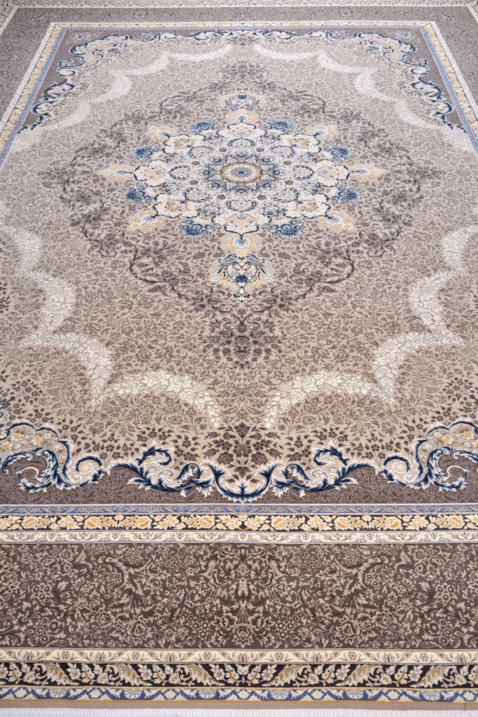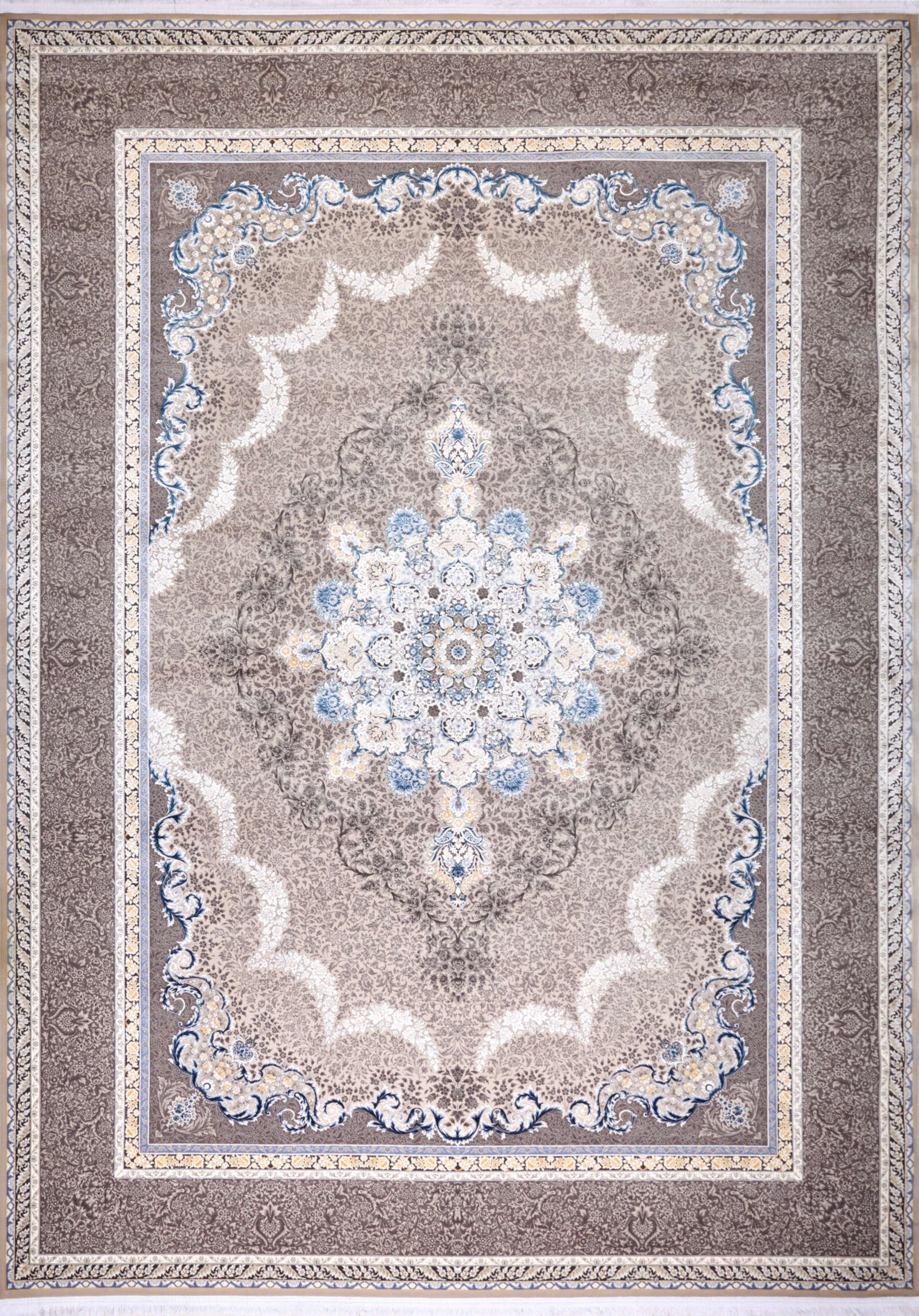 Ковёр в бежево-серых оттенках с центральной медальонной композицией. Лёгкий акцент голубого в орнаменте добавляет свежести и воздушности. Идеален для классического интерьера в спокойной цветовой гамме.