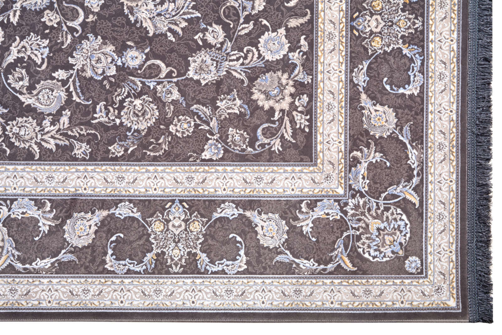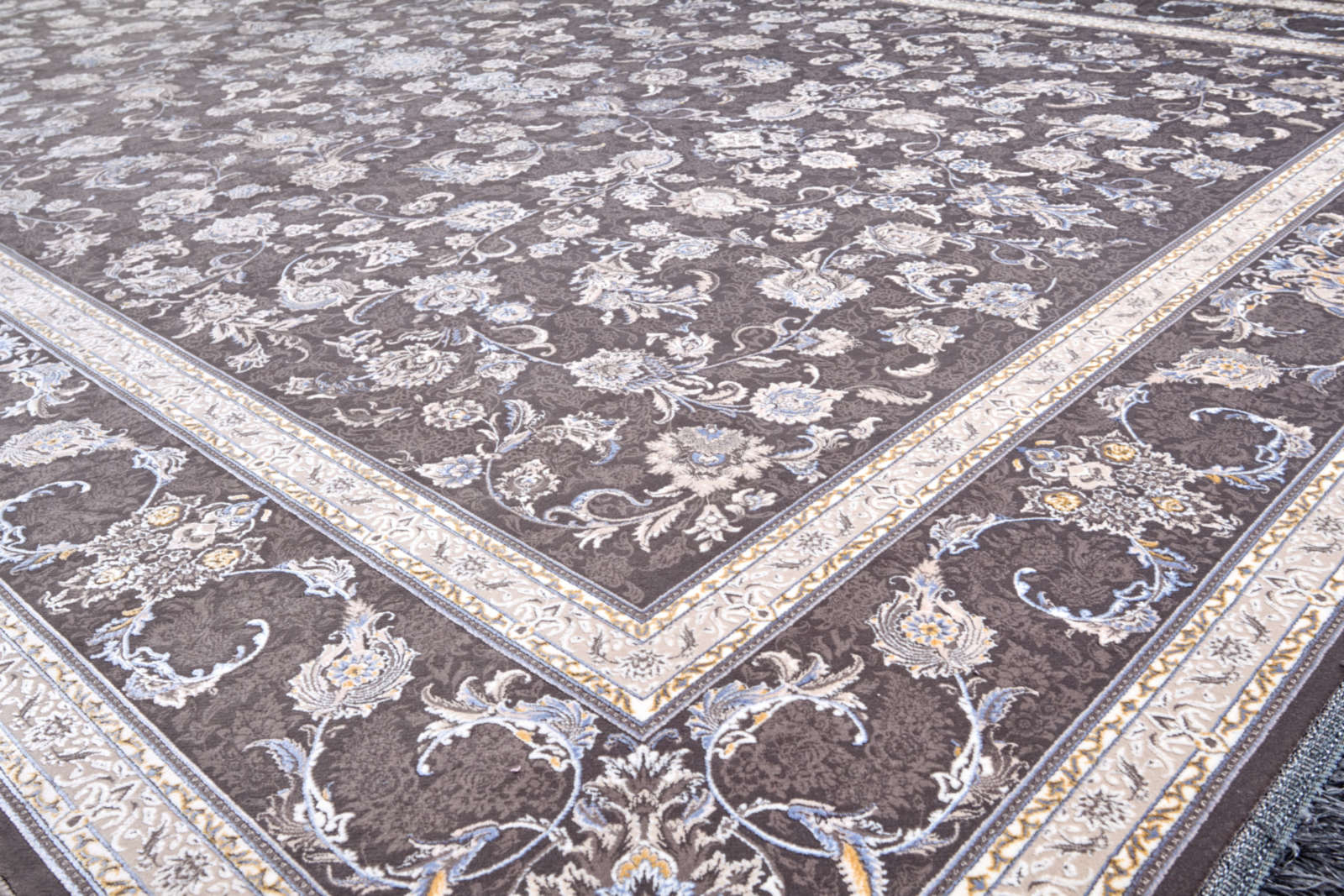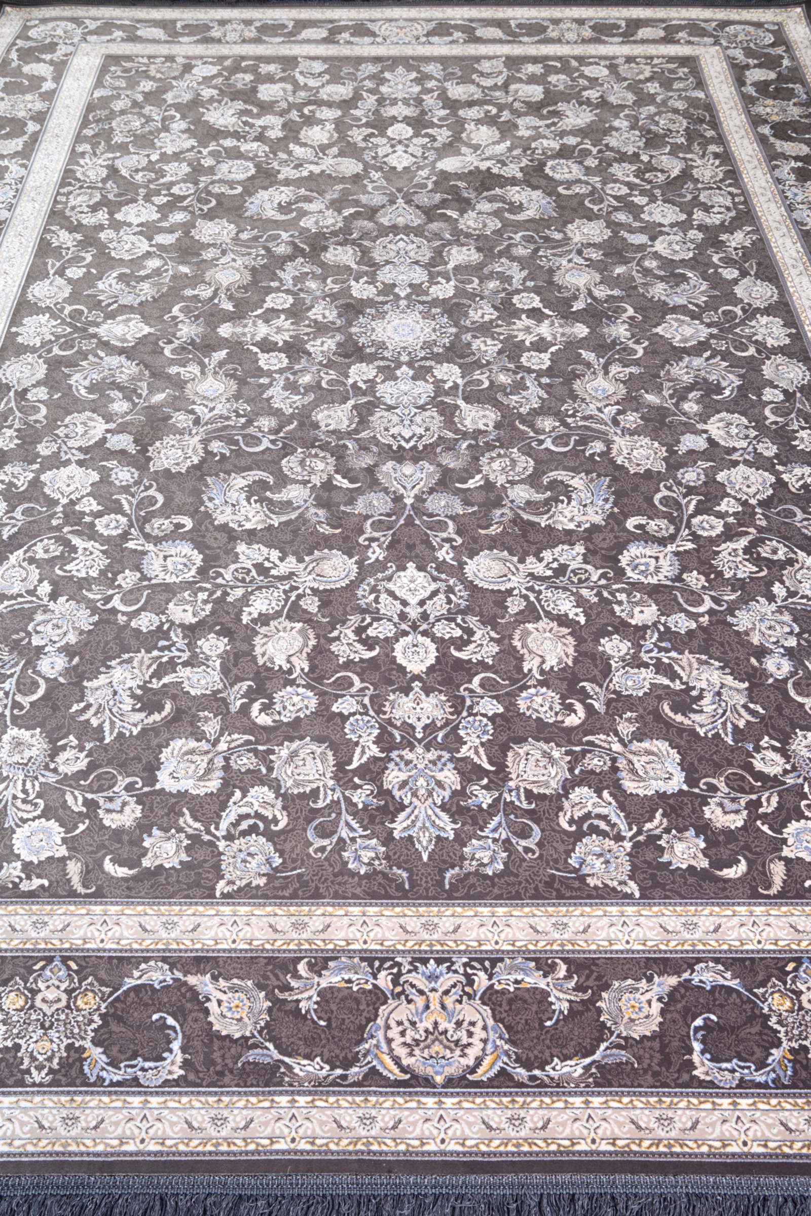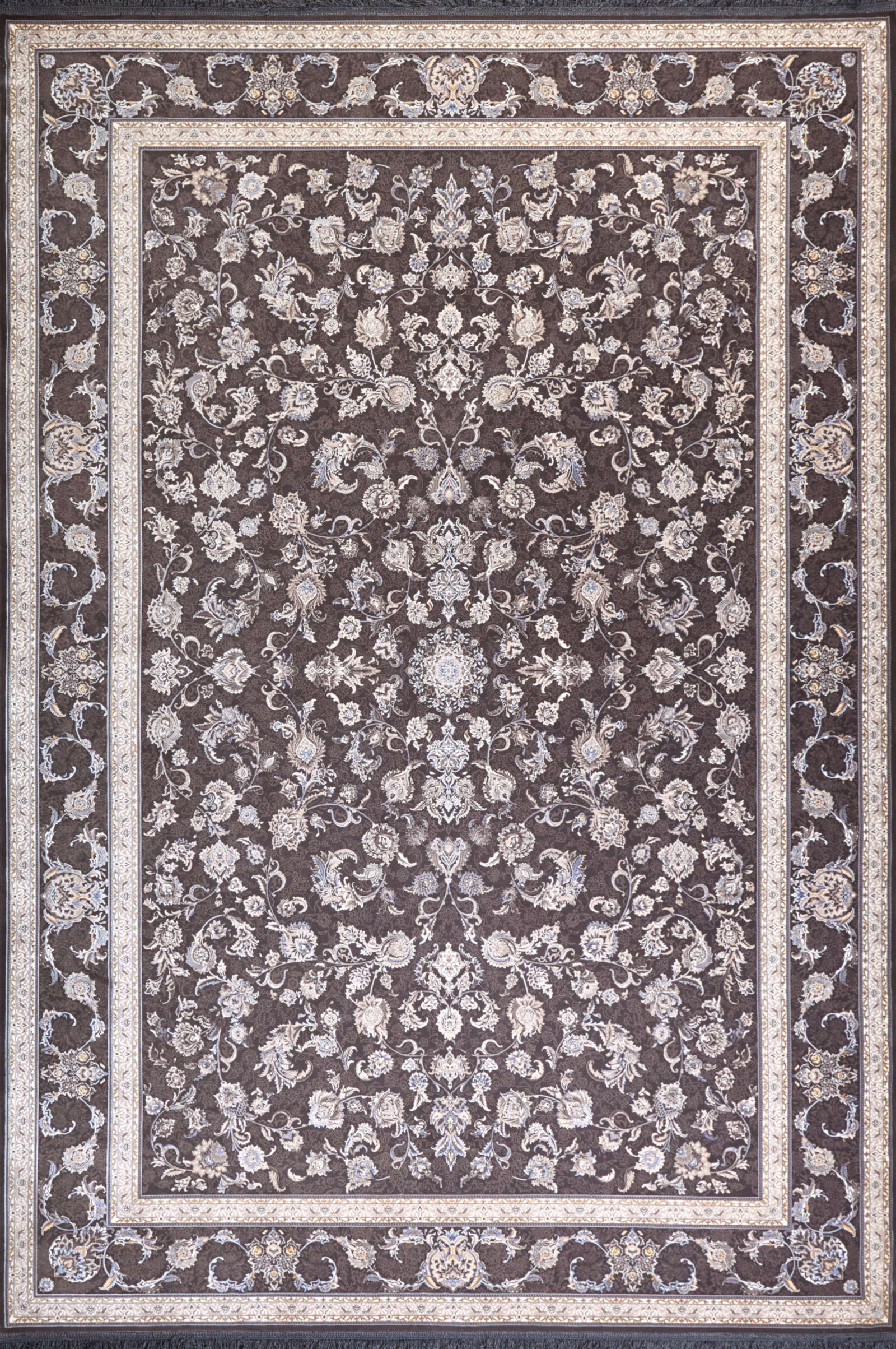Этот ковёр — воплощение восточной элегантности и гармонии. На глубоком тёмно-коричневом фоне словно распустился сад изысканных цветов, оттенённых кремовыми и серебристыми узорами. Его орнамент напоминает тончайшее кружево, созданное мастерами для украшения дворцовых залов. Такой ковёр наполнит пространство особой торжественностью и станет центром композиции комнаты. Он идеально дополнит классическую гостиную с массивной мебелью из тёмного дерева, подчеркнёт атмосферу кабинета с книжными полками и камином или создаст гармоничный контраст в современном интерьере с нейтральными стенами. Этот ковёр не только декоративный элемент, но и символ утончённого вкуса, связывающий прошлое и настоящее в едином пространстве.