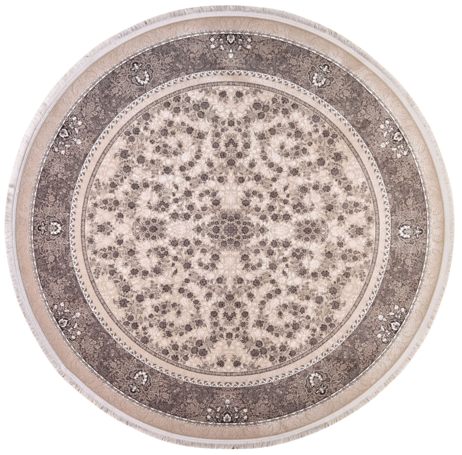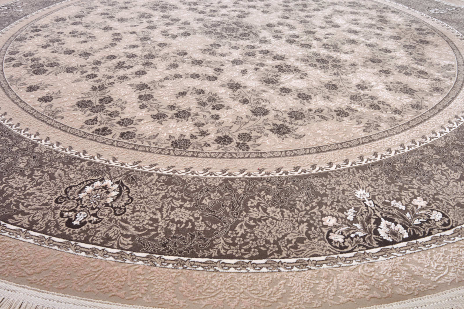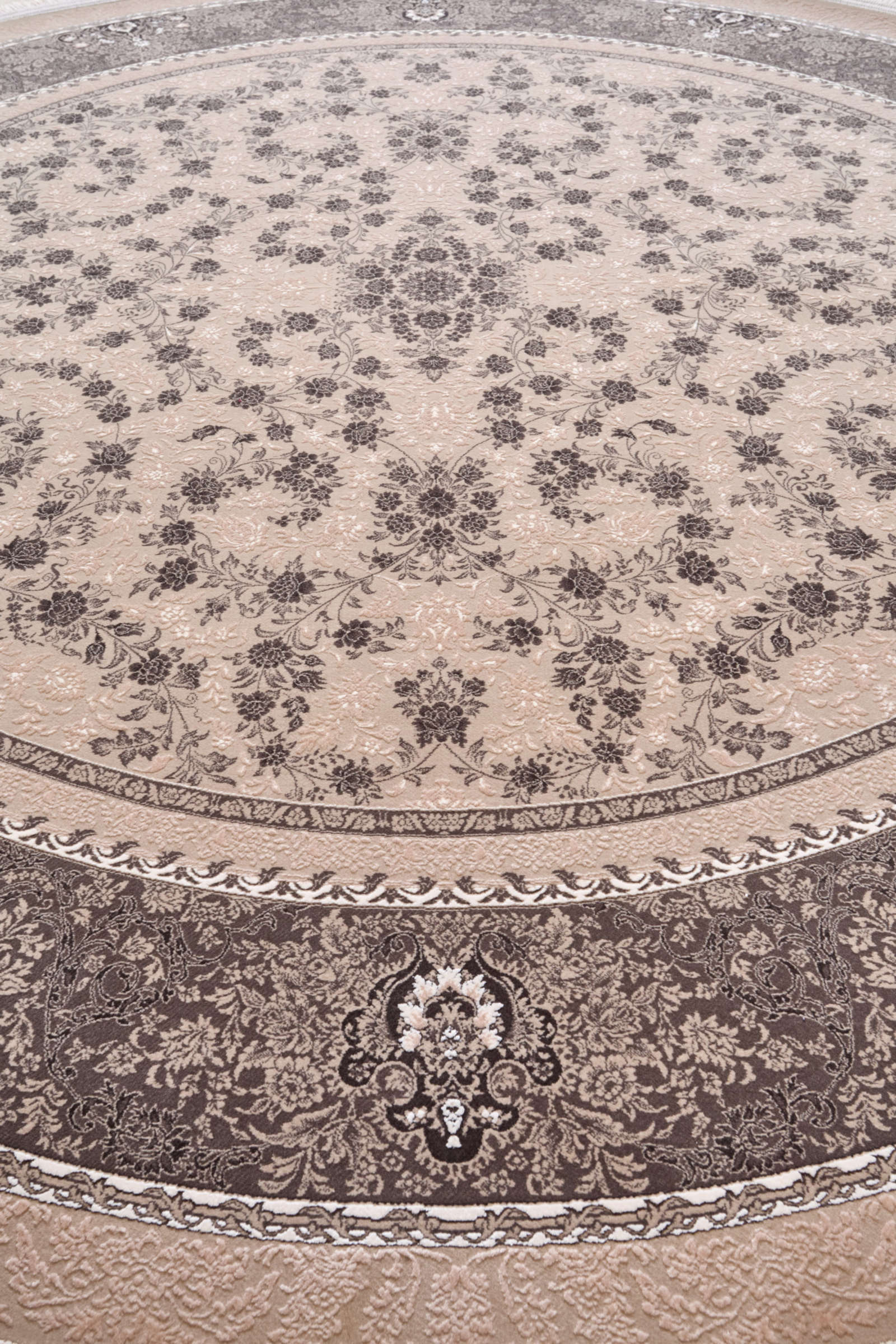 Ковёр в мягкой бежево-коричневой гамме с витиеватым растительным узором. Орнамент напоминает кружево и создаёт ощущение лёгкости. Подойдёт для интерьеров в стиле классика или неоклассика.