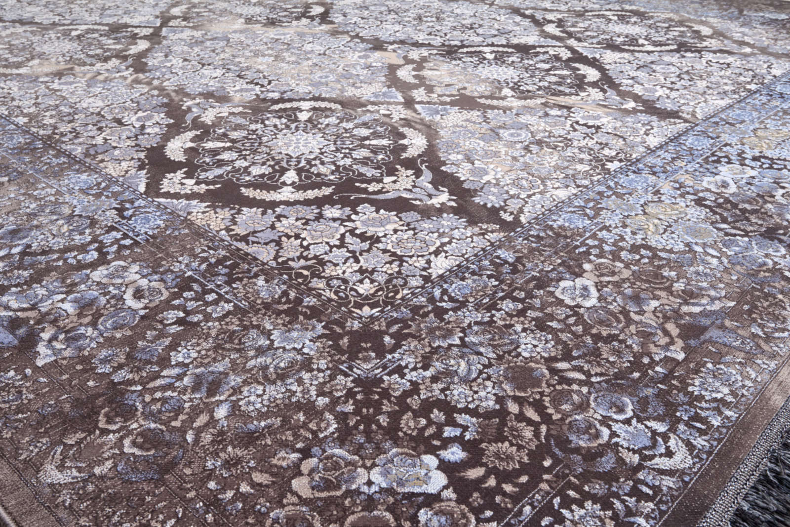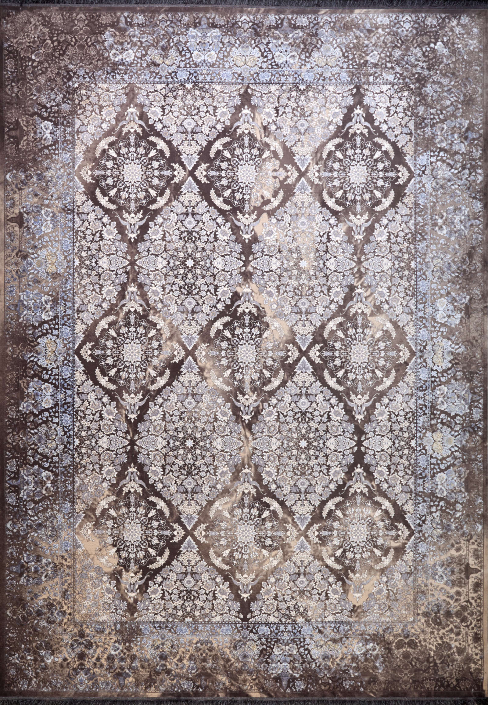 Узор ковра напоминает тончайшее кружево, в котором каждая линия и завиток складываются в гармоничный орнамент. Он создаёт ощущение изысканности и торжественной красоты, придавая интерьеру благородный и утончённый характер.