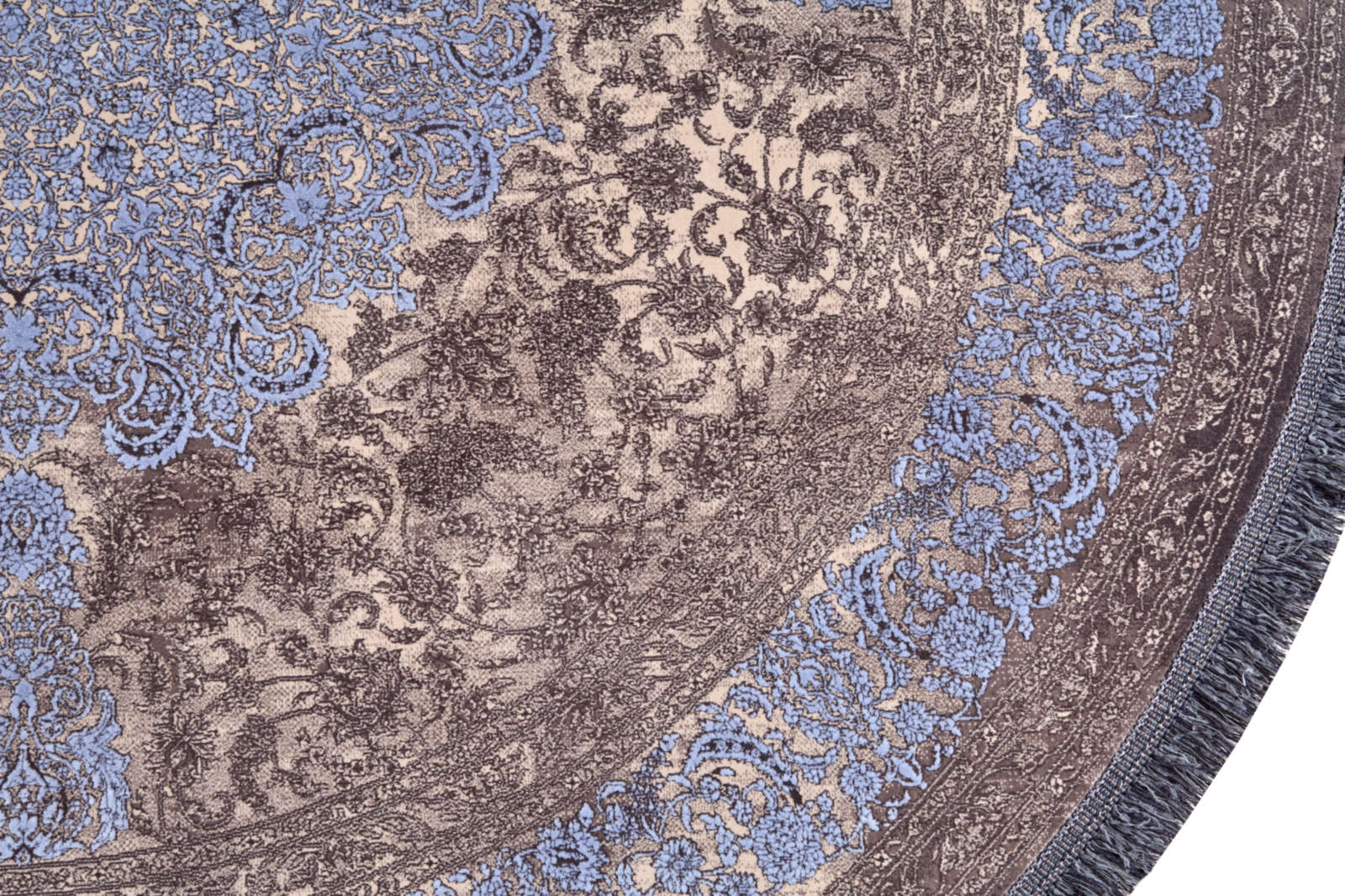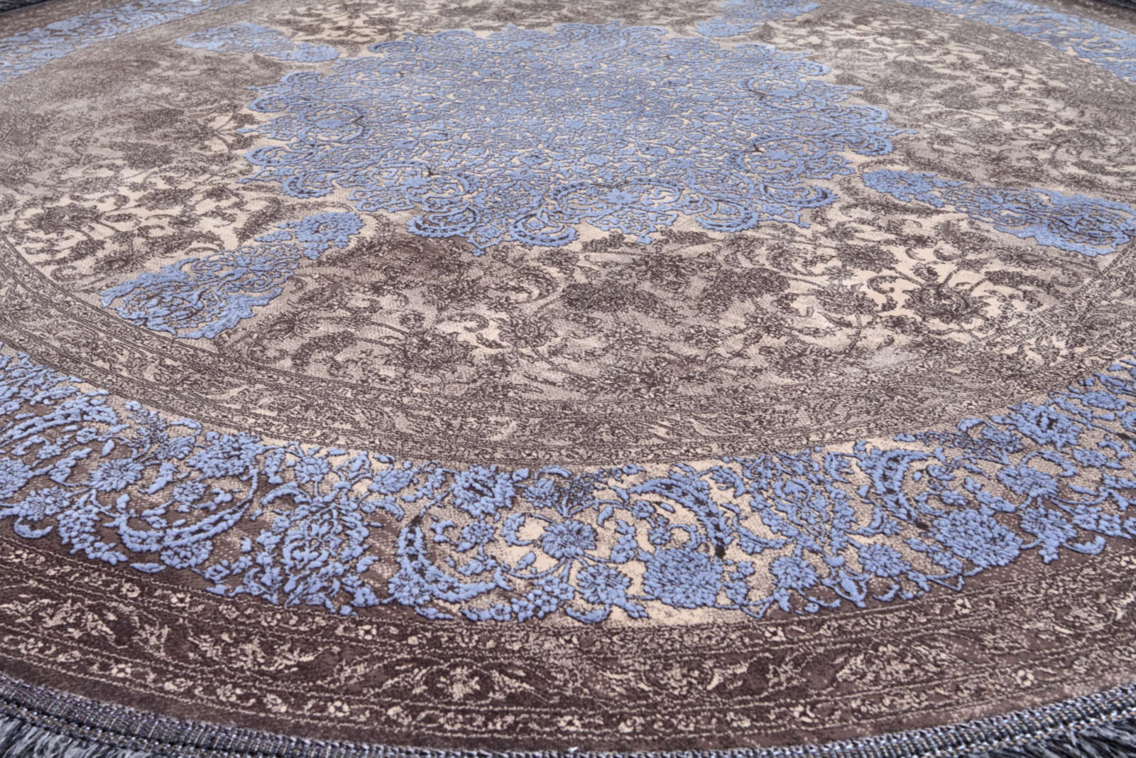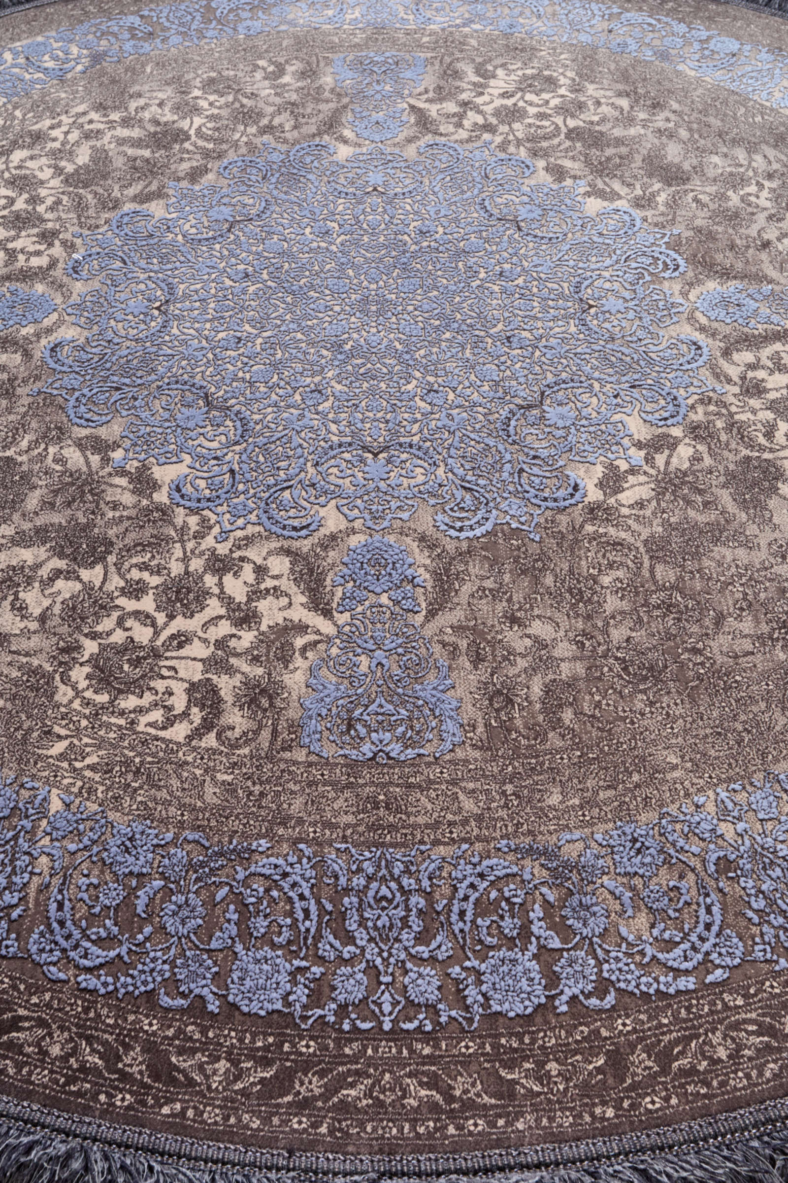 Круглый ковёр с утончённым орнаментом в сине-коричневой гамме напоминает восточную медальонную мозаичность. Его центр притягивает взгляд, а изящные узоры создают ощущение гармонии и завершённости. Такой ковёр добавит интерьеру утончённости и благородного тепла.