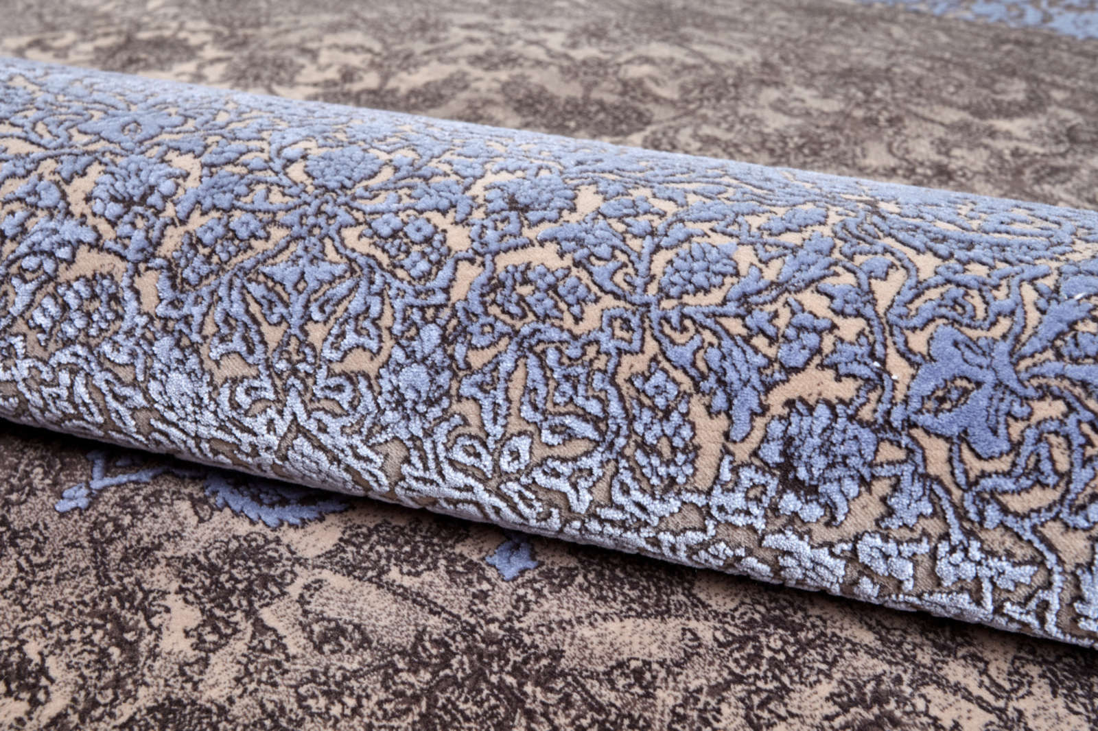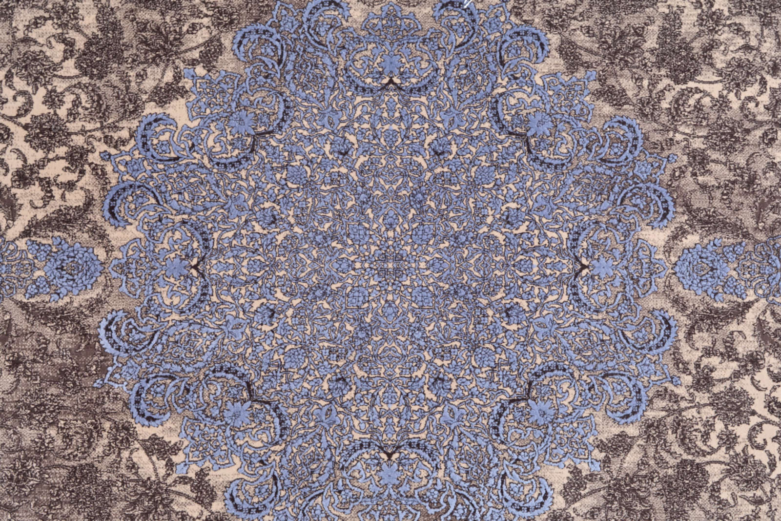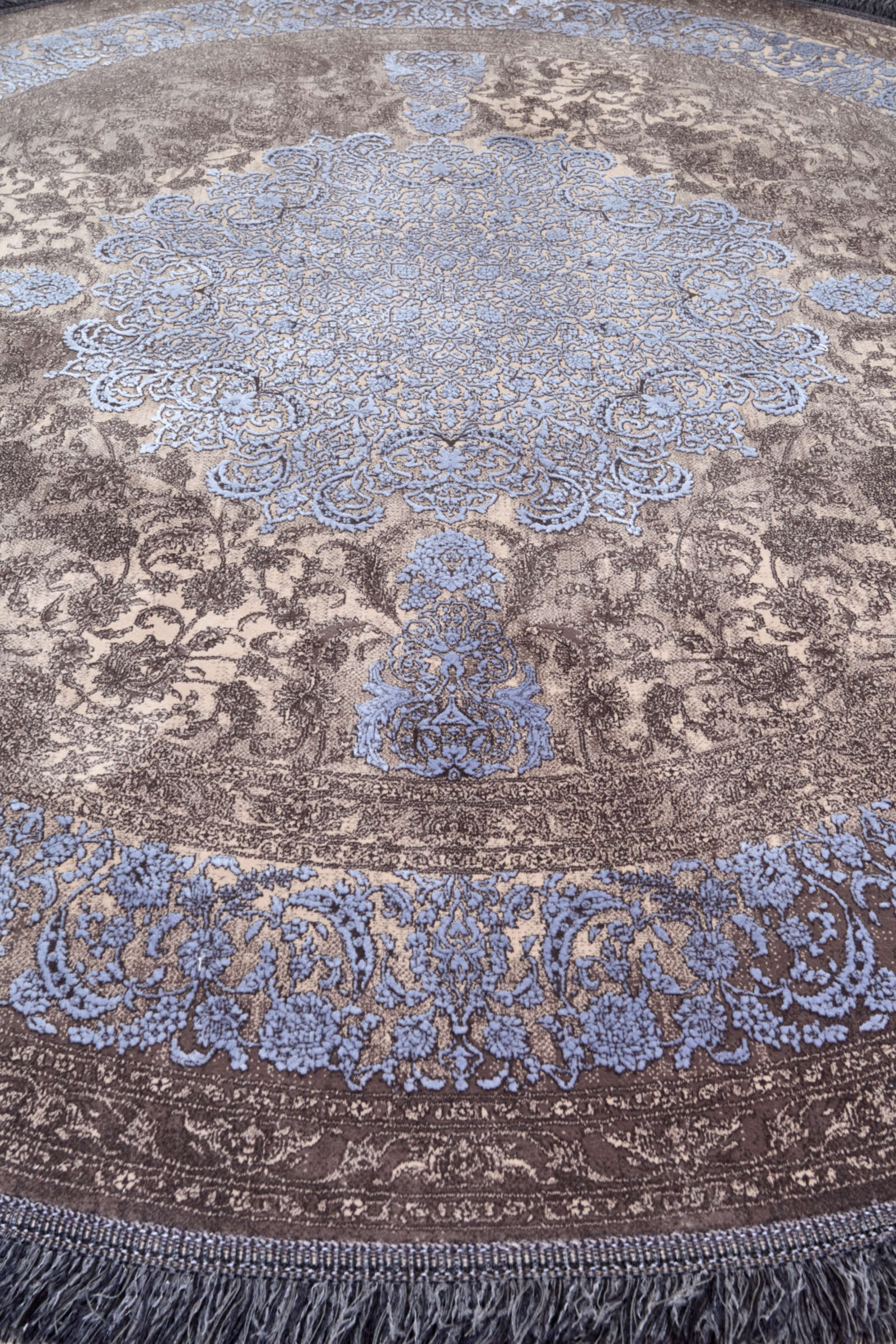 Этот круглый ковёр с медальоном в центре и тонким орнаментом в сине-коричневой гамме напоминает витраж, в котором переплетаются свет и тень. Коричневый фон создаёт глубину, а холодные голубые акценты добавляют живости и лёгкости композиции. В его узорах угадывается ритм восточного сада: плавные линии словно ветви, образующие естественный орнамент, а центр напоминает тихий водоём, отражающий небо. Такой ковёр подойдёт для классического стиля, где важны симметрия и элегантность, а также для интерьеров в духе нео-востока или эклектики, где ценятся декоративные детали и игра контрастов. В современной минималистичной обстановке он станет выразительным акцентом, добавляющим тепла и фактуры.
