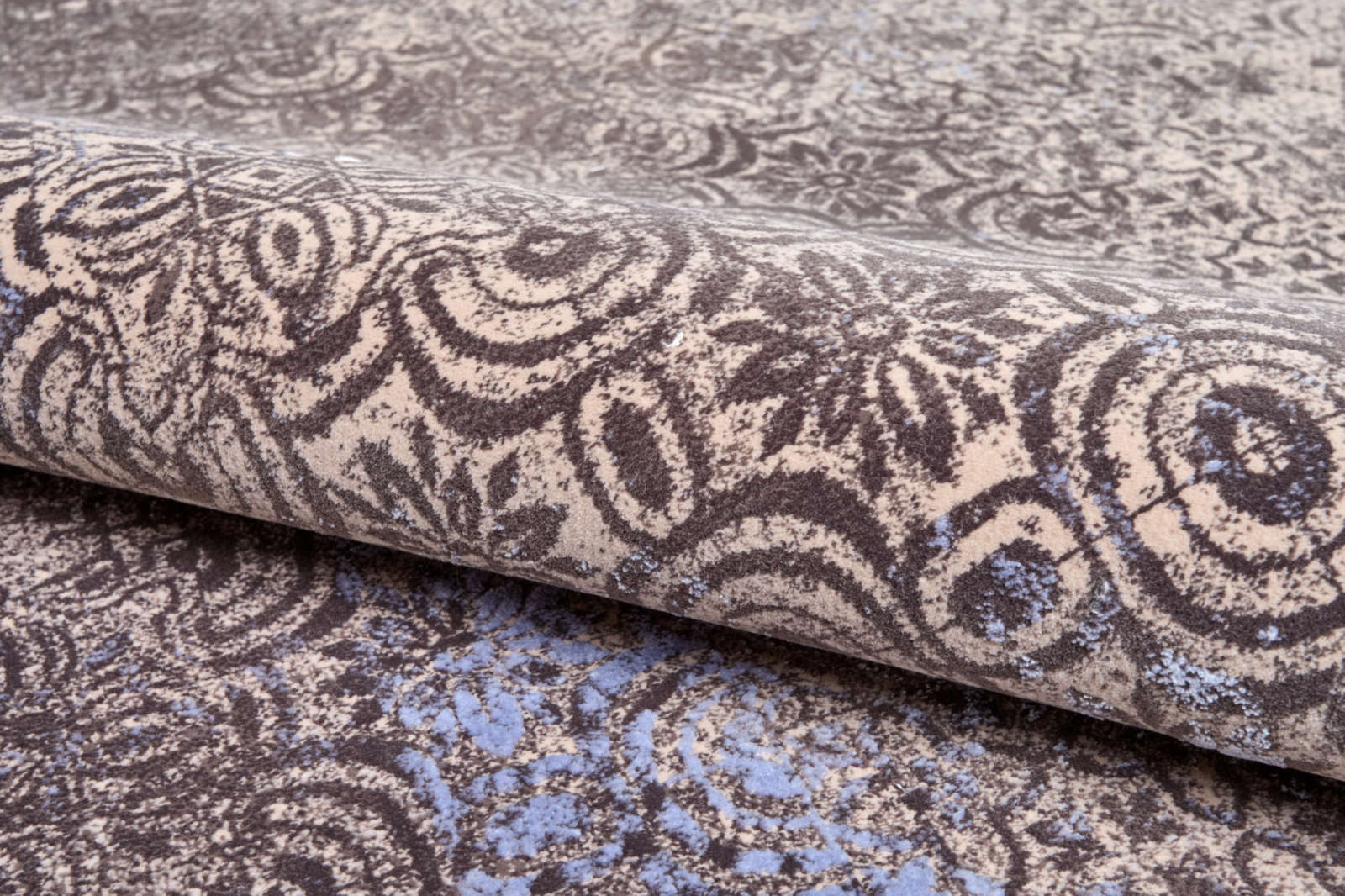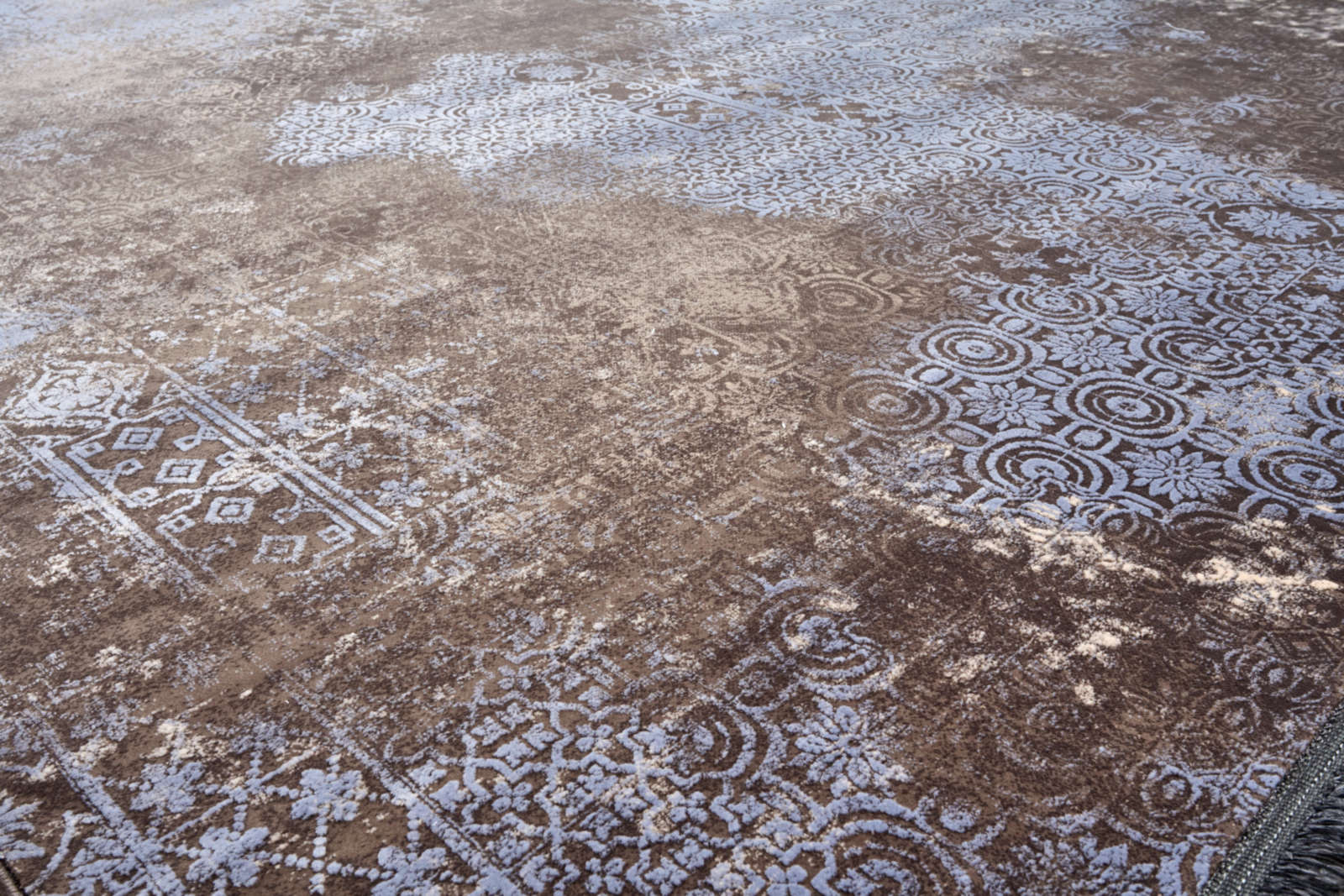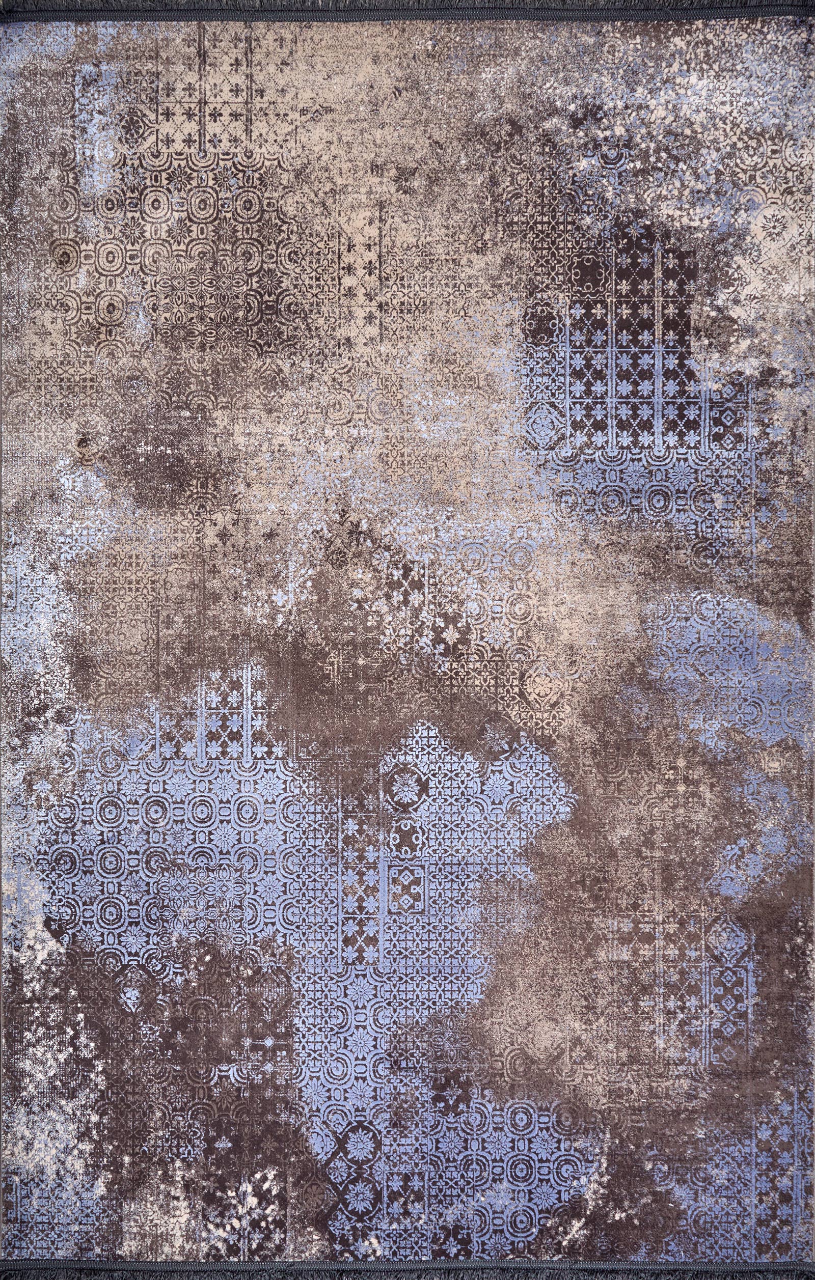Этот ковёр напоминает стену древнего храма, где под слоями вековой пыли ещё различимы замысловатые орнаменты. Сине-серые узоры проступают из глубины коричневого и песочного фона, как тени мозаик, сохранивших дыхание ушедших эпох. Он словно собрал в себе геометрию Востока и обветренную строгость старинных фасадов, где каждая линия несёт отпечаток времени. В его рисунке угадываются звёздные созвездия, лабиринты, дорожки к тайнам, давно забытым людьми. Этот ковёр не просто часть интерьера, а метафора вечности: он связывает дом с древними городами, которые исчезли, но не канули в небытие. Его цветовая палитра — это диалог земли и неба, где мягкий коричневый хранит тепло камня, а холодный синий напоминает о прозрачности воздуха и глубине сумерек. Такой ковёр создаёт атмосферу, в которой современность переплетается с древностью, а пространство обретает скрытую память.