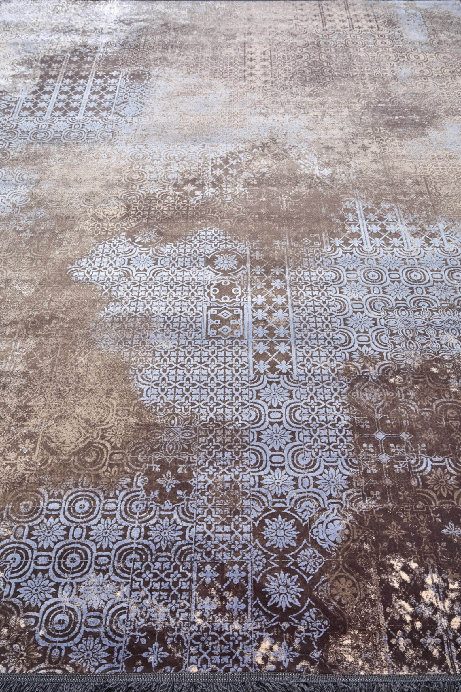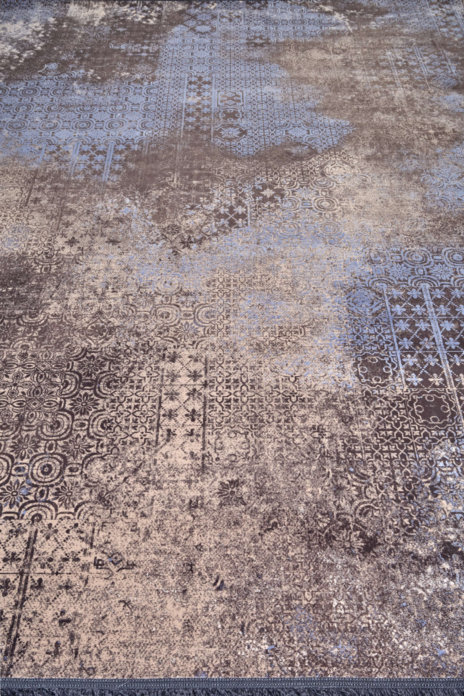 Этот ковёр будто фрагмент древних мозаик, скрытых под слоем времени. Сине-серые узоры проступают сквозь туман коричневых и песочных оттенков, словно память о городах, растворившихся в пыли веков, но оставивших свой орнамент на дыхании земли.