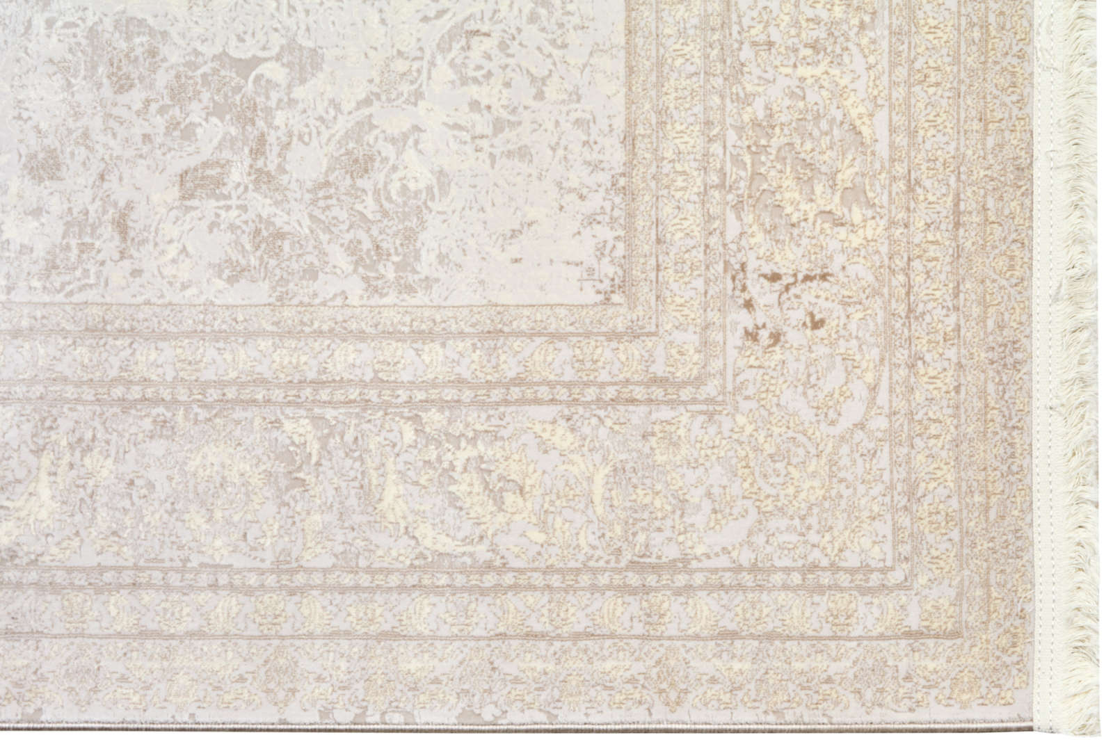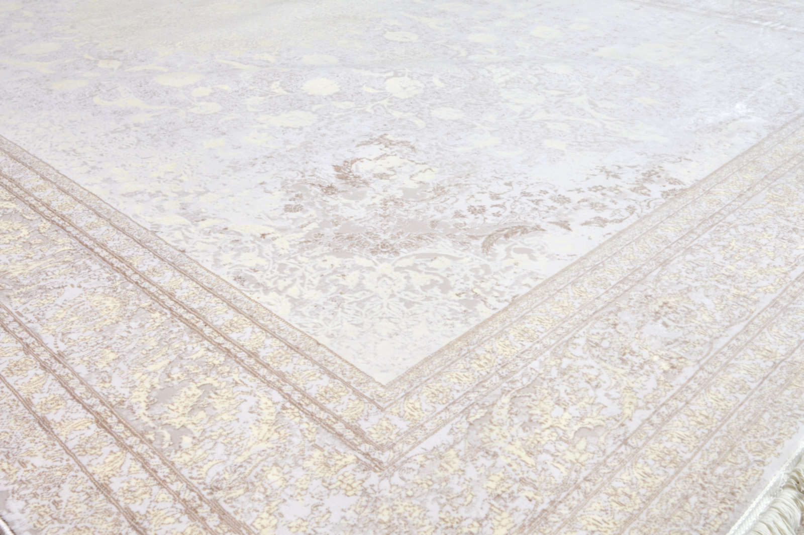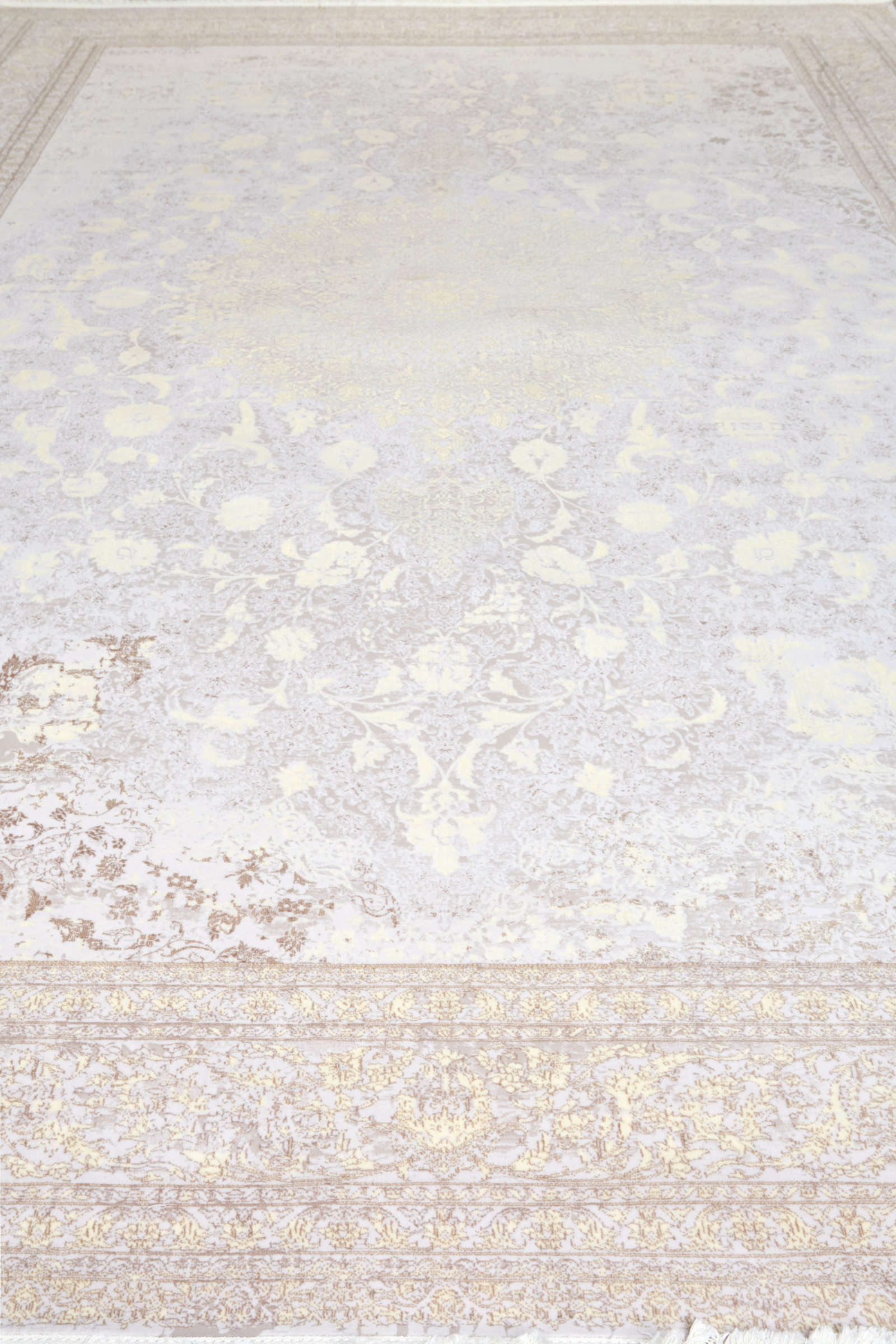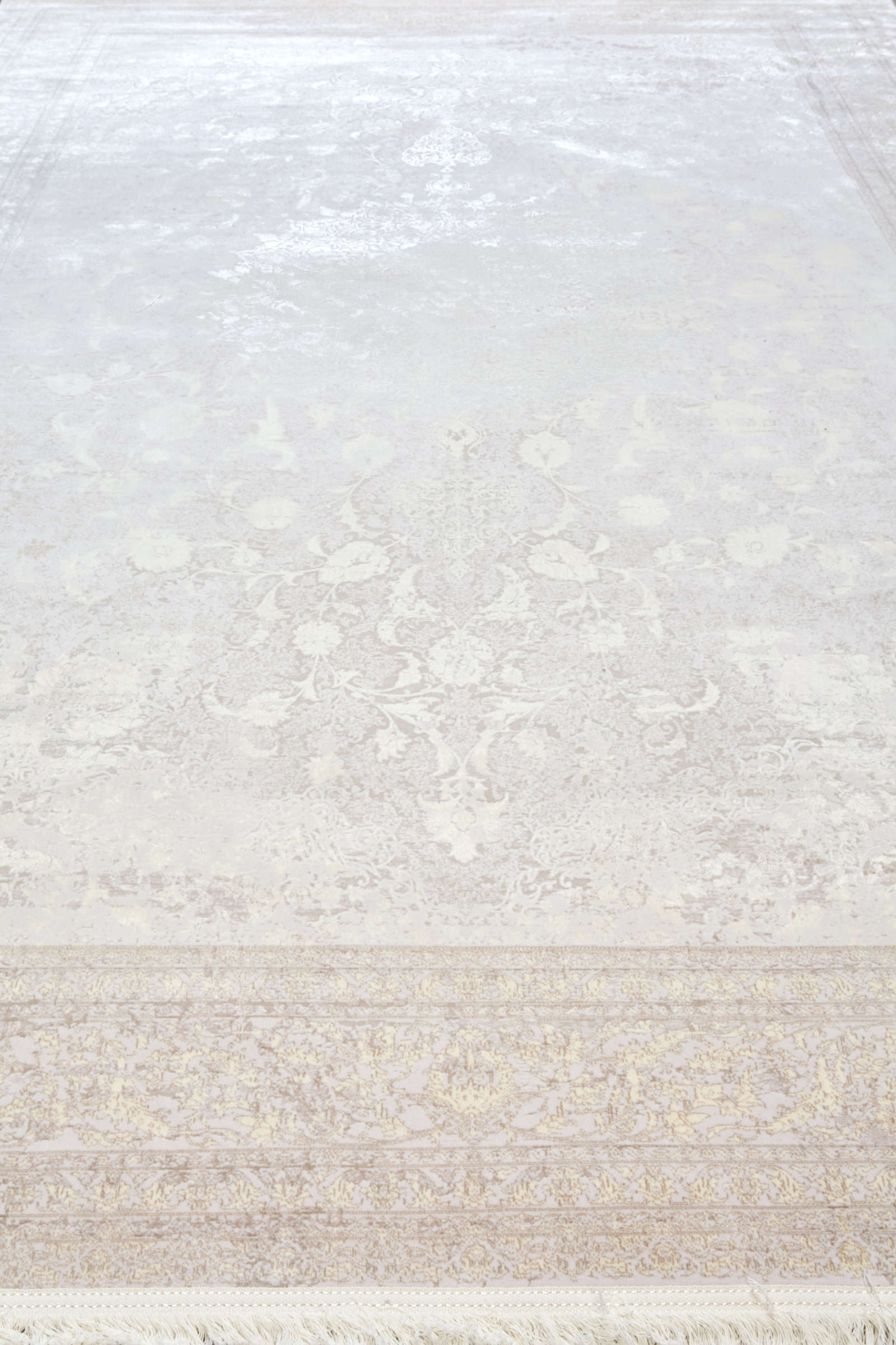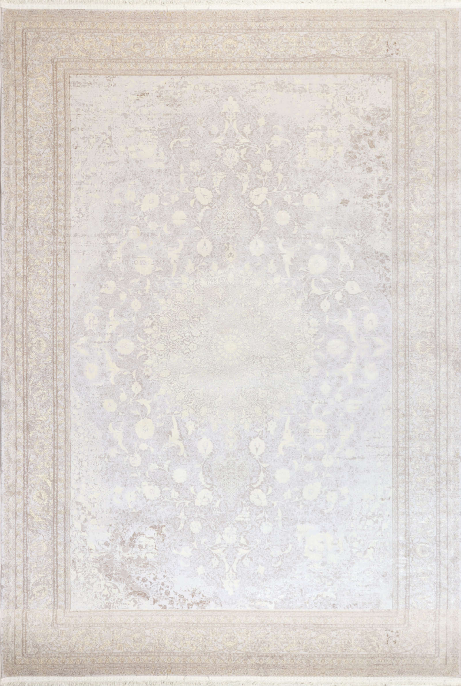 Светлый ковёр с тонким узором и эффектом «призрачного» рисунка. Мягкие линии создают едва заметный орнамент, будто растворяющийся в фоне. Подойдёт для минималистичных и светлых интерьеров.
