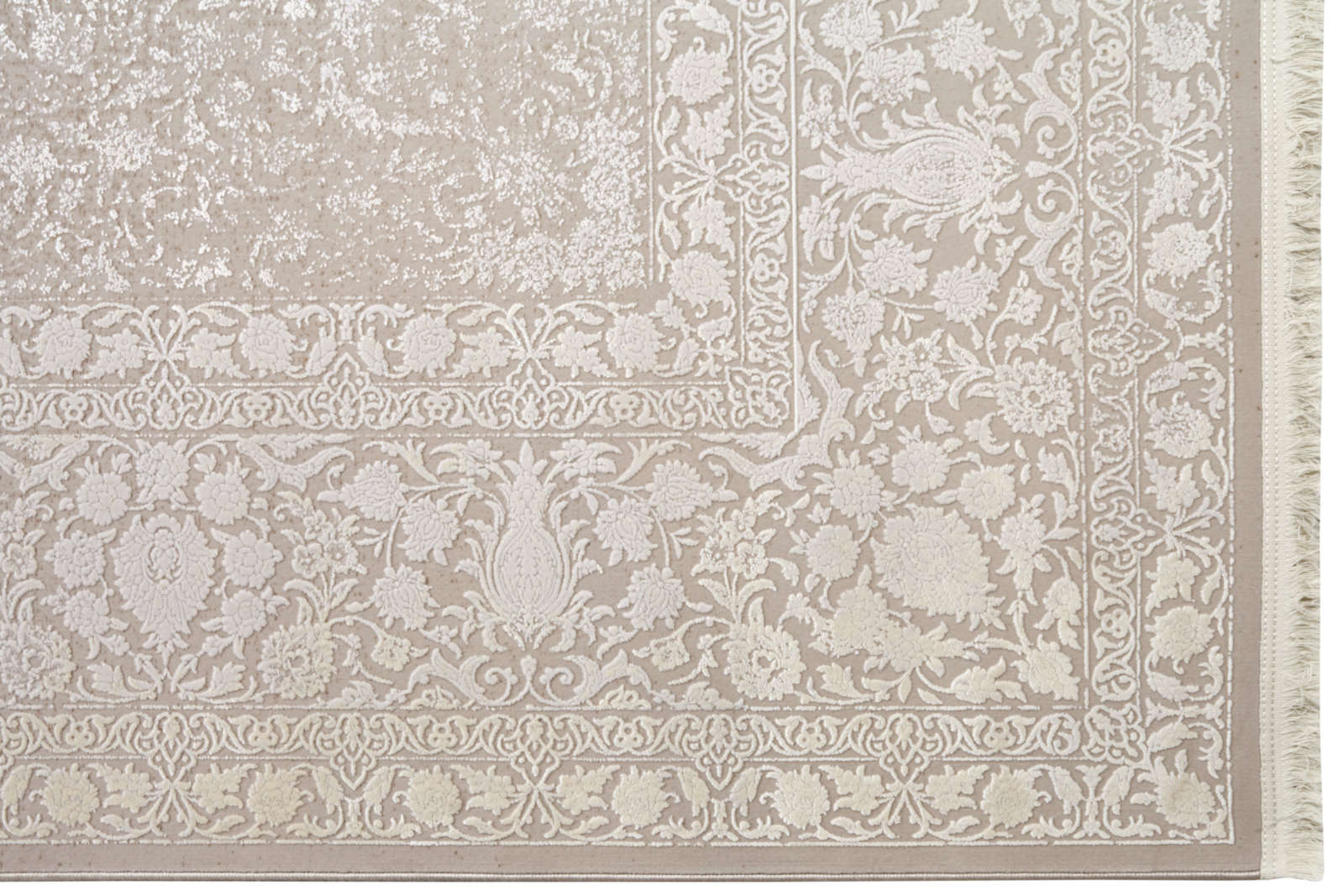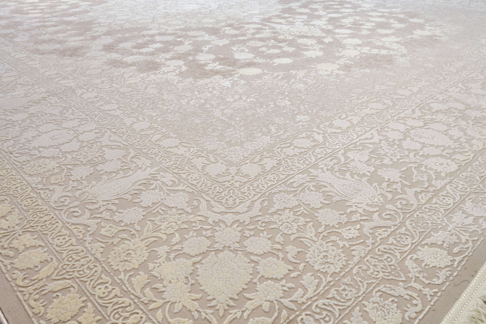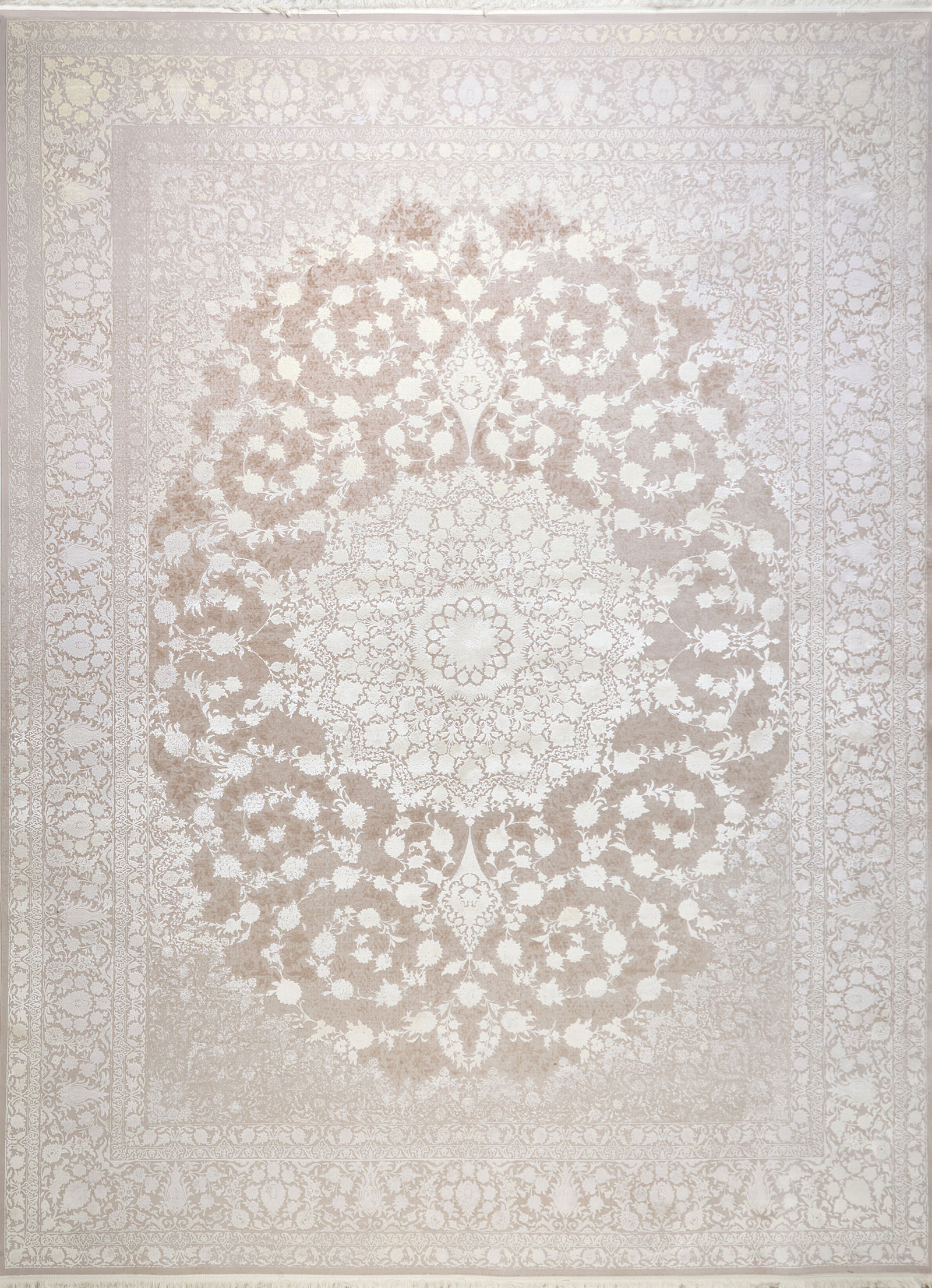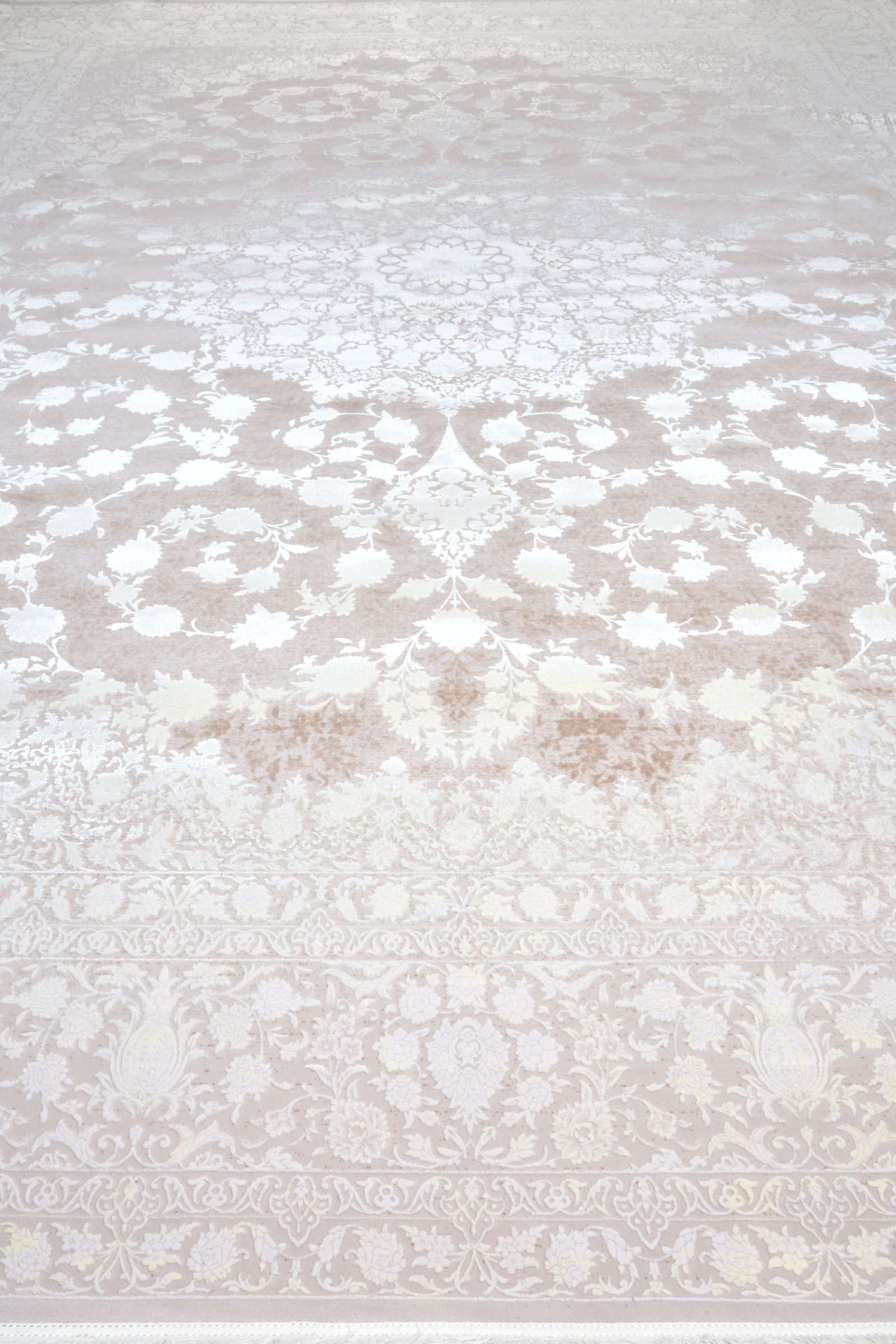 Ковёр с эффектом лёгкой дымки: его орнамент едва проступает сквозь фон, будто отражение или тень. Он создаёт пространство тишины и воздуха, где царят минимализм и утончённость.