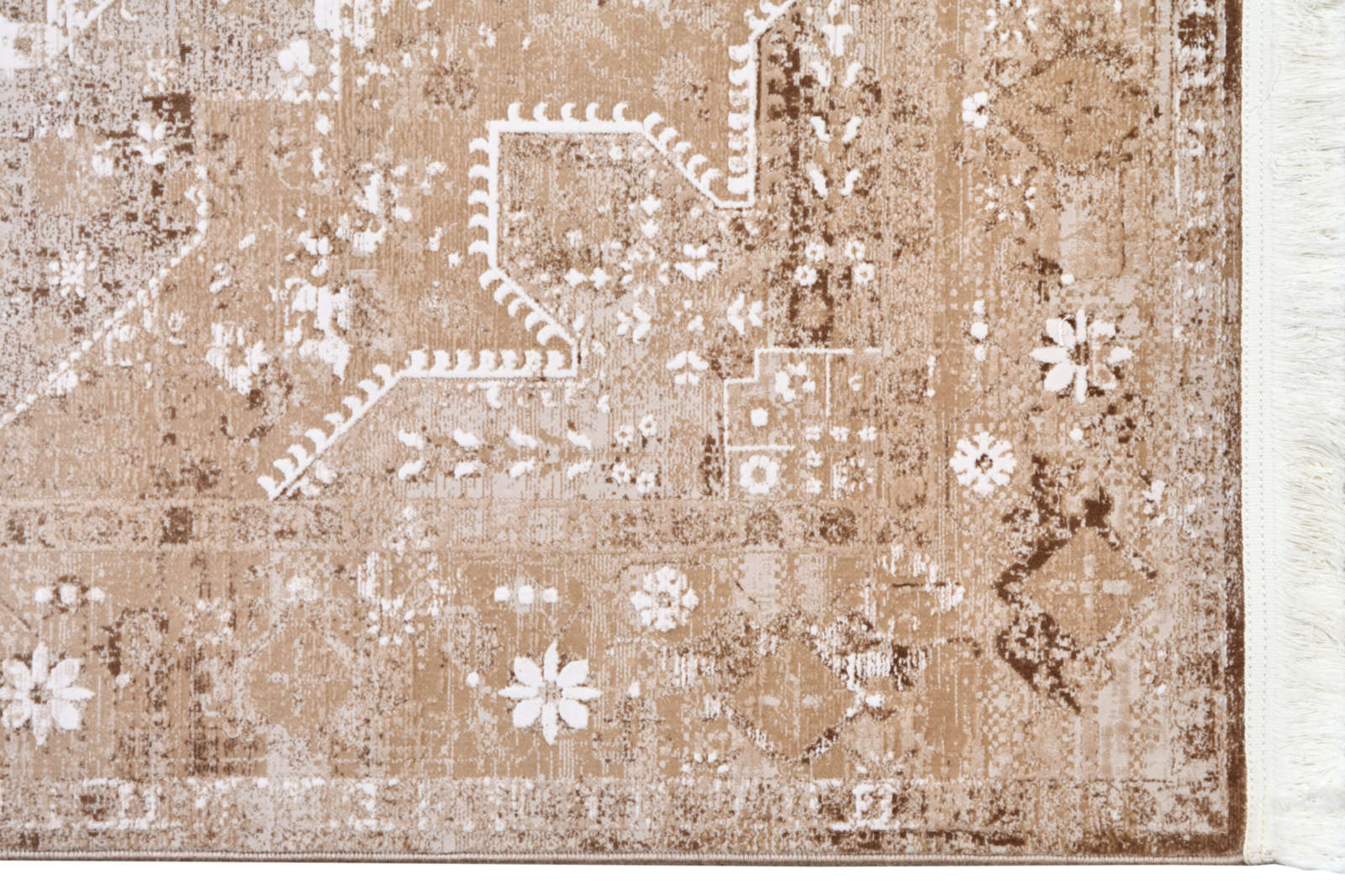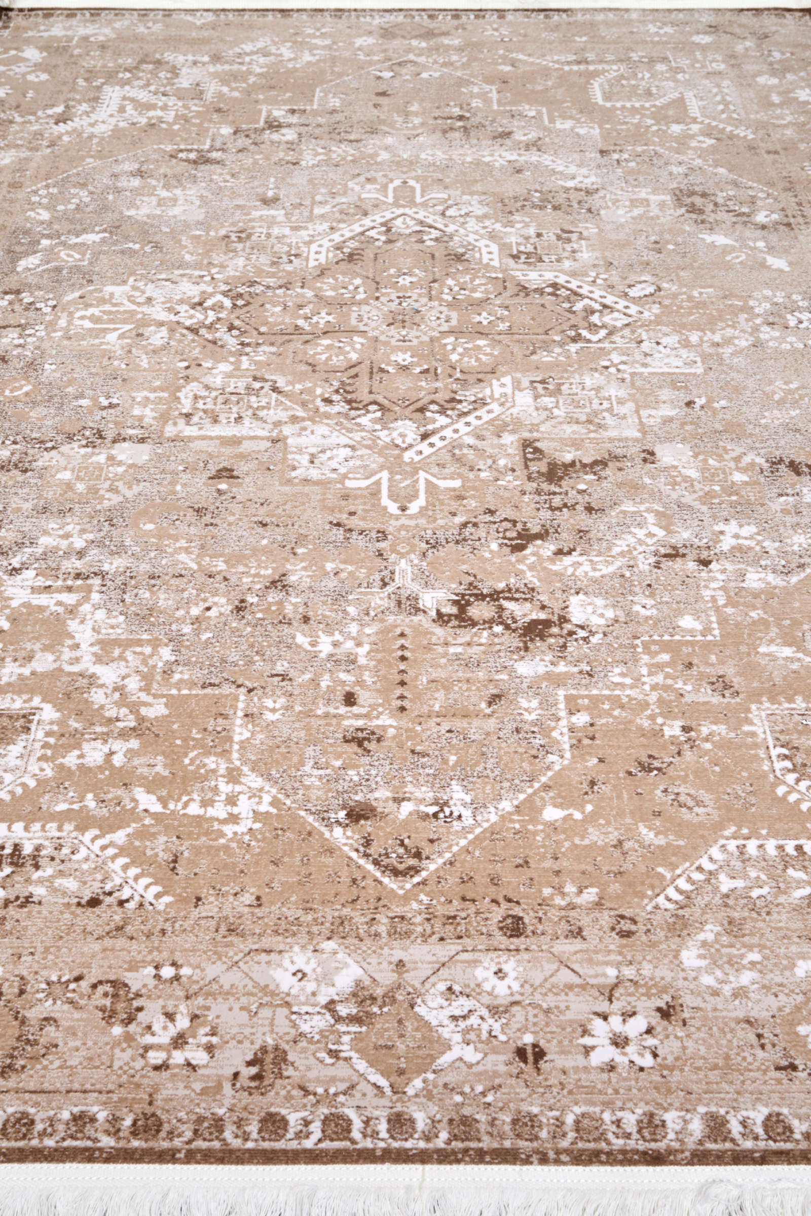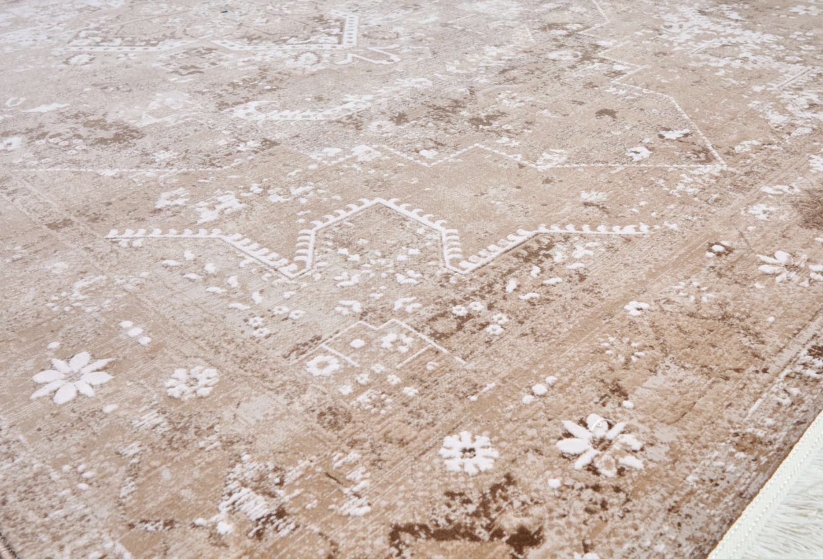Этот ковёр будто соткан из утреннего света, прошедшего сквозь тонкое кружево. Его орнаментальная композиция в светло-бежевых и кофейных оттенках создаёт атмосферу спокойствия и изысканной простоты. Узор выглядит слегка выцветшим, словно он несёт на себе дыхание времени и следы старинной истории. Такой ковёр идеально подойдёт для интерьеров, где ценят утончённость и мягкость: в классической спальне, где важна гармония и светлая палитра, или в просторной гостиной, оформленной в спокойных тонах. Его приглушённые оттенки создают фон для ярких деталей и делают обстановку более воздушной и сбалансированной.