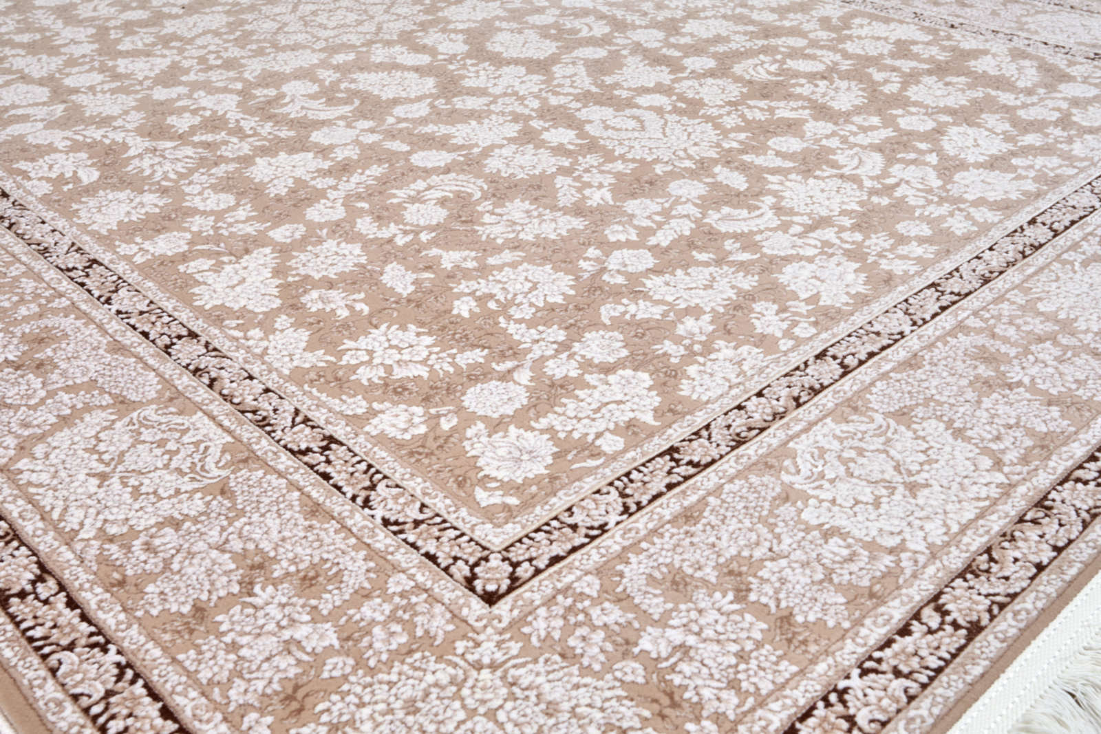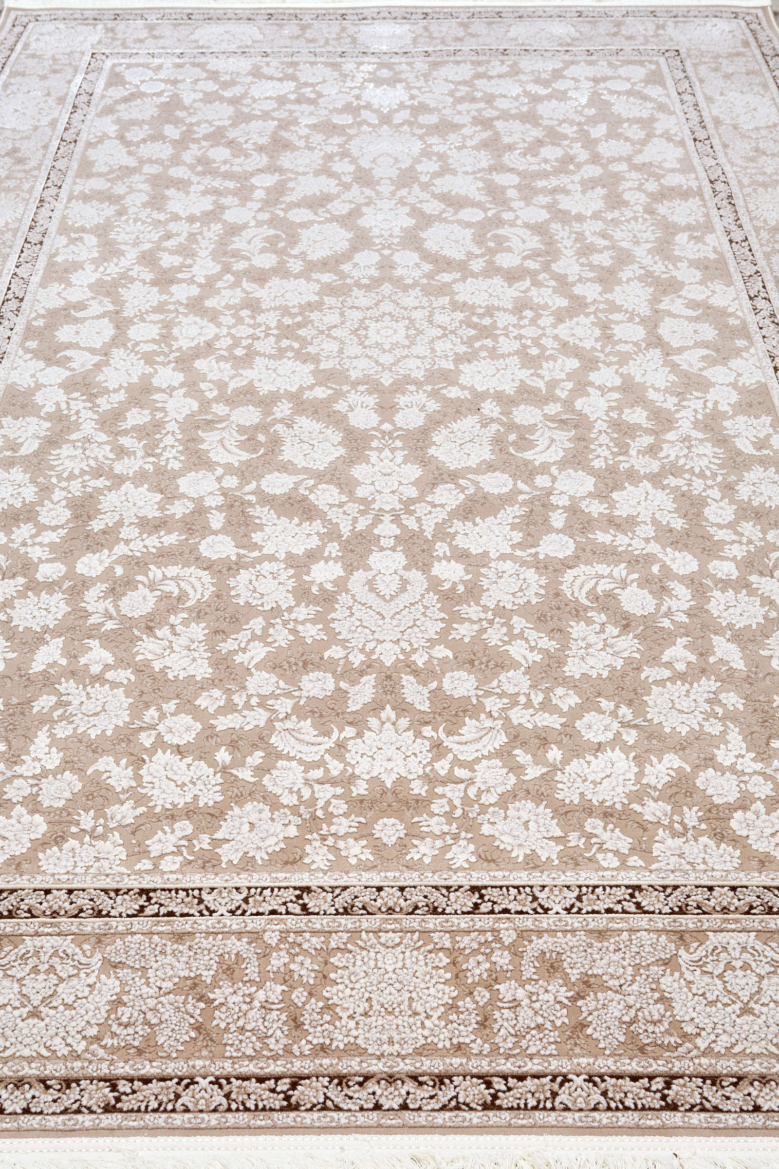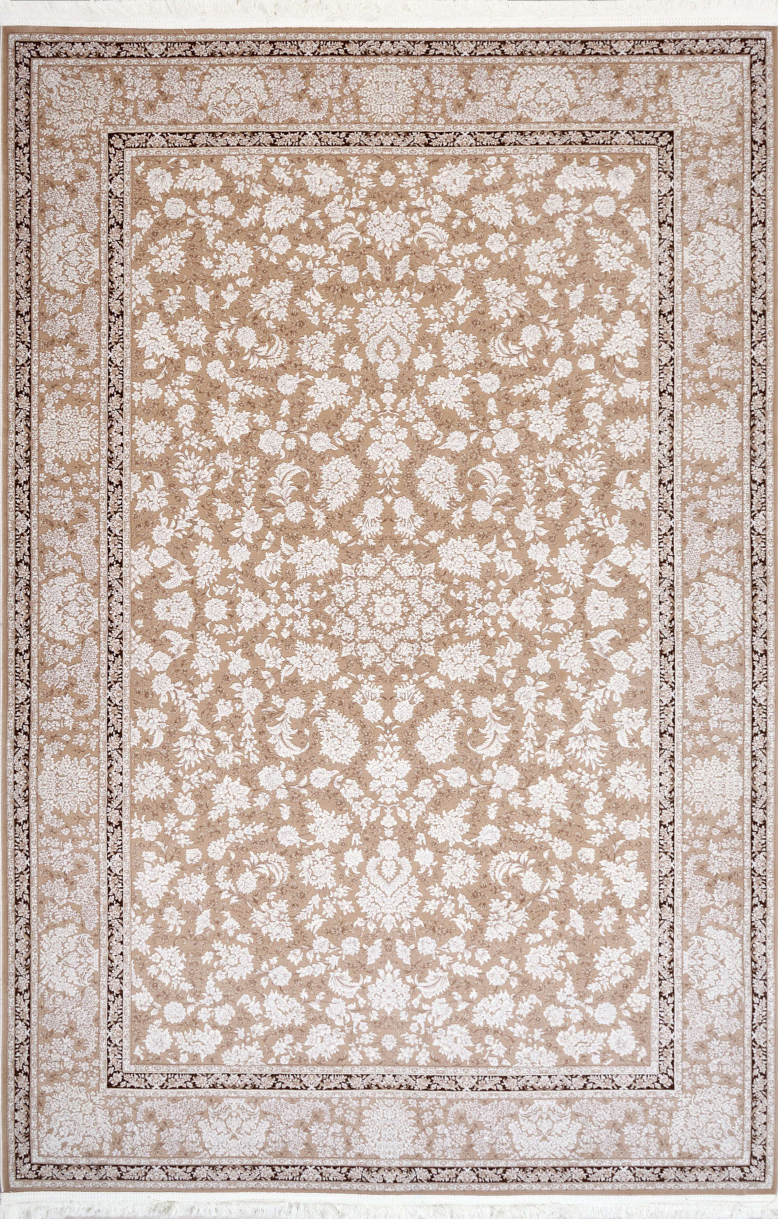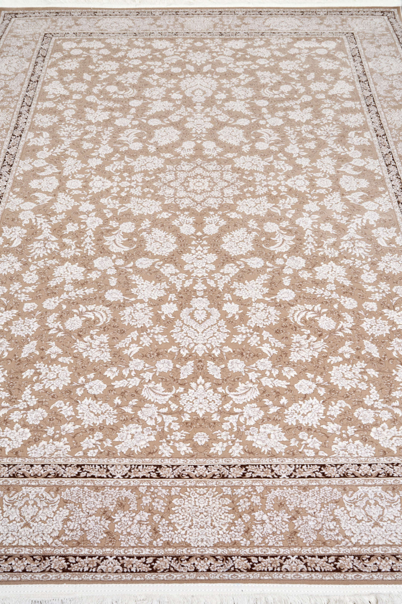 Этот ковёр словно соткан из солнечных лучей, прошедших сквозь тонкую ткань времени. Бежево-белый орнамент напоминает нежную акварель, где каждый цветок и лист словно оживают на светлом фоне. Его узор изыскан, но не перегружен — он создаёт атмосферу спокойствия и уюта, в которой легко дышать. Такой ковёр прекрасно подойдёт для классических и современных интерьеров, станет гармоничным фоном для мебели из дерева, мягкой текстуры текстиля и светлых стен. Он привнесёт в пространство ощущение утончённой элегантности и мягкого тепла, словно тихое присутствие природы в доме. В нём нет громкой торжественности — только нежная поэзия линий и оттенков.