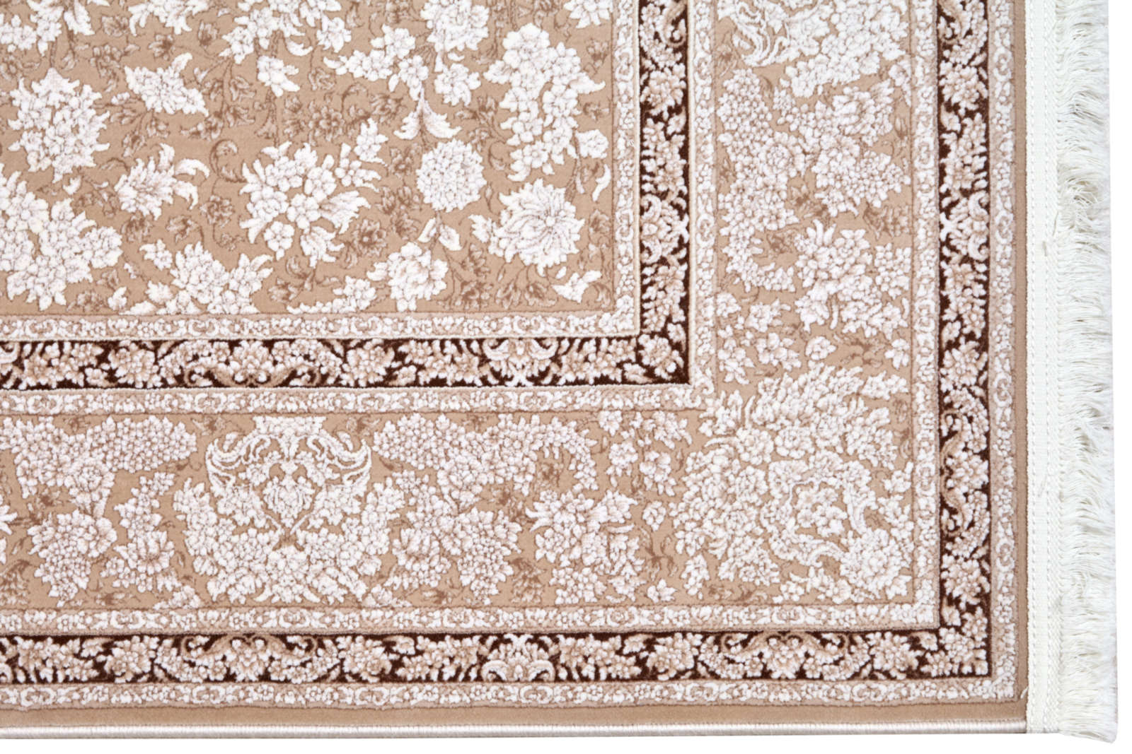 Светлый ковёр с утончённым цветочным орнаментом напоминает лёгкий рисунок на старинном пергаменте. Его бежево-белая гамма создаёт ощущение воздушности и тепла, а плавные линии узора добавляют интерьеру гармонии.