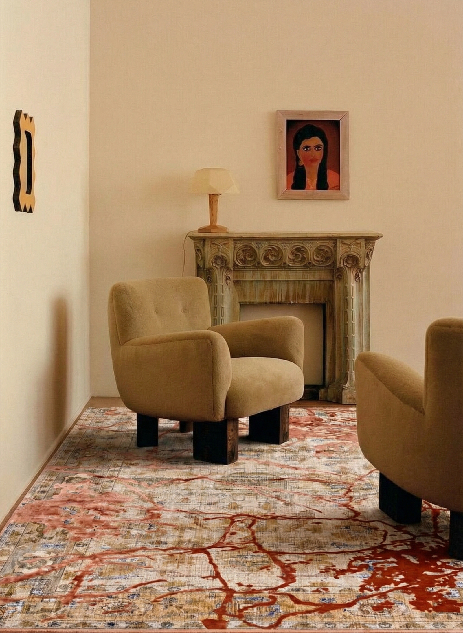 Ковёр с бежево-коричневыми оттенками напоминает старую стену, покрытую следами времени. Его тёплая палитра создаёт атмосферу уюта и камерности, а абстрактный рисунок добавляет глубину и выразительность интерьеру.