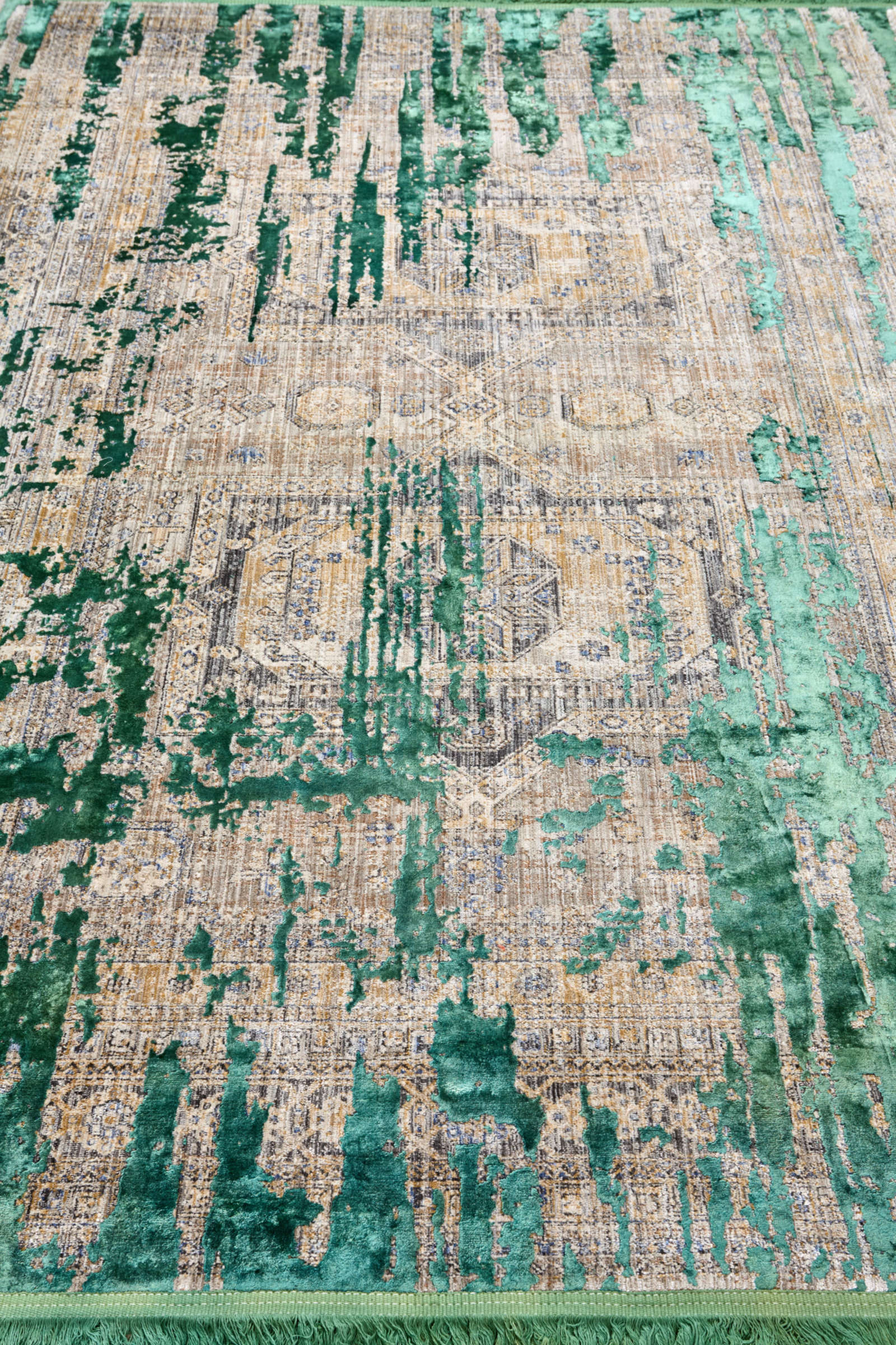 Этот ковёр словно карта забытого города, где стены дворцов покрылись мхом, а каменные узоры проступают сквозь зелёные потёки времени. Его рисунок соединяет строгость восточного орнамента и дикость природы, которая берёт своё. Яркие изумрудные линии напоминают живые потоки, прорезающие поверхность, и создают эффект неожиданного оживления классической основы. Такой ковёр можно рассматривать бесконечно, каждый раз находя в нём новые истории — то следы старинных узоров, то ритм современной абстракции. Он прекрасно впишется в интерьер, где ценят смелые решения и готовы играть на контрастах. Его зелёные штрихи будут особенно выразительны в пространстве со светлыми стенами и деревянной мебелью, создавая впечатление живого дыхания природы в доме. Этот ковёр станет не только украшением, но и художественным высказыванием о том, что вечное и мимолётное могут сосуществовать.