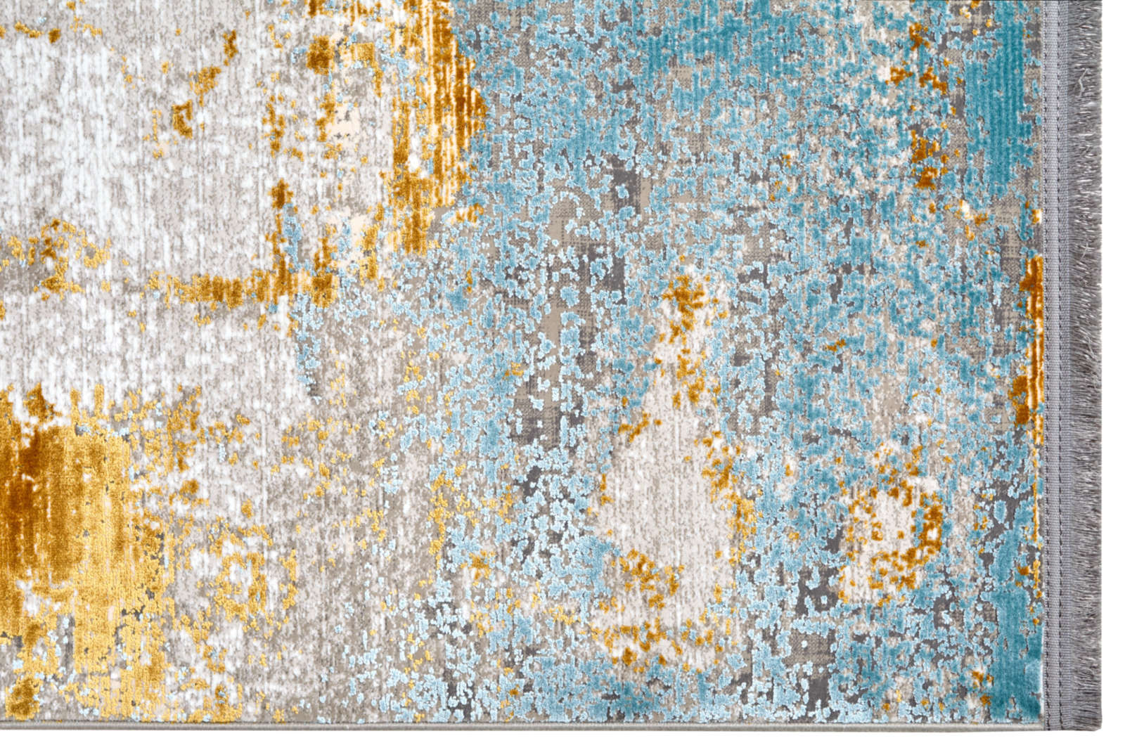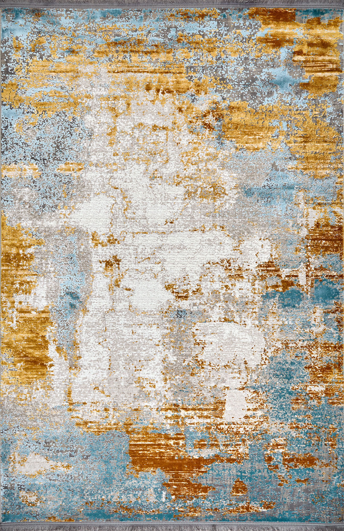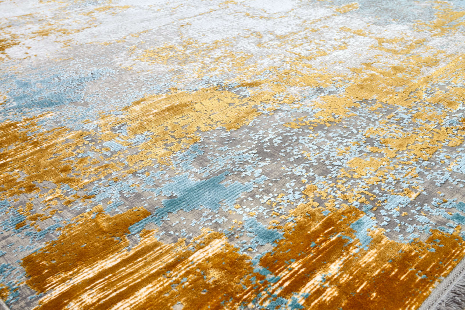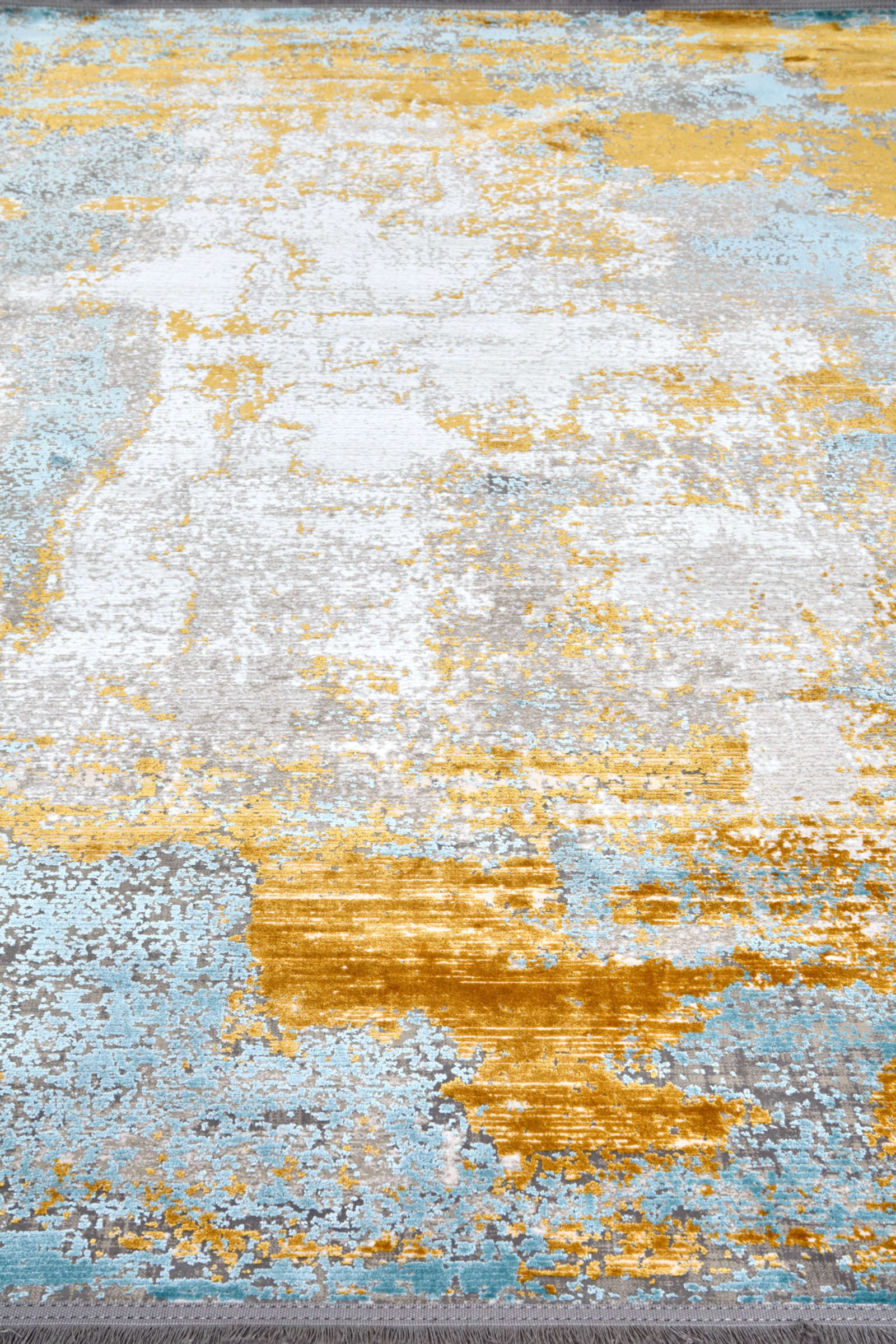 Этот ковёр напоминает абстрактное полотно, где мягкий серо-белый фон служит основой для выразительной игры цвета. Глубокие синие мазки придают композиции насыщенность и прохладу, а тёплые жёлтые вкрапления, будто солнечные лучи, оживляют её и наполняют энергией. Цвета распределены свободно, с эффектом мазков кисти, создающим ощущение движения и глубины.