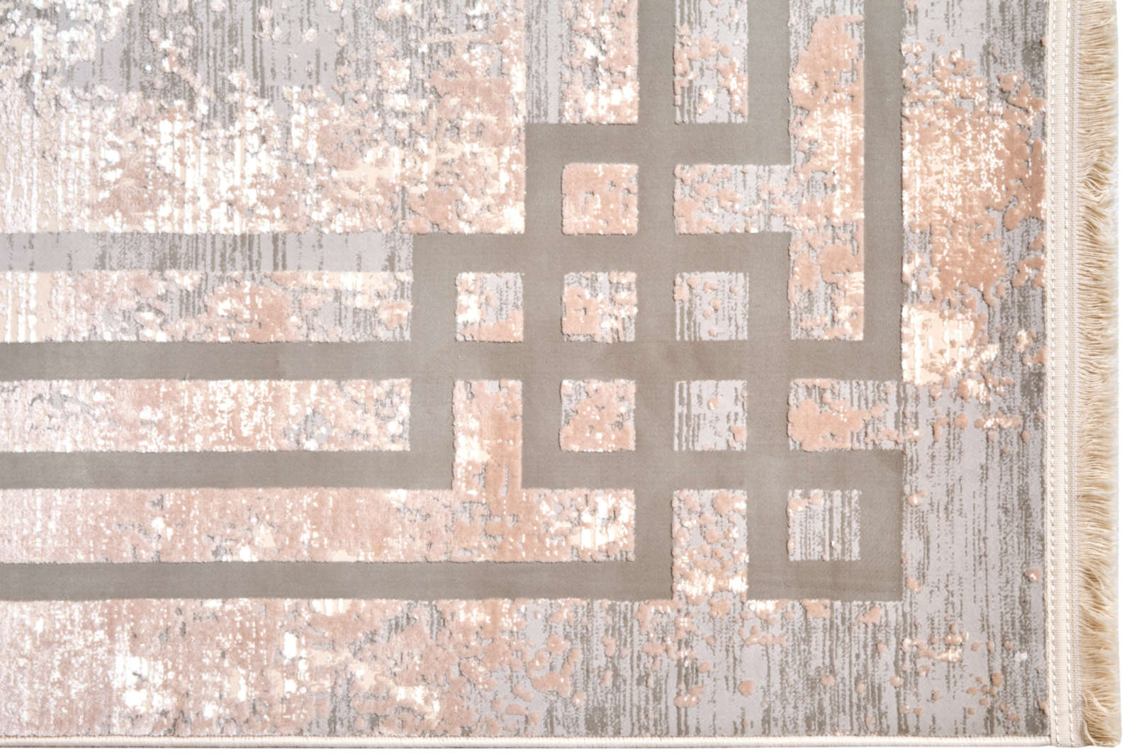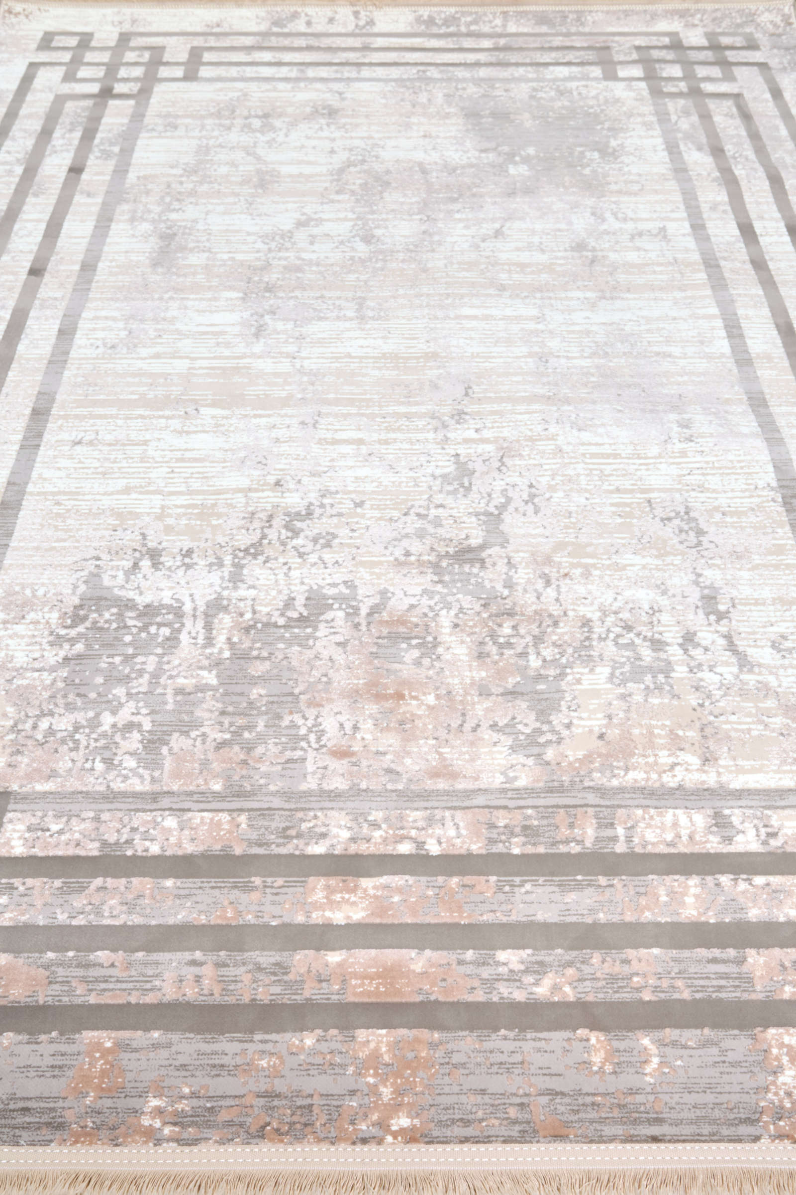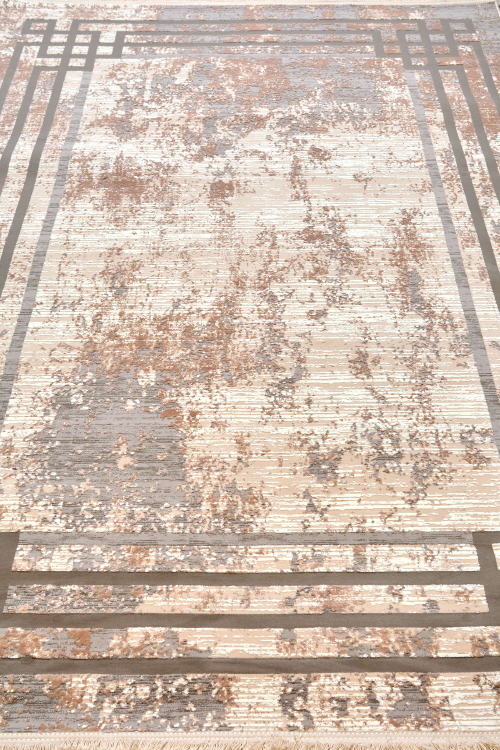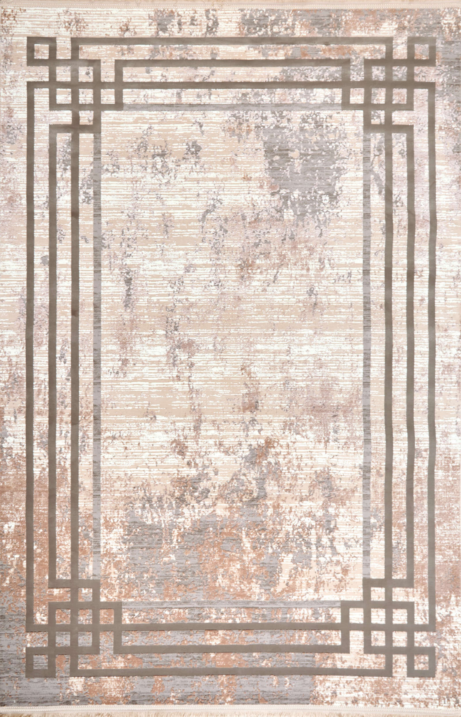 Этот ковёр — образец сдержанного графичного дизайна, в котором важна каждая линия. Нейтральная основа в тёпло-бежевой гамме напоминает текстуру старого холста или камня, а чёткий серый орнамент в виде рамки придаёт композиции структуру. Такой ковёр словно рисует пространство, подчёркивает симметрию и собирает интерьер. Сдержанный серый цвет узора делает акцент деликатным, но выразительным.