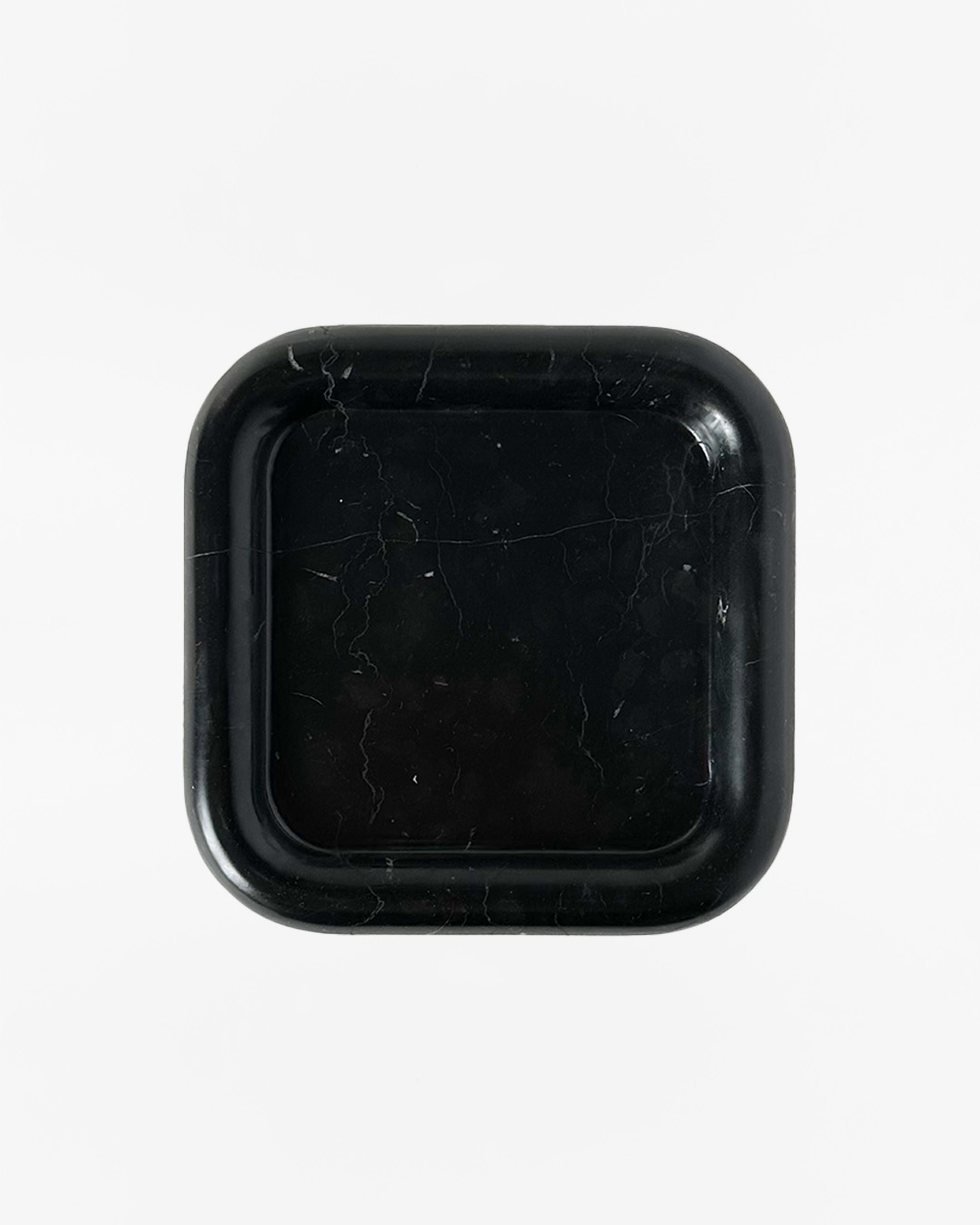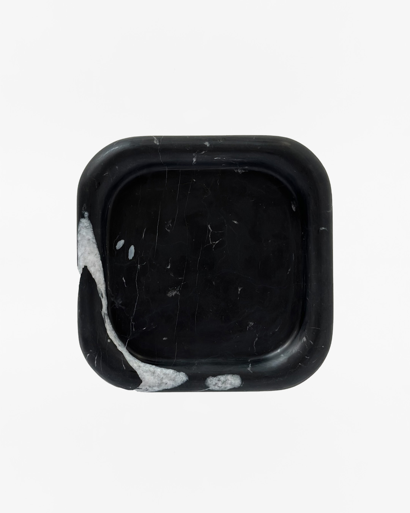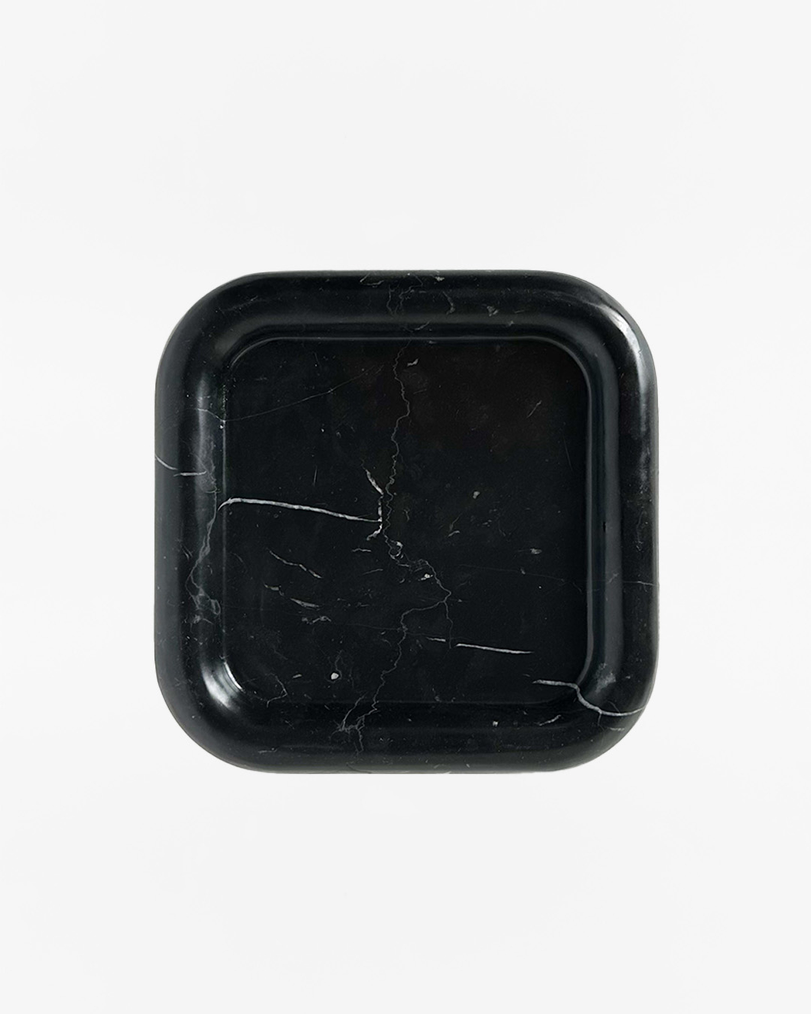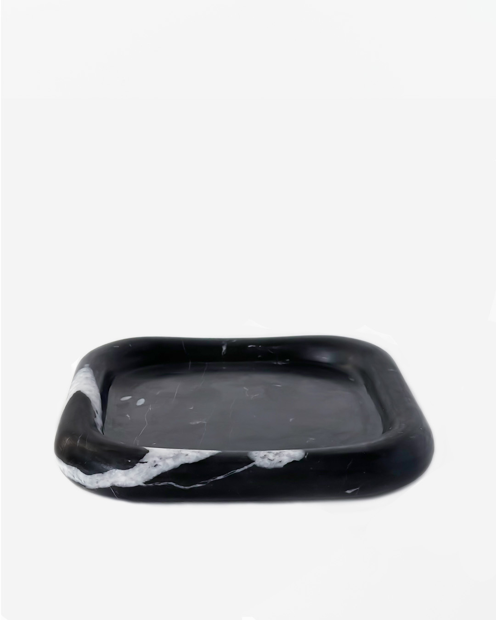 Поднос, выполненный из мрамора Nero Marquina — это предмет, в котором сила и элегантность встречаются в идеальном балансе. Его квадратная форма и мягко скруглённые линии создают ощущение скульптурной цельности, а глубокий чёрный цвет с естественными белыми прожилками придаёт предмету драматичность и утончённость.