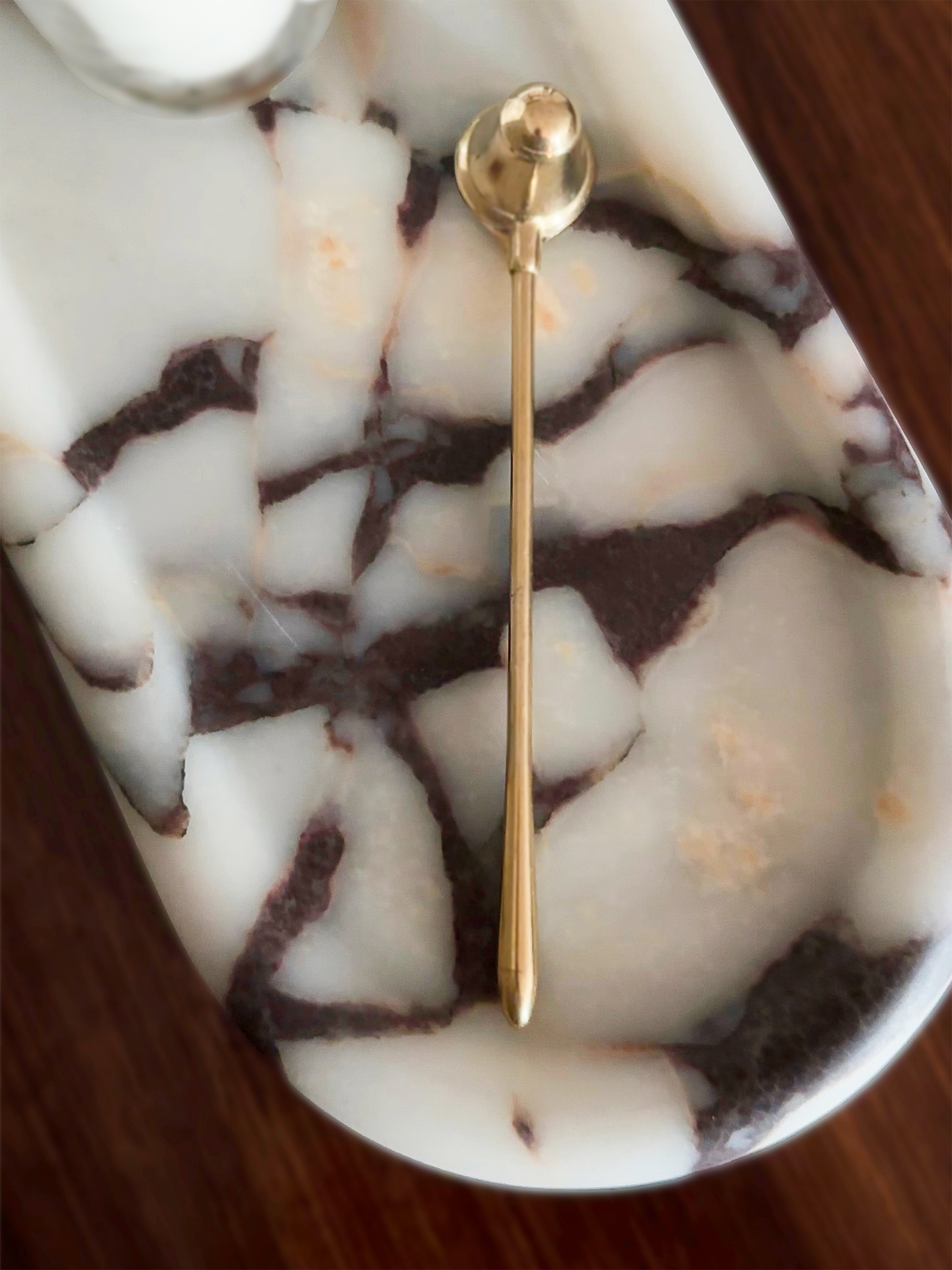 Поднос, выполненный из редкого мрамора Calacatta Viola, — это предмет, в котором сила природы соединяется с эстетикой современного минимализма. Уникальный рисунок камня с изящными фиолетово-бежевыми прожилками делает каждый поднос неповторимым. Скульптурная форма подчёркивает естественную пластику мрамора, а гладкая поверхность добавляет изысканности.