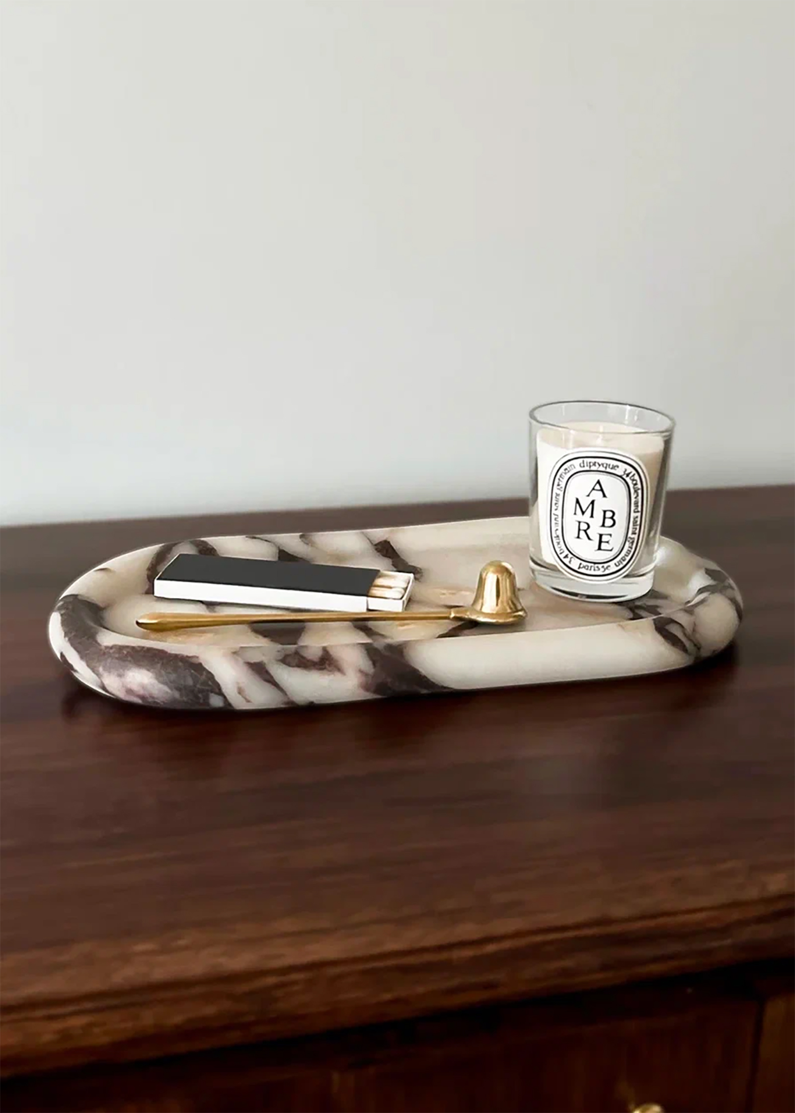 Поднос из мрамора Calacatta Viola — элегантный акцент, сочетающий природную выразительность и утончённую форму. Его мягкие овальные линии и глубокие фиолетовые прожилки превращают каждый экземпляр в уникальный арт-объект.