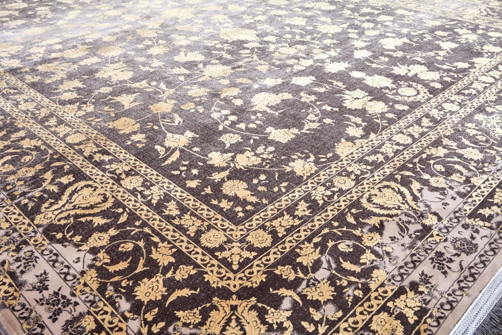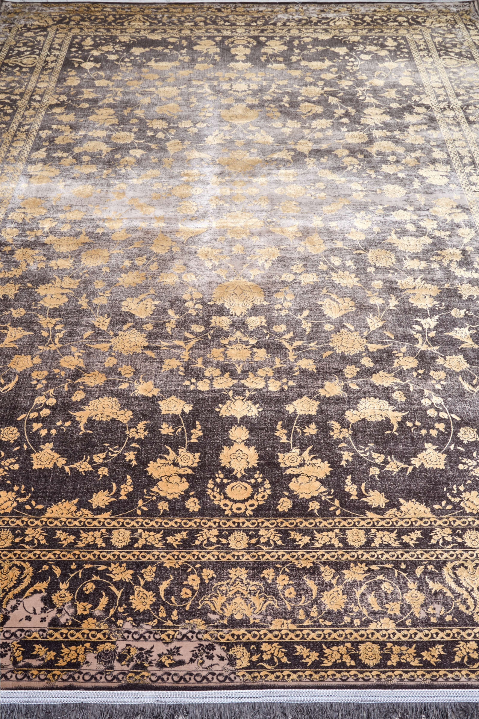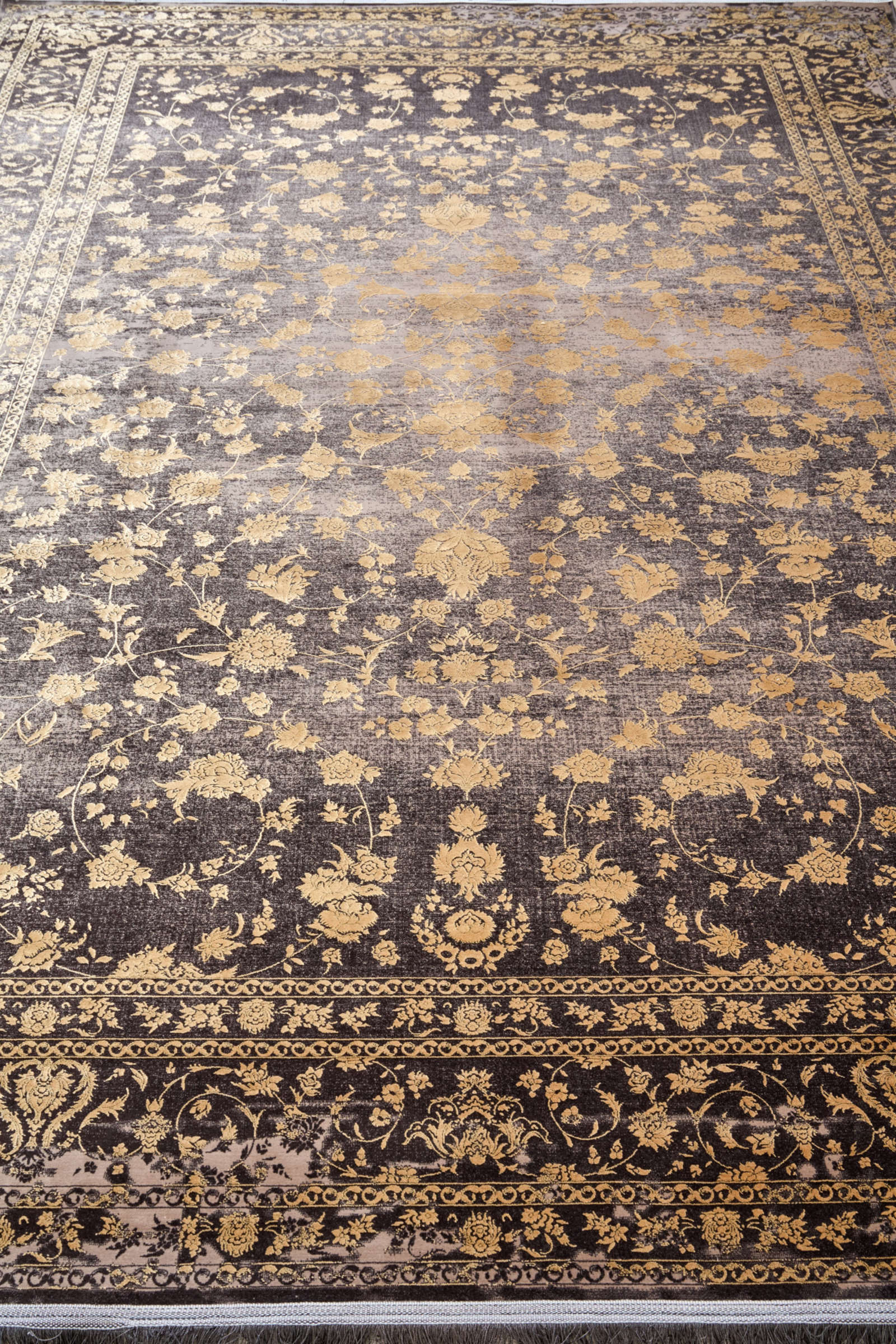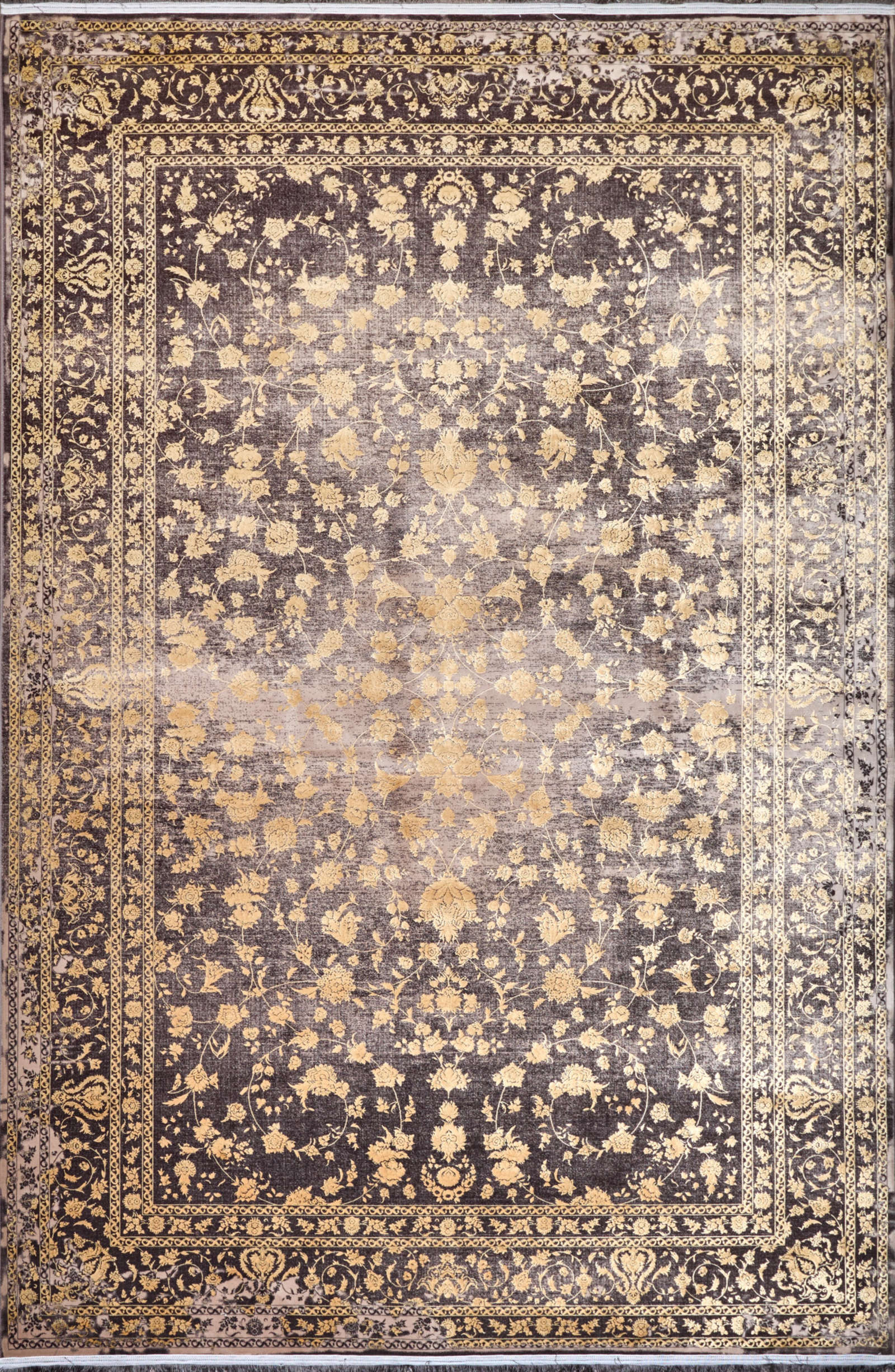 Ковёр с золотым цветочным узором на тёмном фоне напоминает старинный восточный текстиль. Эффект «выцветания» придаёт ему благородство. Подходит для классических и современных интерьеров.