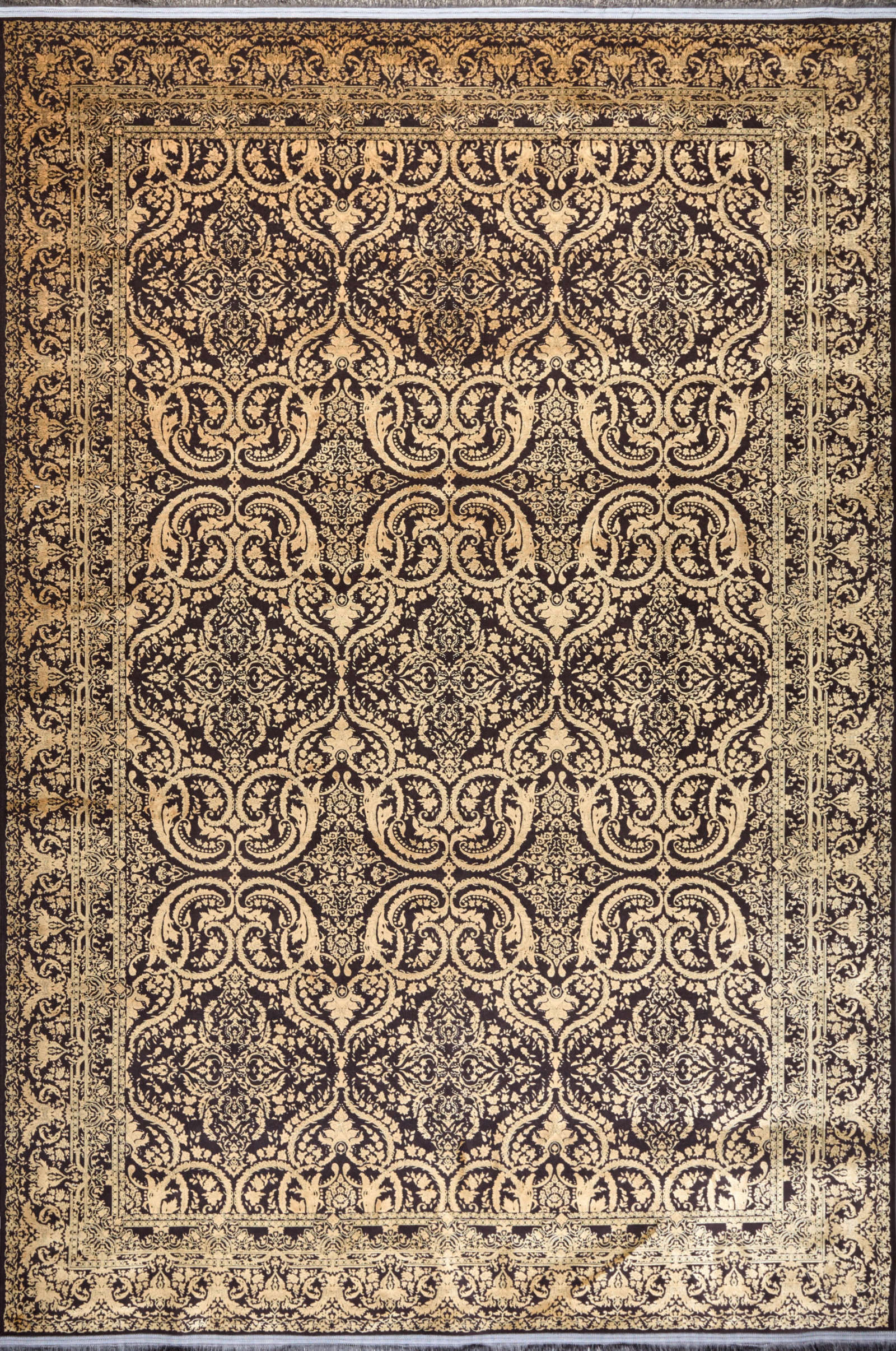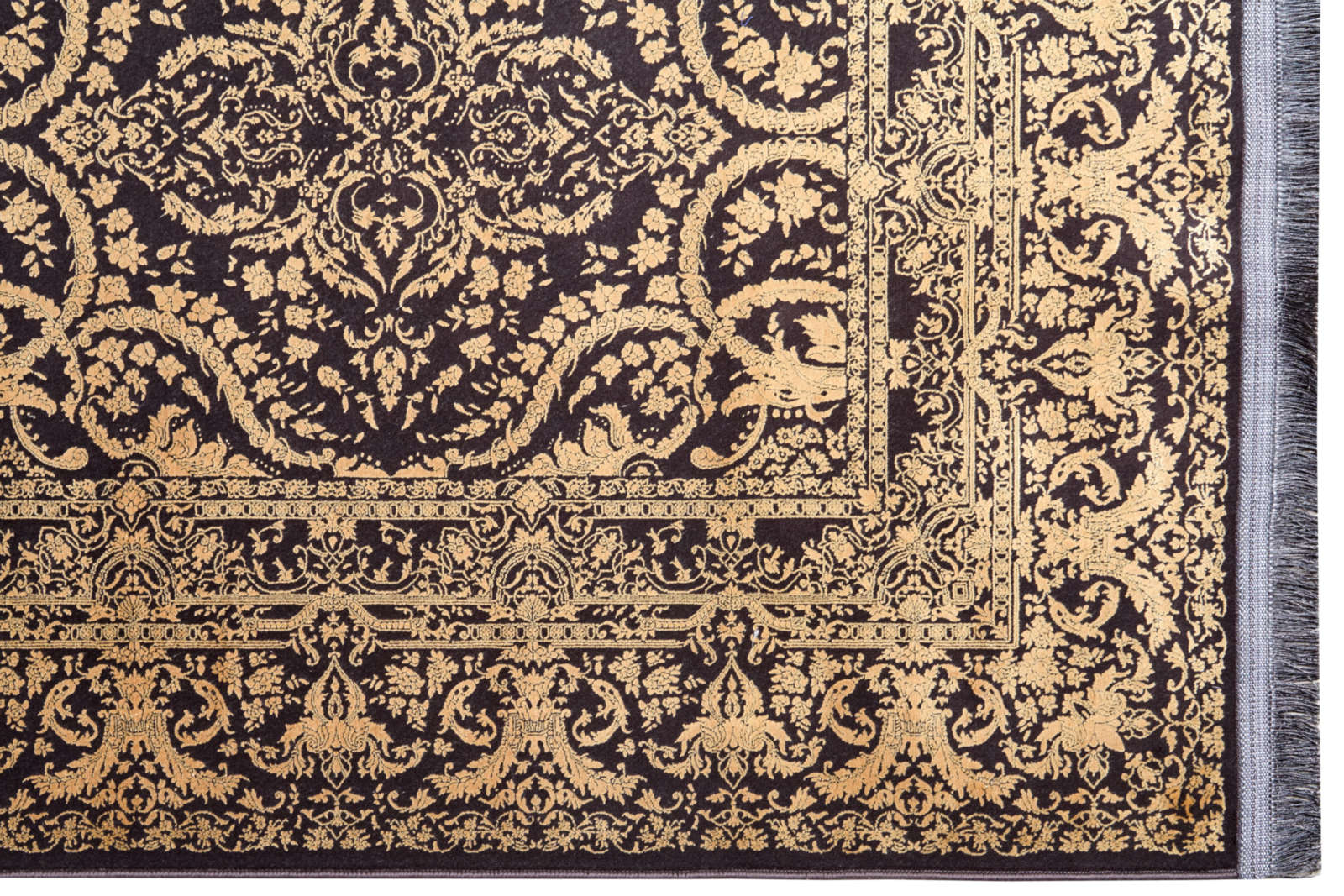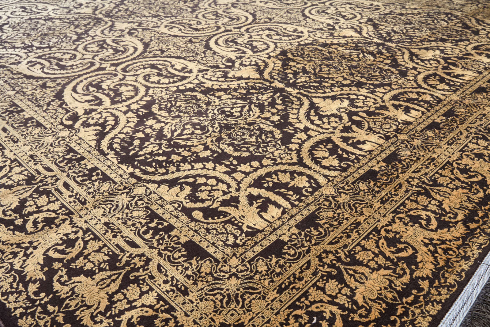 Ковёр в золотисто-черной гамме с изящным орнаментом напоминает барочные узоры. Богатый рисунок создает ощущение роскоши и тепла, делая его акцентным элементом классического интерьера. Подойдет для гостиной или кабинета.