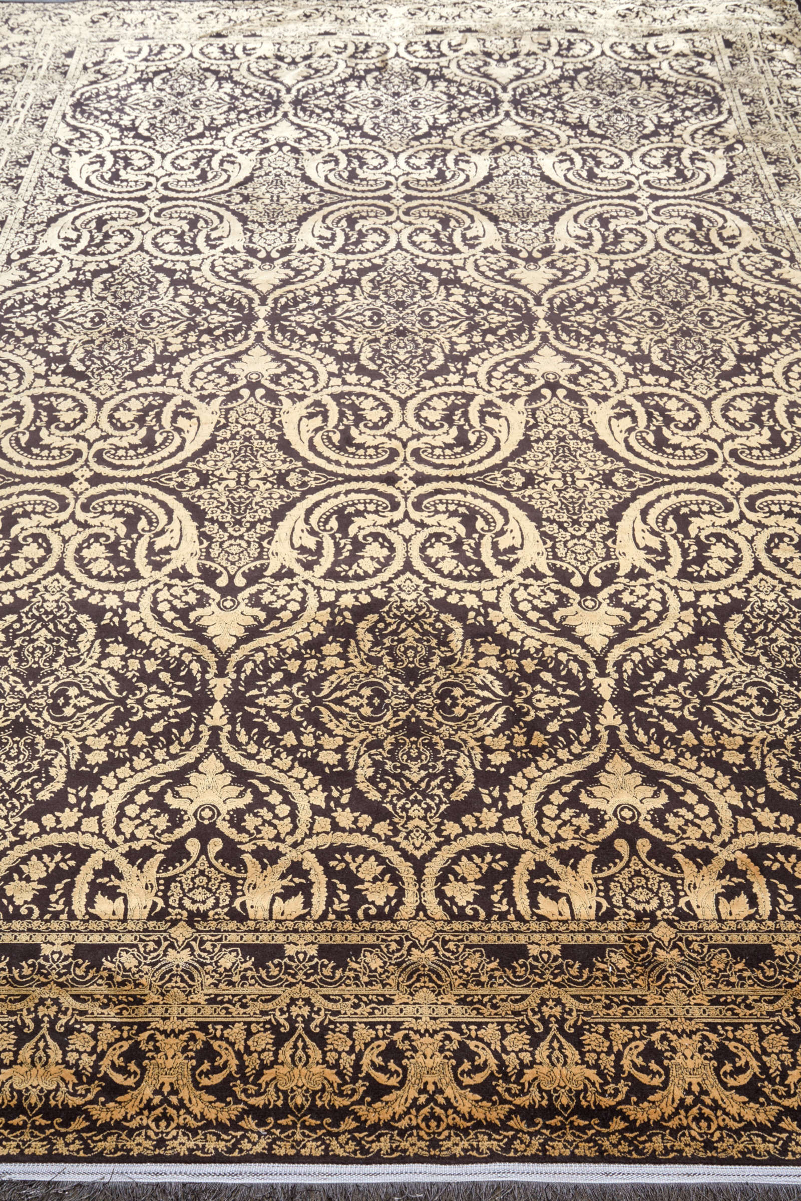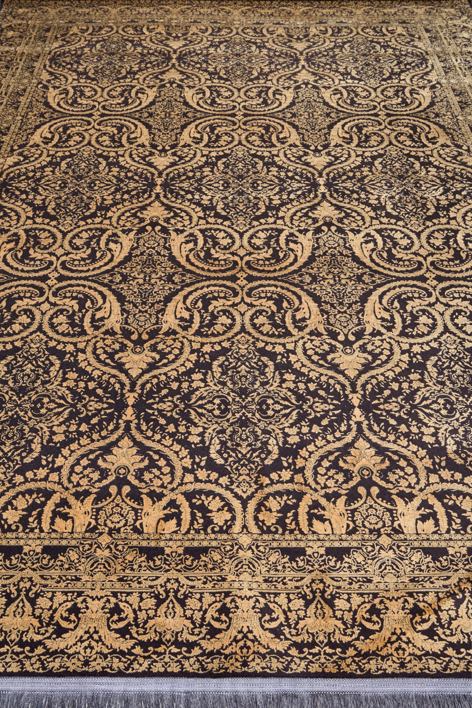 Этот ковёр словно воплощает дух классической роскоши. Золотистый узор с тонкой прорисовкой деталей на насыщенном черном фоне отсылает к эпохе барокко, где гармония линий сочеталась с великолепием форм. Богатый орнамент, складывающийся в симметричные композиции, напоминает узоры старинных дворцов и театров. Такой ковёр станет не просто украшением интерьера, а главным акцентом, создающим особое настроение. Он идеально впишется в просторную гостиную с классической мебелью или в кабинет с массивным деревянным столом, добавив пространству атмосферу уверенности и утончённого вкуса. Светильники тёплого света подчеркнут игру оттенков, а текстиль в глубоких или нейтральных тонах создаст гармоничный ансамбль.