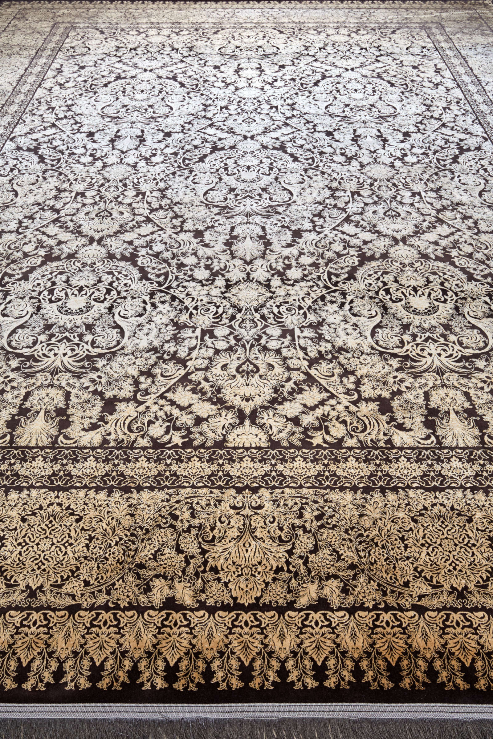Сложный золотисто-бежевый орнамент на тёмном фоне напоминает старинное кружево. Ковёр подчеркнёт элегантность интерьера и внесёт ощущение роскоши и торжественности.