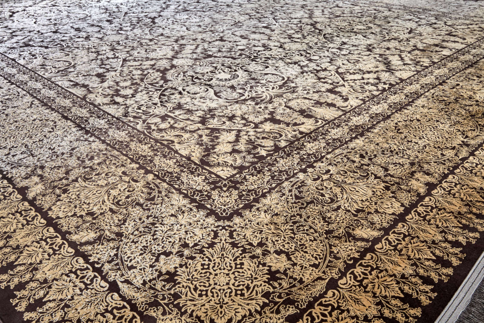 На этом ковре будто оживает изысканное кружево, сотканное золотистыми нитями на тёмном фоне. Рисунок поражает богатством деталей: витиеватые линии и завитки создают впечатление торжественности и строгости одновременно. Такой ковёр отлично подойдёт для классического интерьера, добавив ощущение роскоши и стабильности. Его насыщённые оттенки создают глубину, а светлый орнамент играет на контрасте, подчёркивая мебель и архитектурные элементы комнаты. В столовой он подчеркнёт торжественность обстановки, а в кабинете придаст деловую атмосферу. Этот ковёр словно хранит дыхание времени и связывает пространство с традициями Востока.