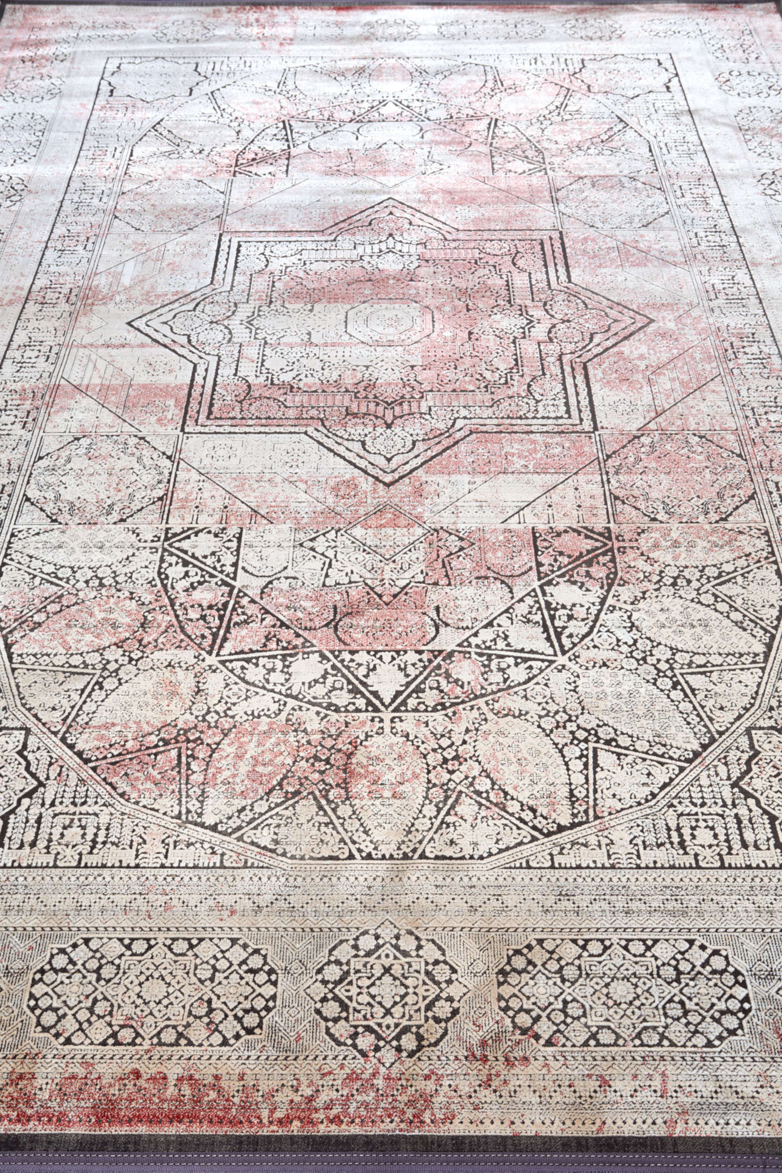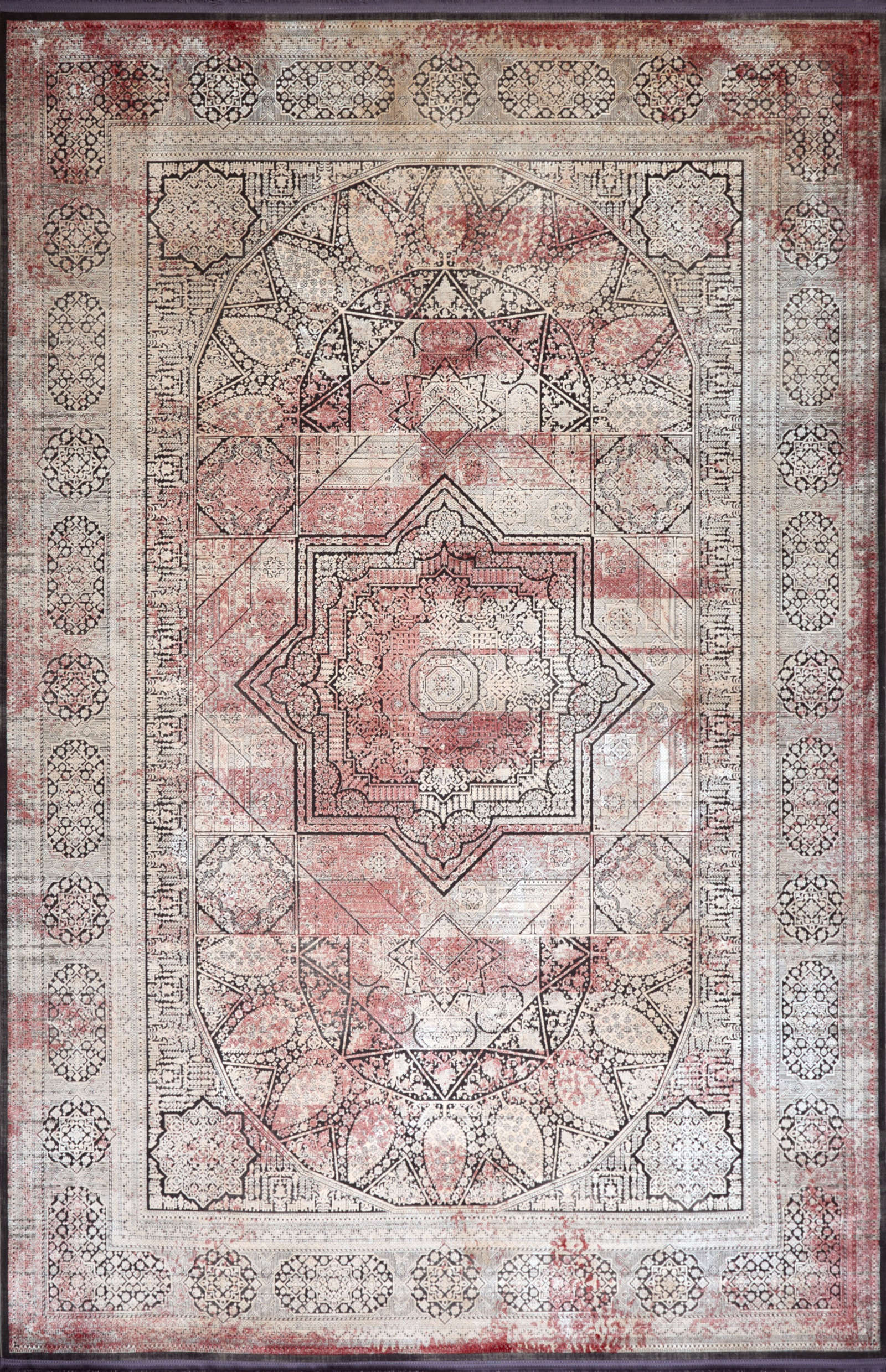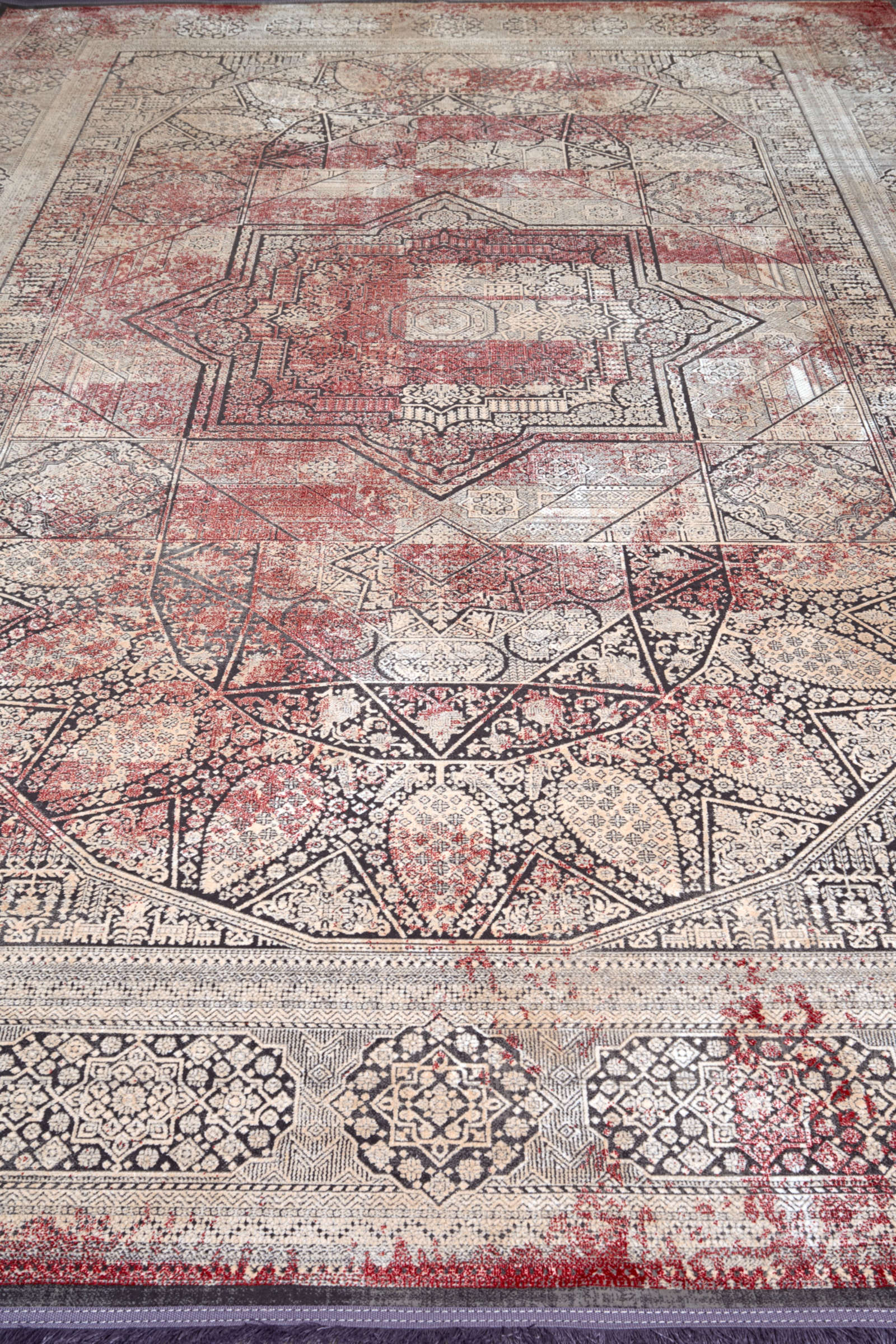 Этот ковёр — словно старинный камень, в толще которого время оставило свои следы. На сером фоне просматривается изящный классический орнамент, а поверх него — мягкие бордовые разводы, напоминающие мраморные или гранитные прожилки. Благодаря этому сочетанию возникает эффект глубины и благородного старения, как будто ковёр хранит в себе отпечатки истории. Такой дизайн станет выразительным акцентом в интерьере: в гостиной он подчеркнёт элегантность и вкус хозяев, в спальне добавит уюта и драматичности, а в кабинете придаст пространству статусности. Сочетание серых и бордовых оттенков органично смотрится рядом с тёмной мебелью и металлом, но и в светлых интерьерах он будет играть роль яркого художественного акцента, привнося атмосферу глубины, изысканности и лёгкой винтажной драматичности.