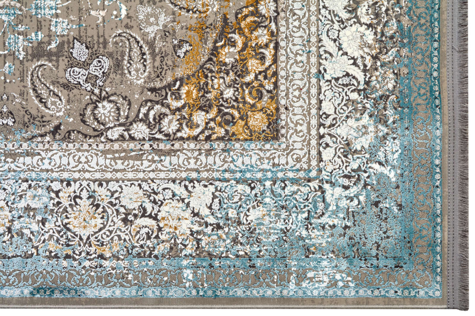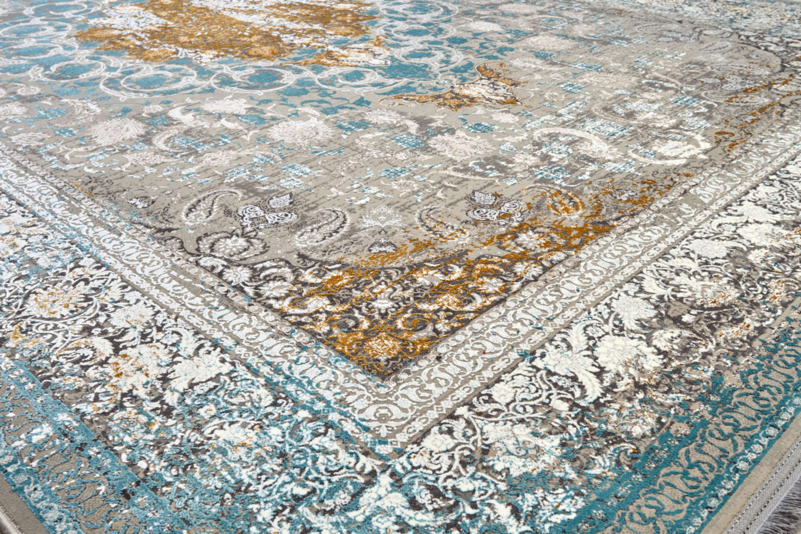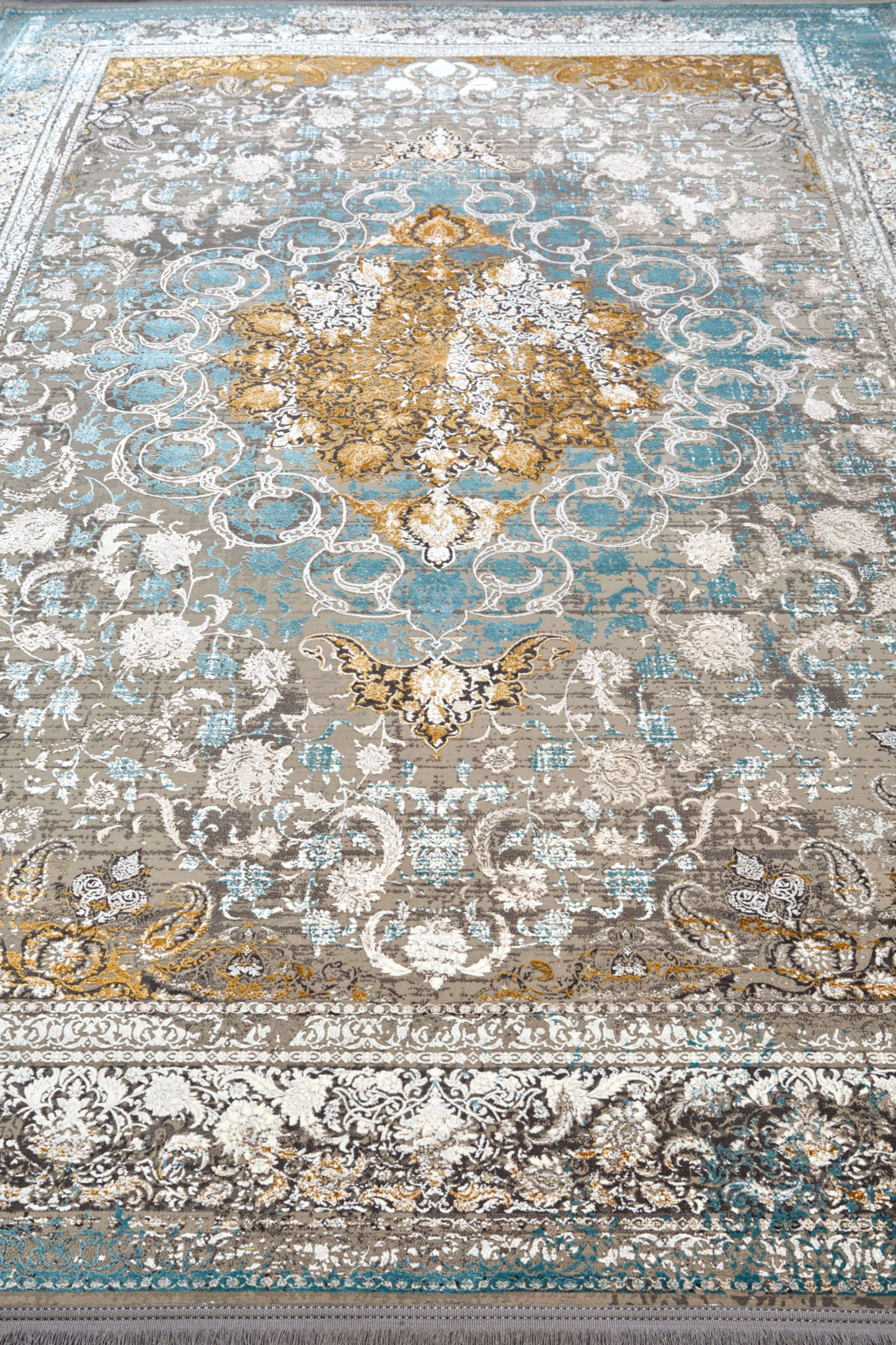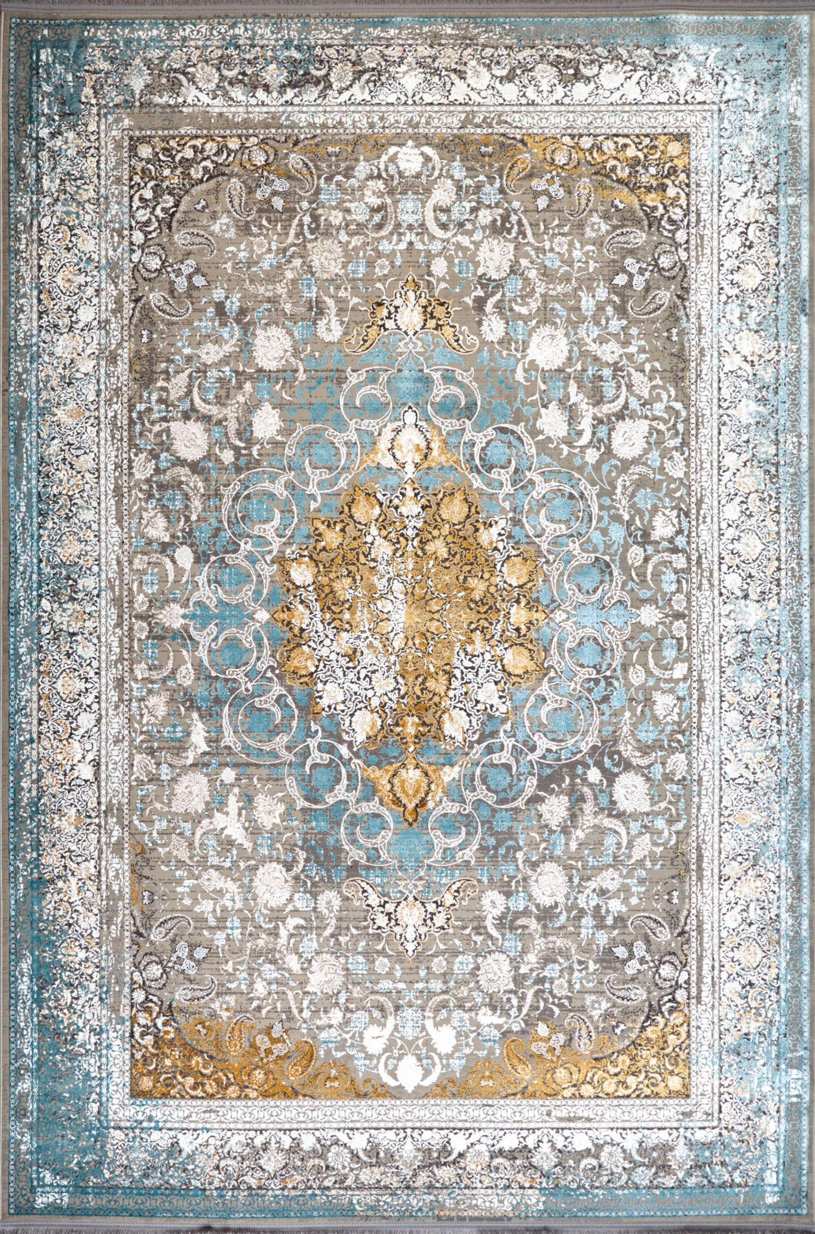 Этот ковёр словно переносит в мир восточной роскоши и утончённости. Его сложный узор, в котором слышны старинные мотивы, выполнен в нежных пастельных тонах, создающих ощущение лёгкости и свежести. Центральная часть обрамлена изысканной каймой, подчёркивающей благородство и стиль.