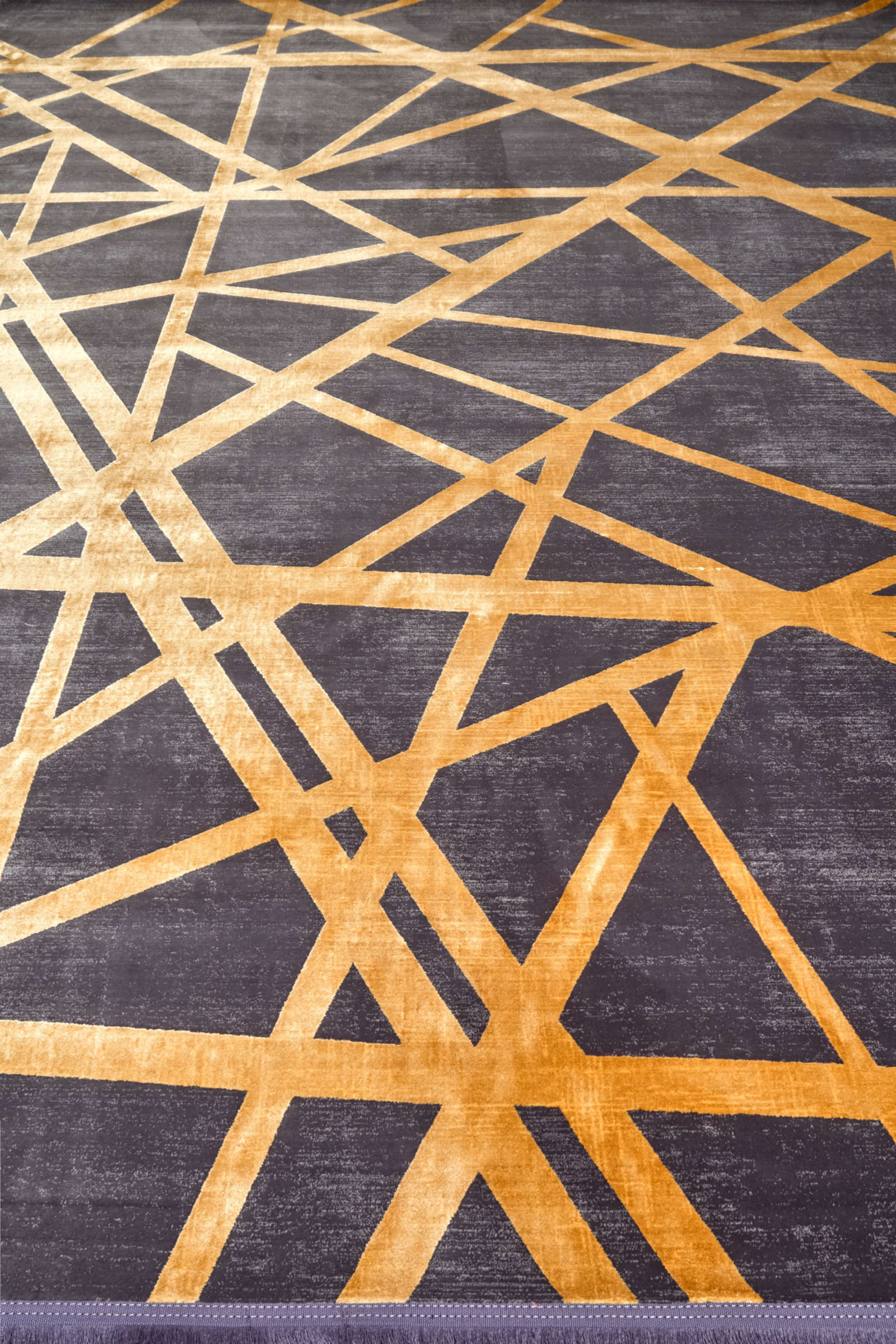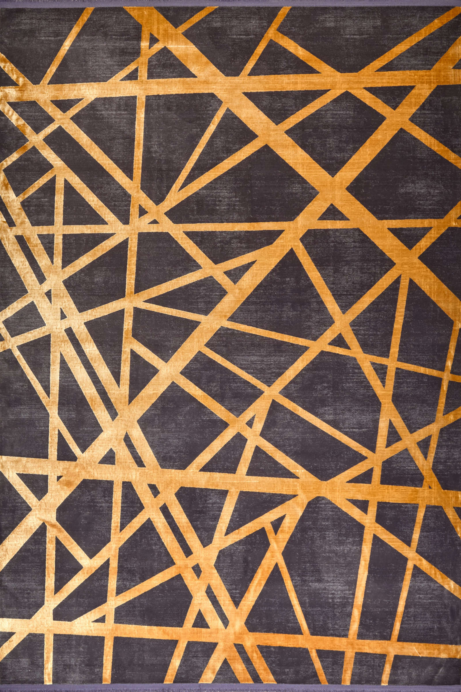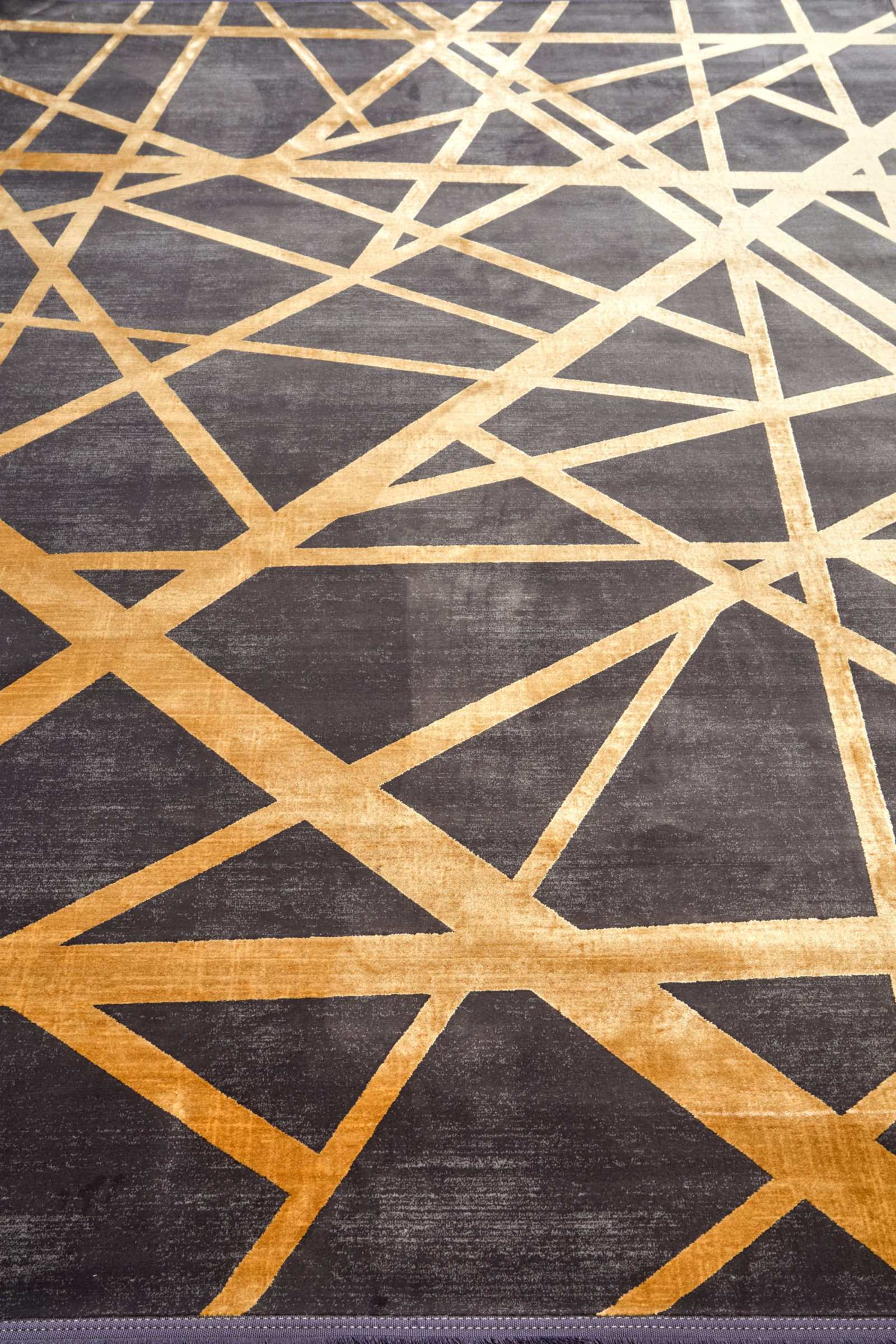 Дизайнерский ковёр с геометрическим узором — будто золотые нити на чёрном фоне, пересекающиеся в абстрактном ритме. Впечатляющий визуальный эффект, графика и глубина. Добавит интерьеру структуру, характер и контраст.