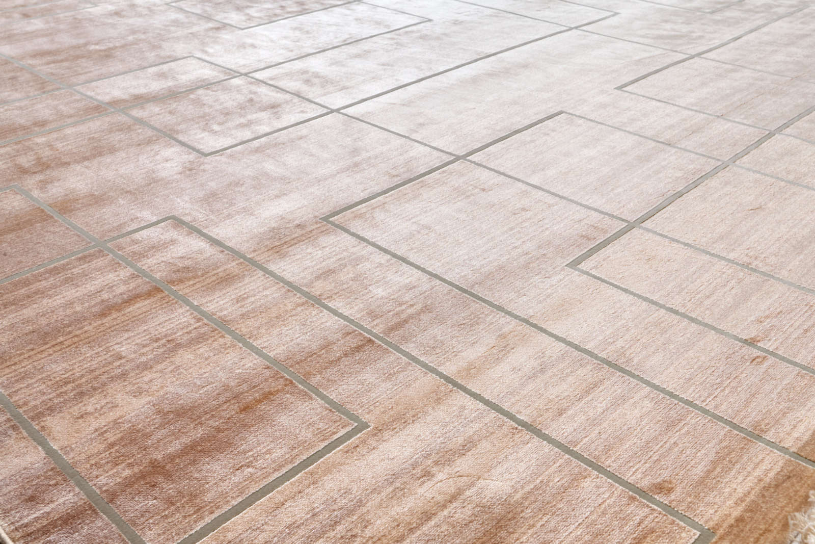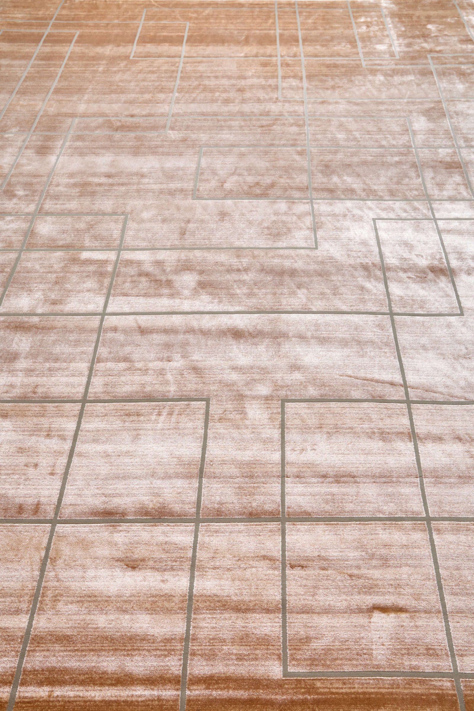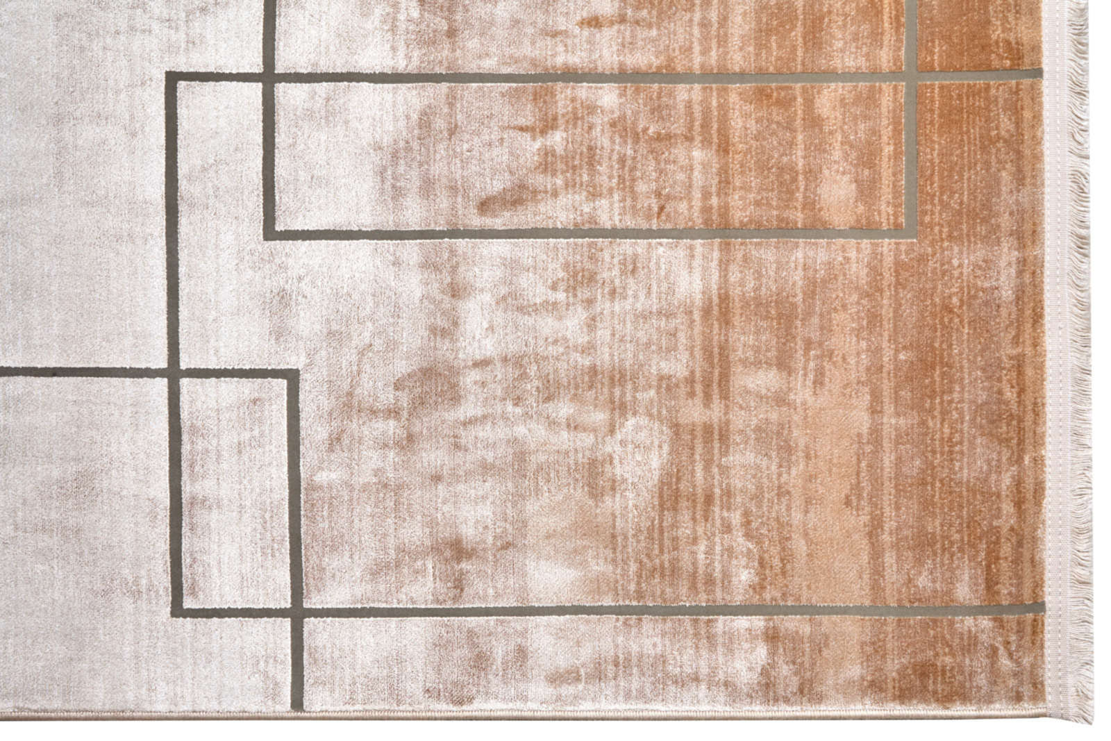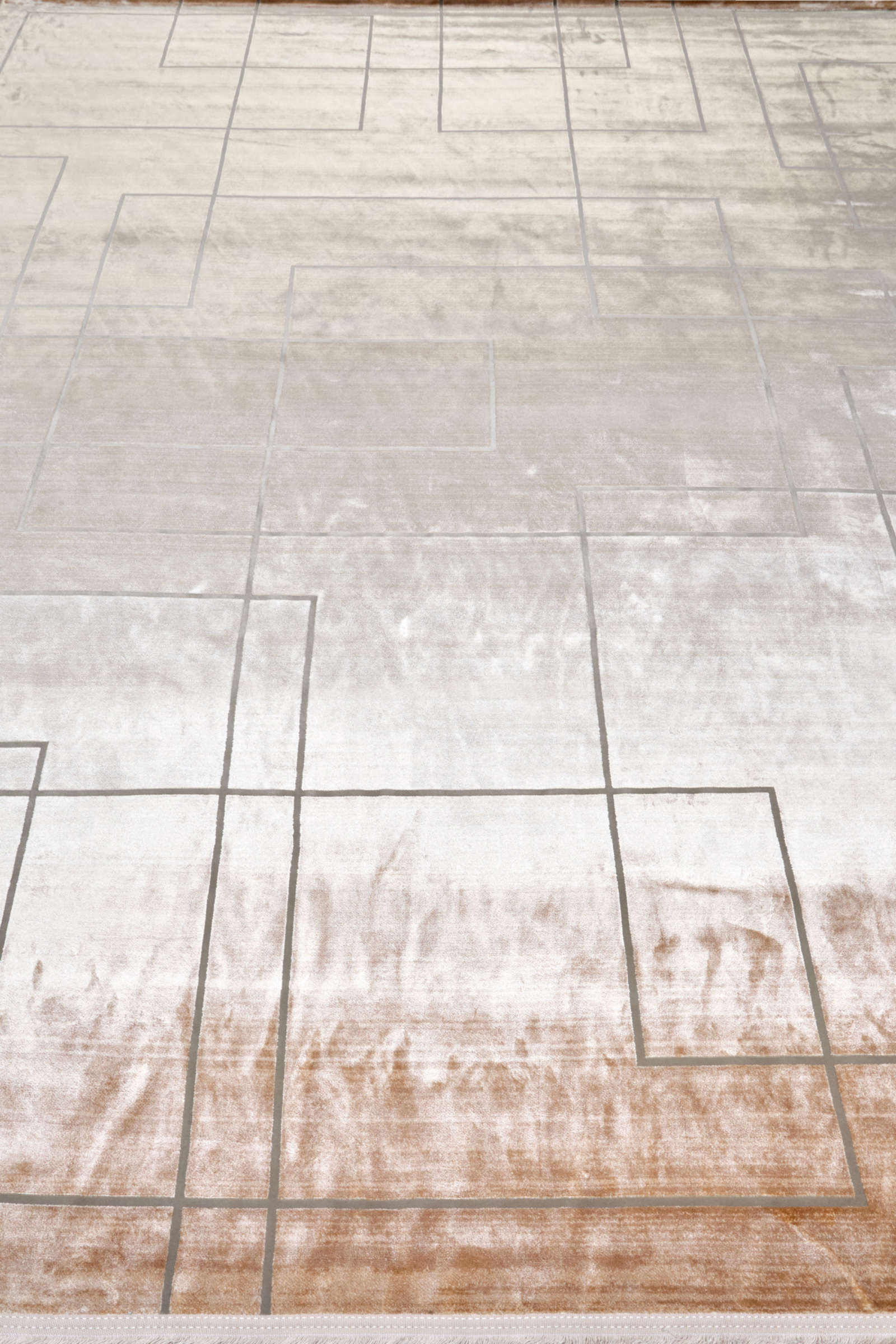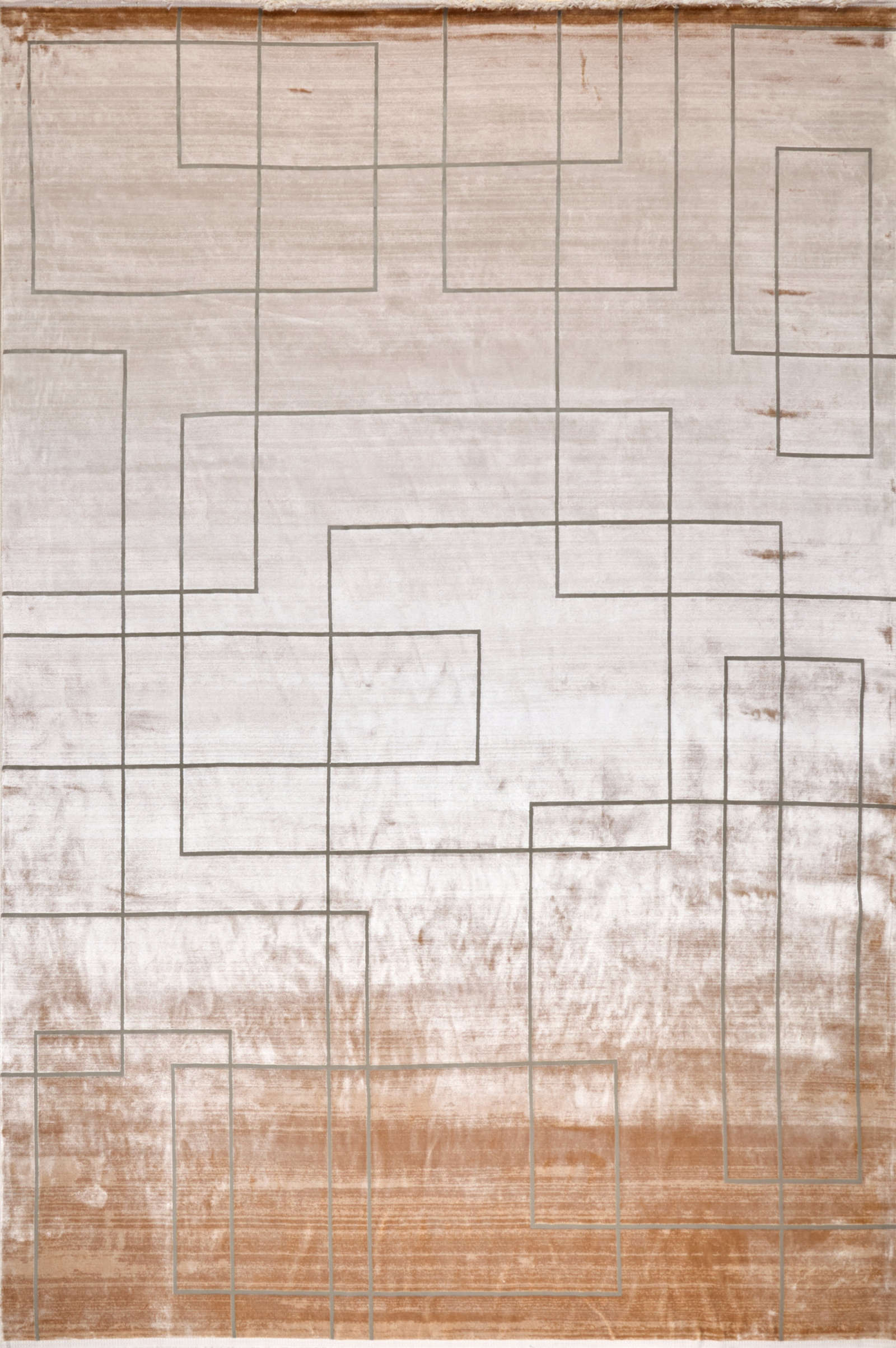Ковёр изготовлен в Иране из артшёлка и акрила — материалов, которые придают ему мягкость, лёгкий блеск и устойчивость к износу. Текстура приятна на ощупь, а тёплый бежевый фон с тонкими прямоугольными линиями задаёт ритм и визуальный порядок.