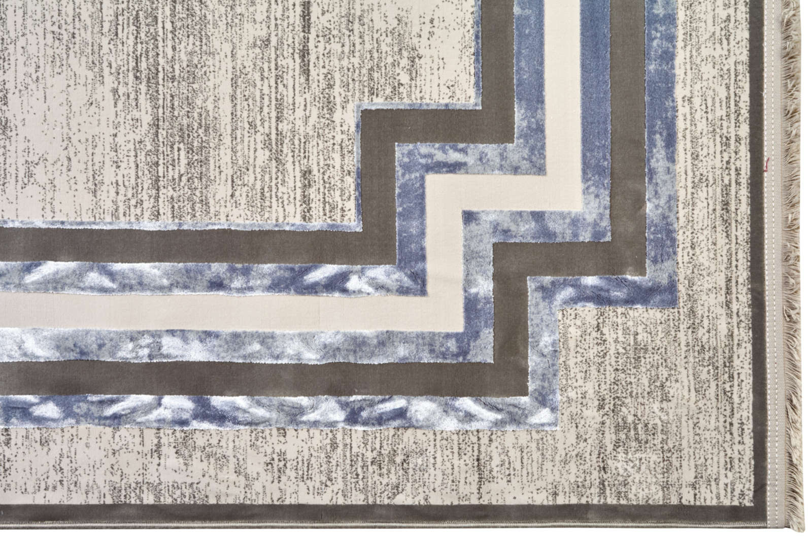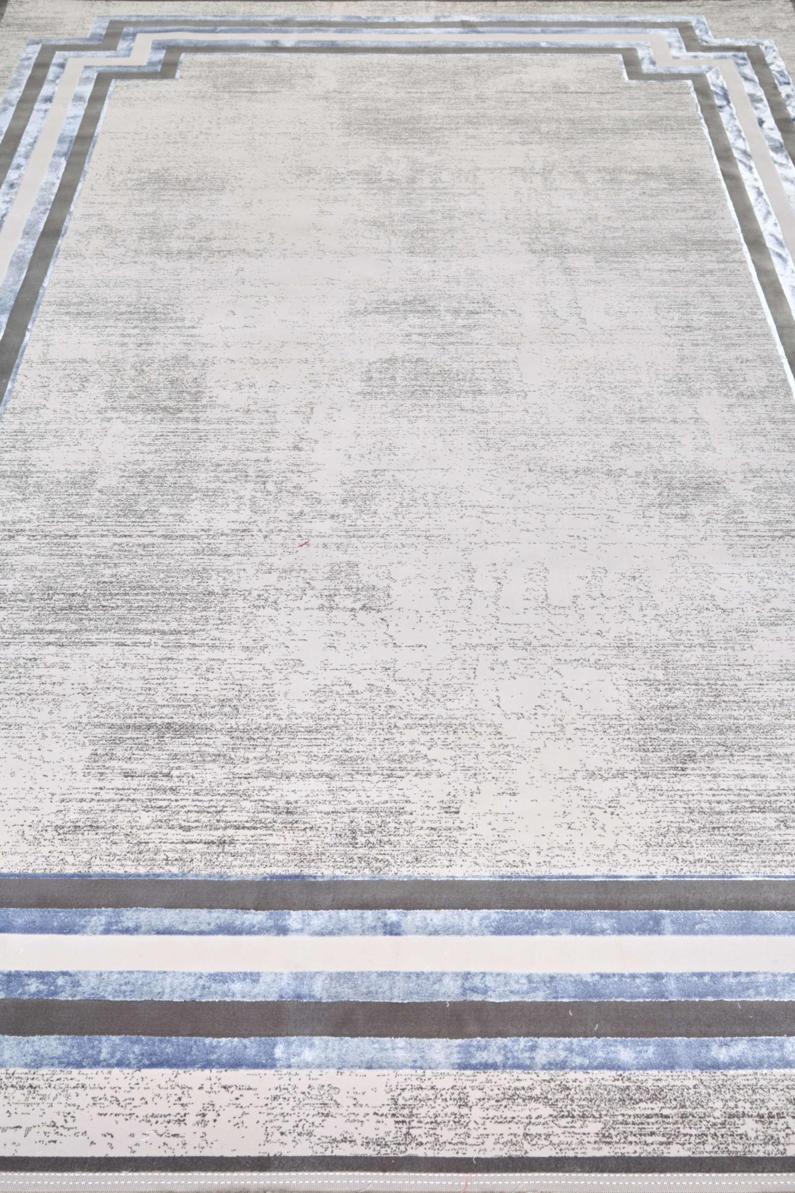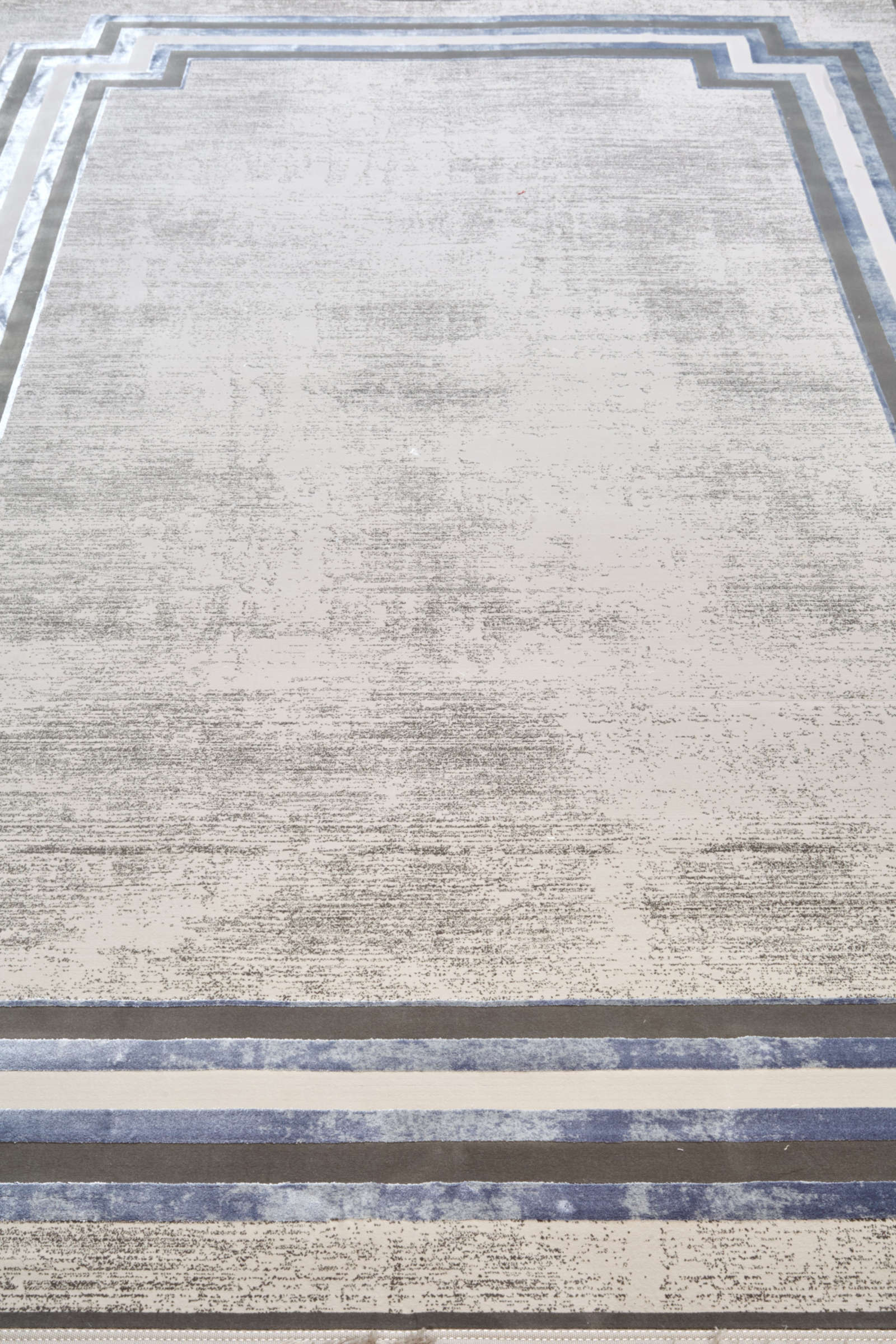 Ковёр в серо-голубой гамме с графичной рамкой сочетает строгость линий и лёгкую патину фона. Его чёткий силуэт задаёт интерьеру структуру и ритм, а приглушённые оттенки придают мягкость. Идеален для современного минимализма, ар-деко и строгой классики.