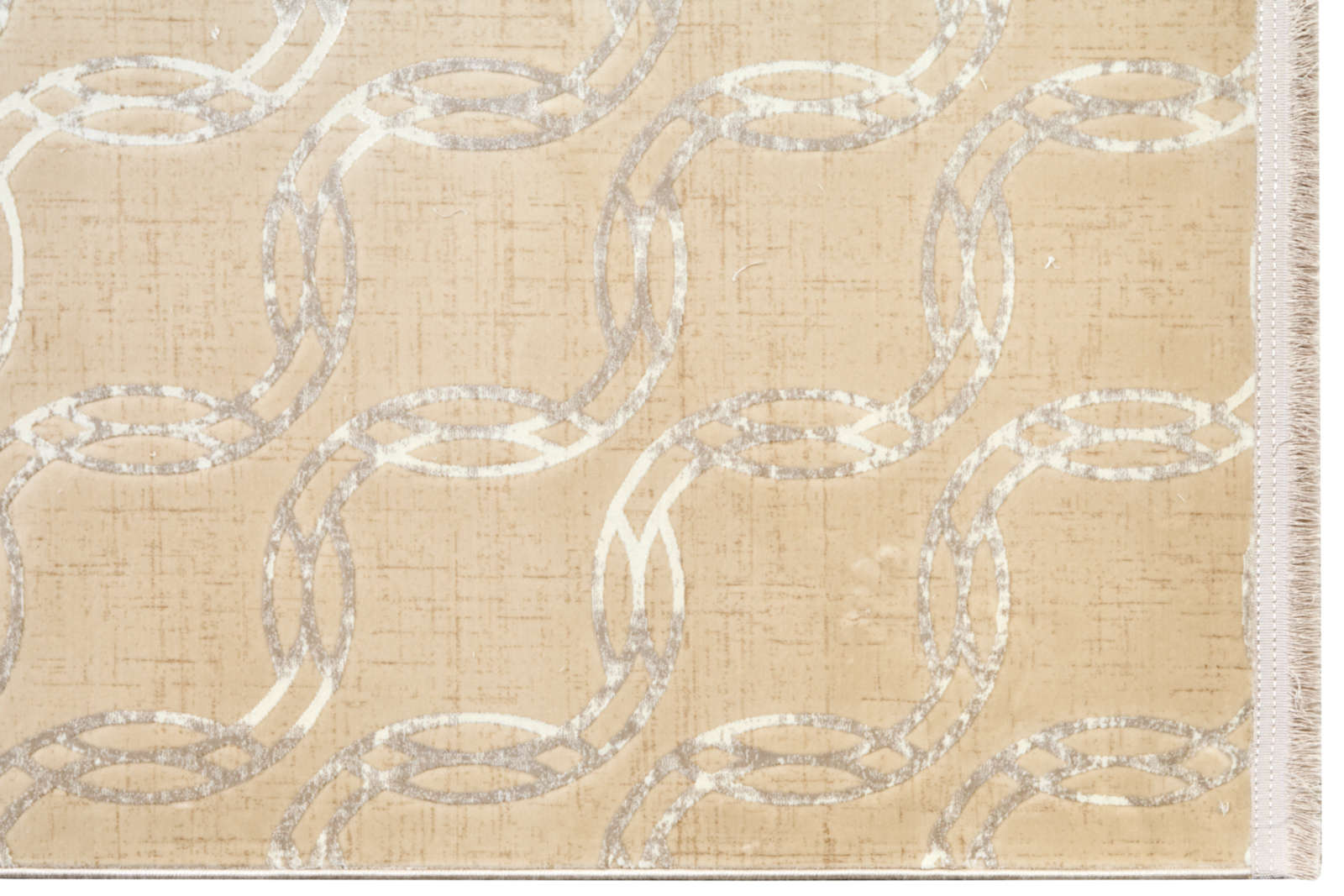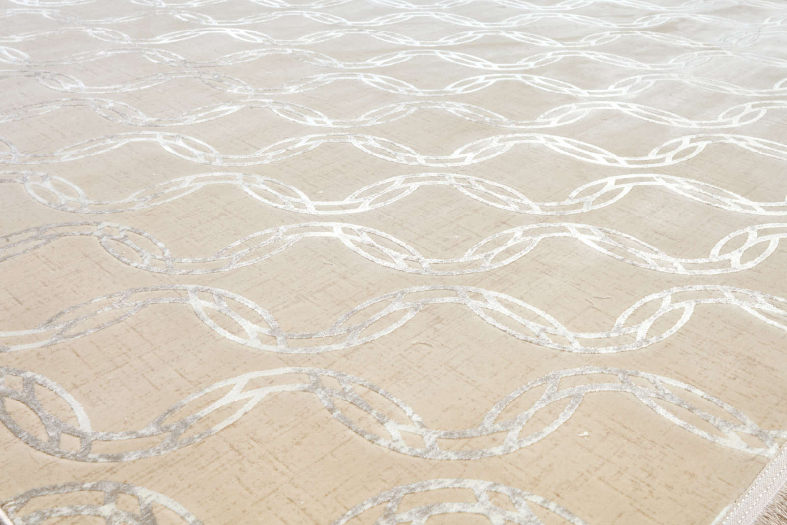 Ковёр с геометрическим рисунком напоминает живописное полотно, полное движения и энергии. Его мягкая бежево-серая гамма оживляет интерьер, добавляя динамики и выразительности.