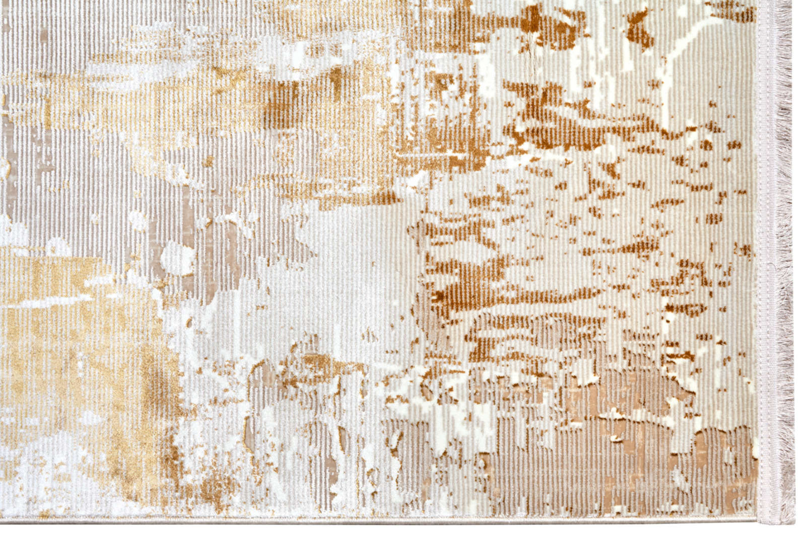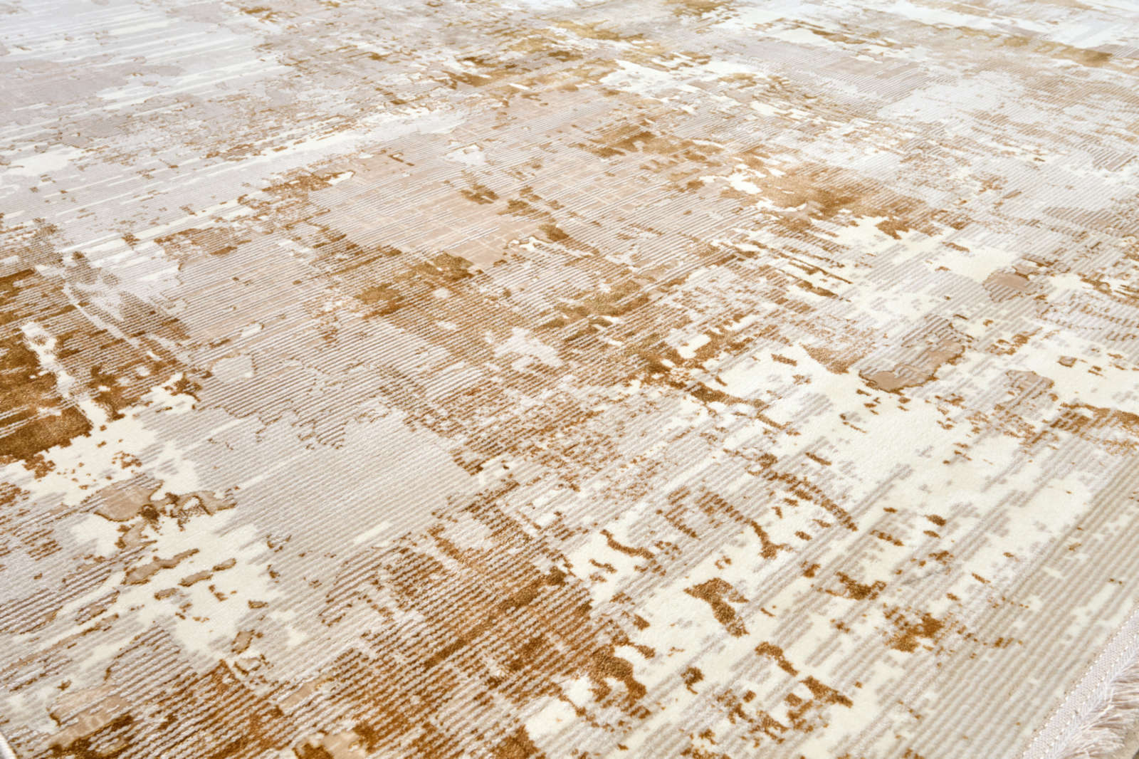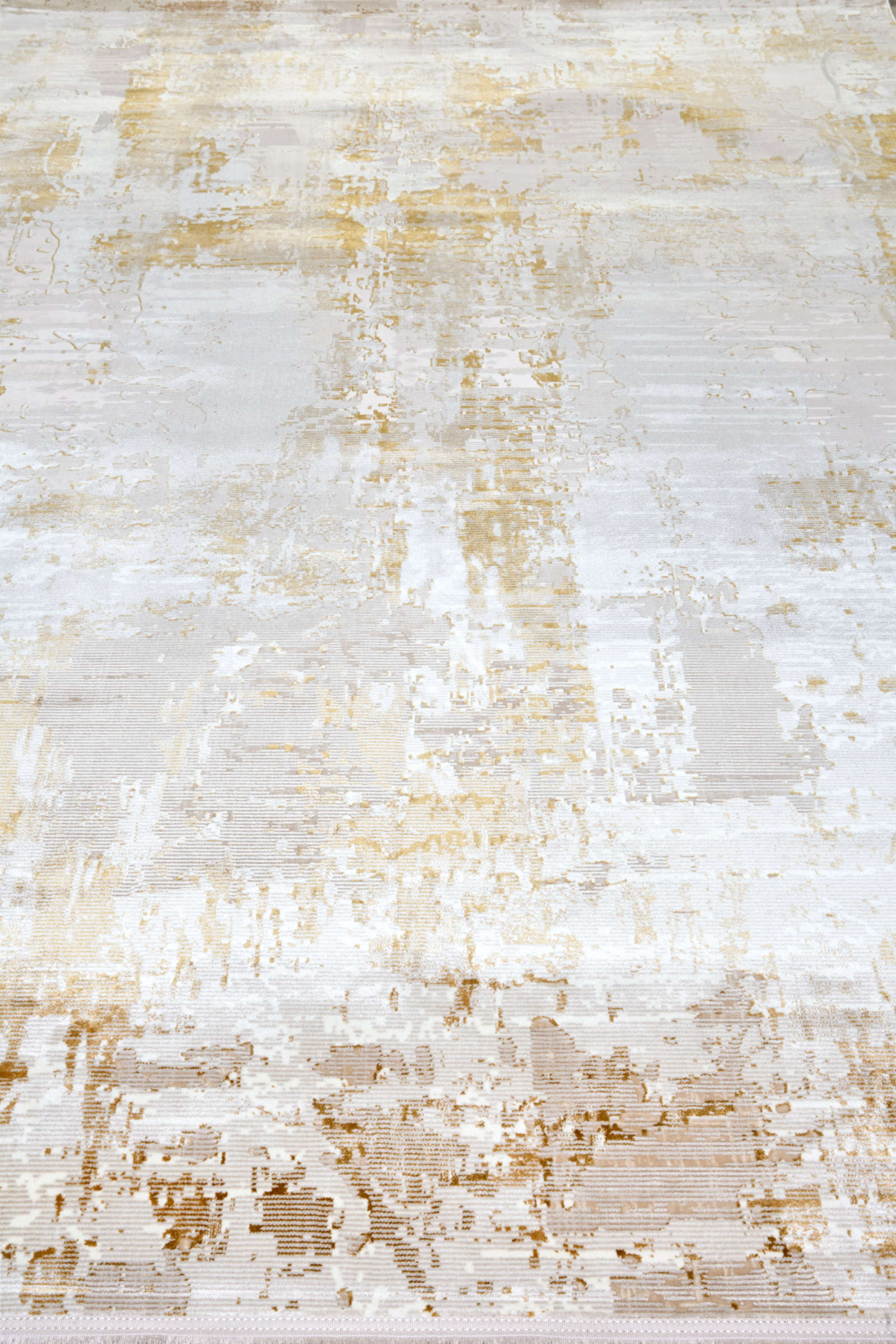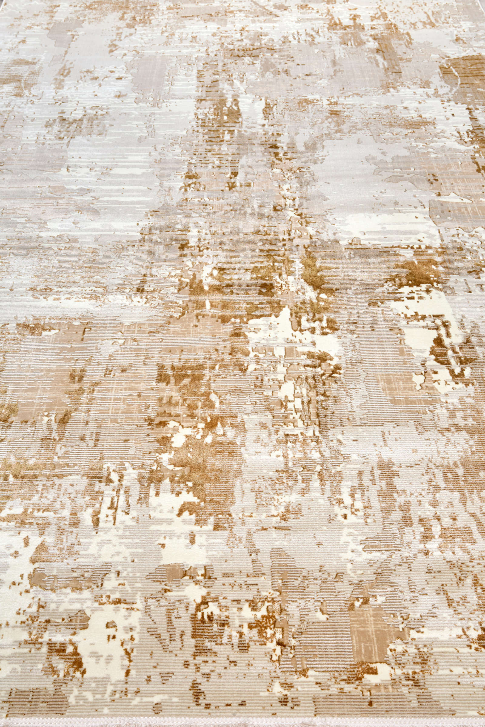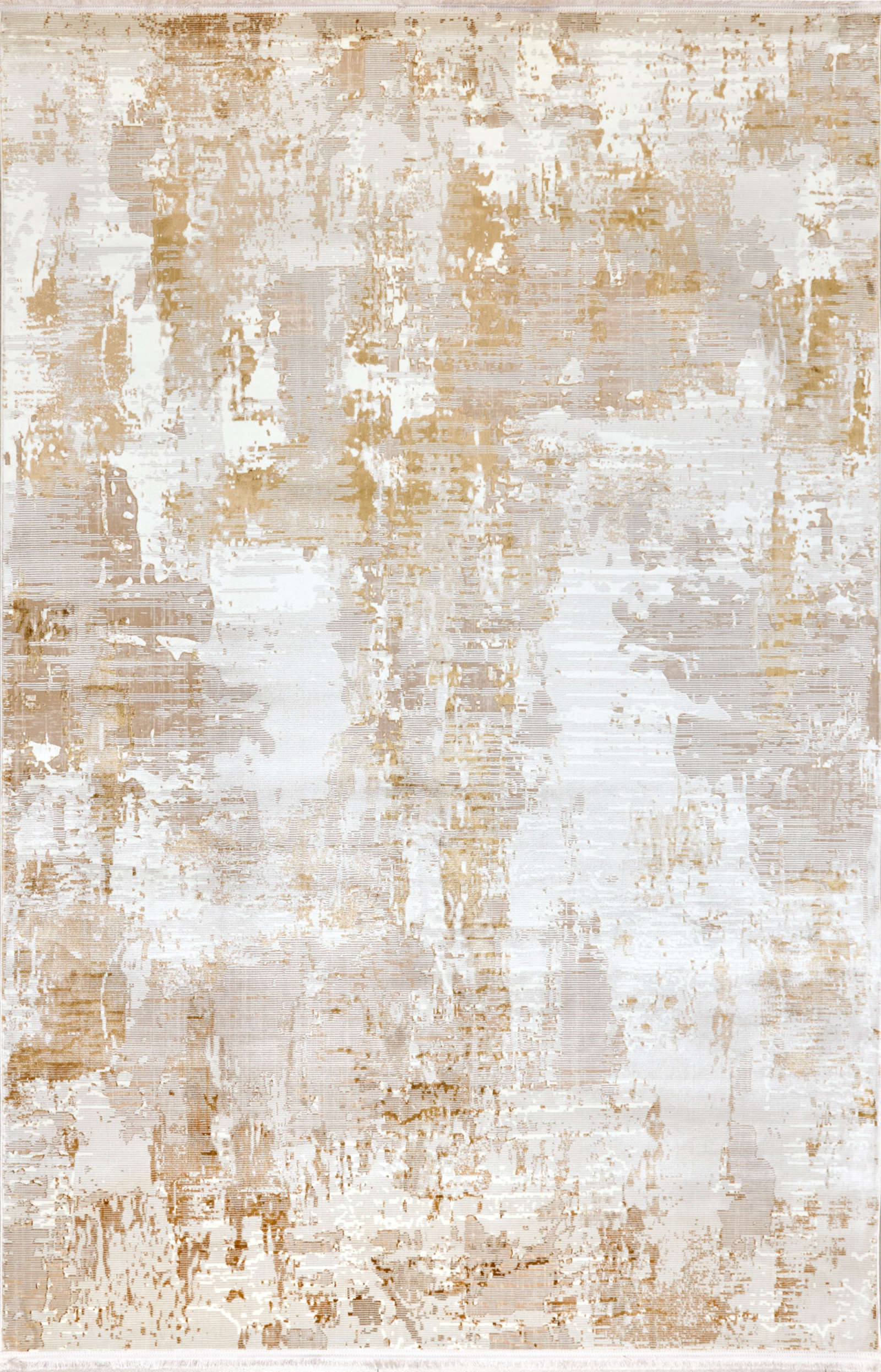 Современный ковёр в бежево-золотистой гамме с абстрактным рисунком напоминает выцветшую фреску. Его неровные переливы создают эффект старинного холста, а золотистые акценты наполняют интерьер теплом и динамикой. Идеален для гостиной, спальни или кабинета.
