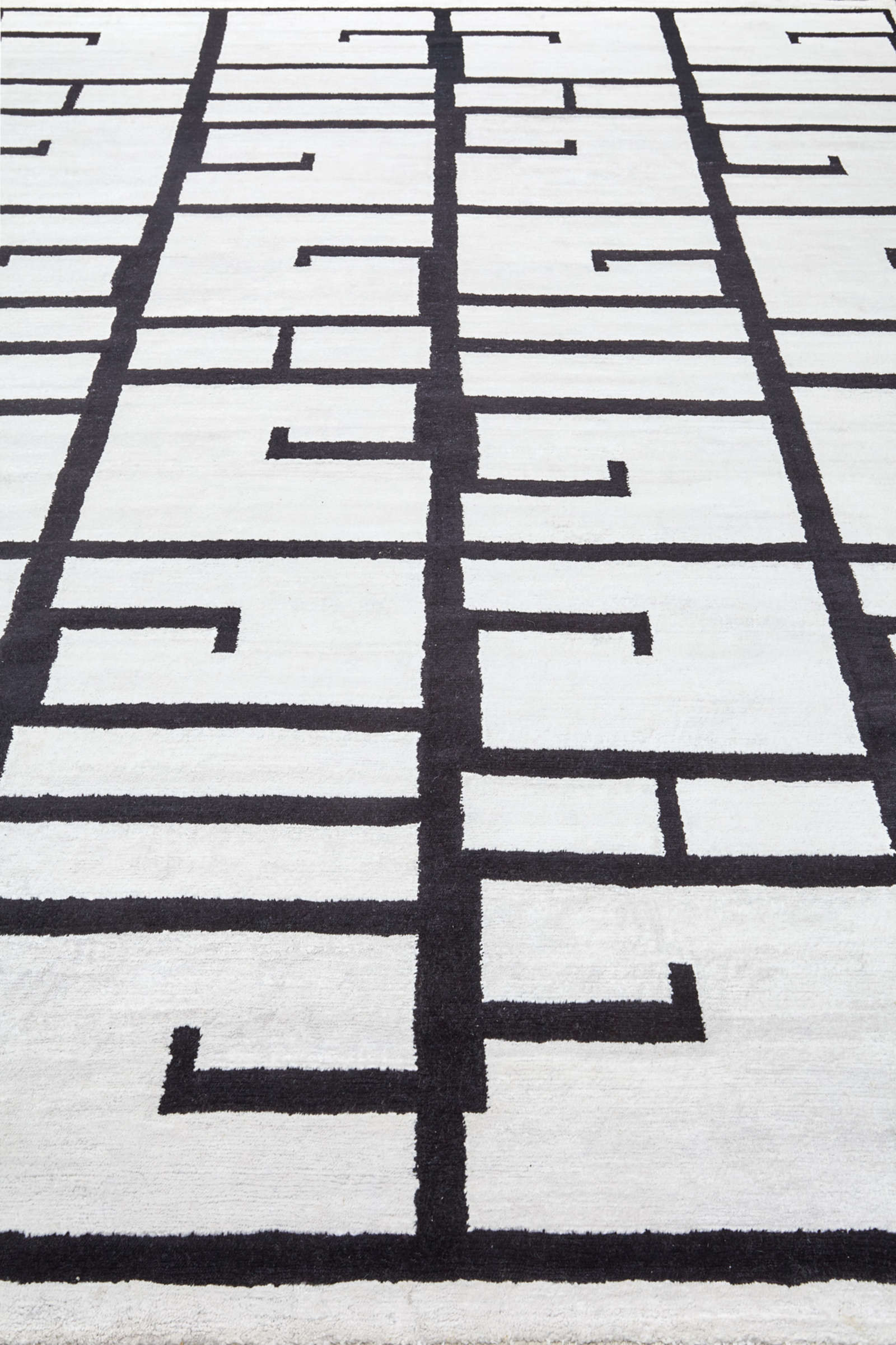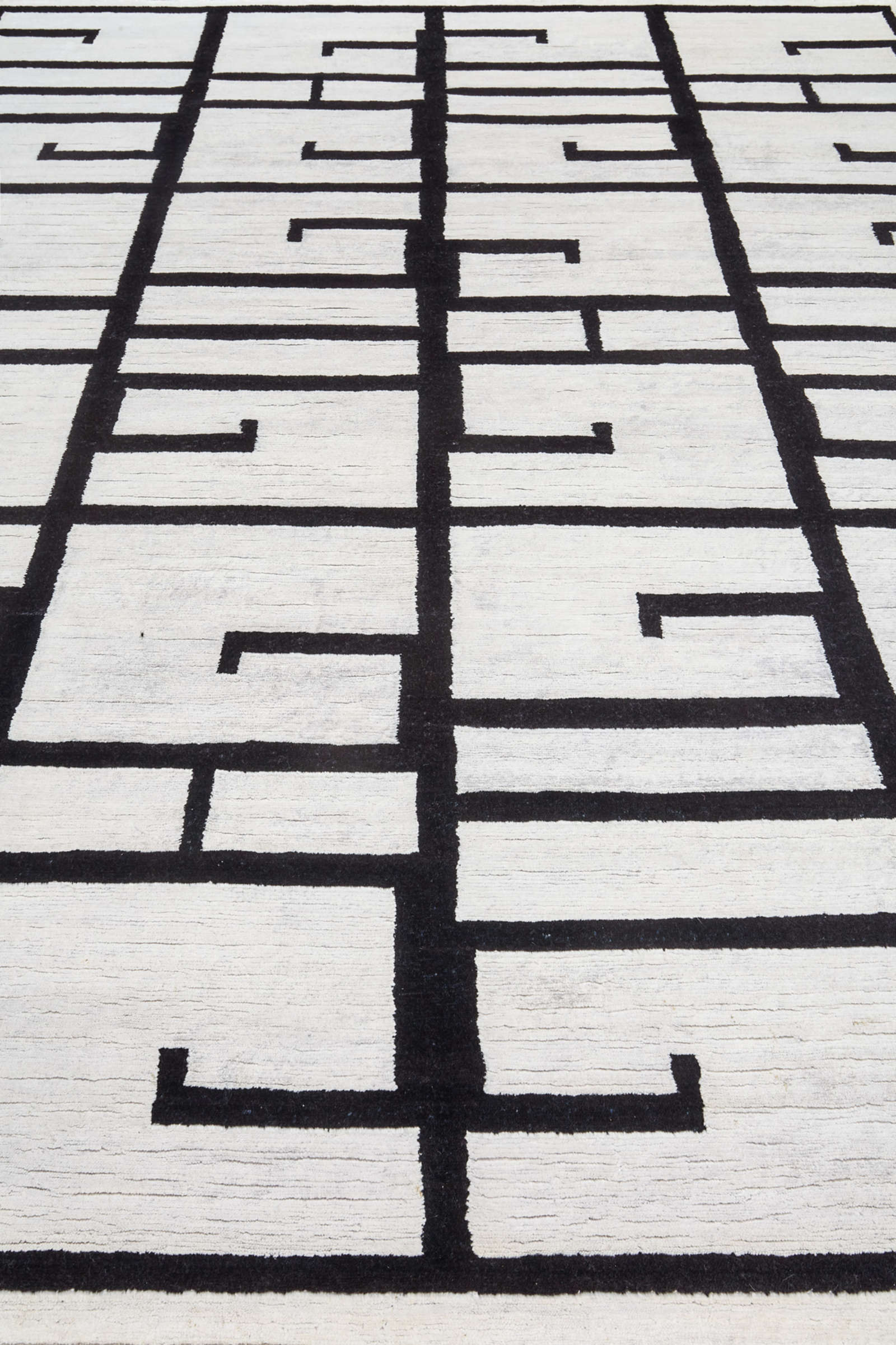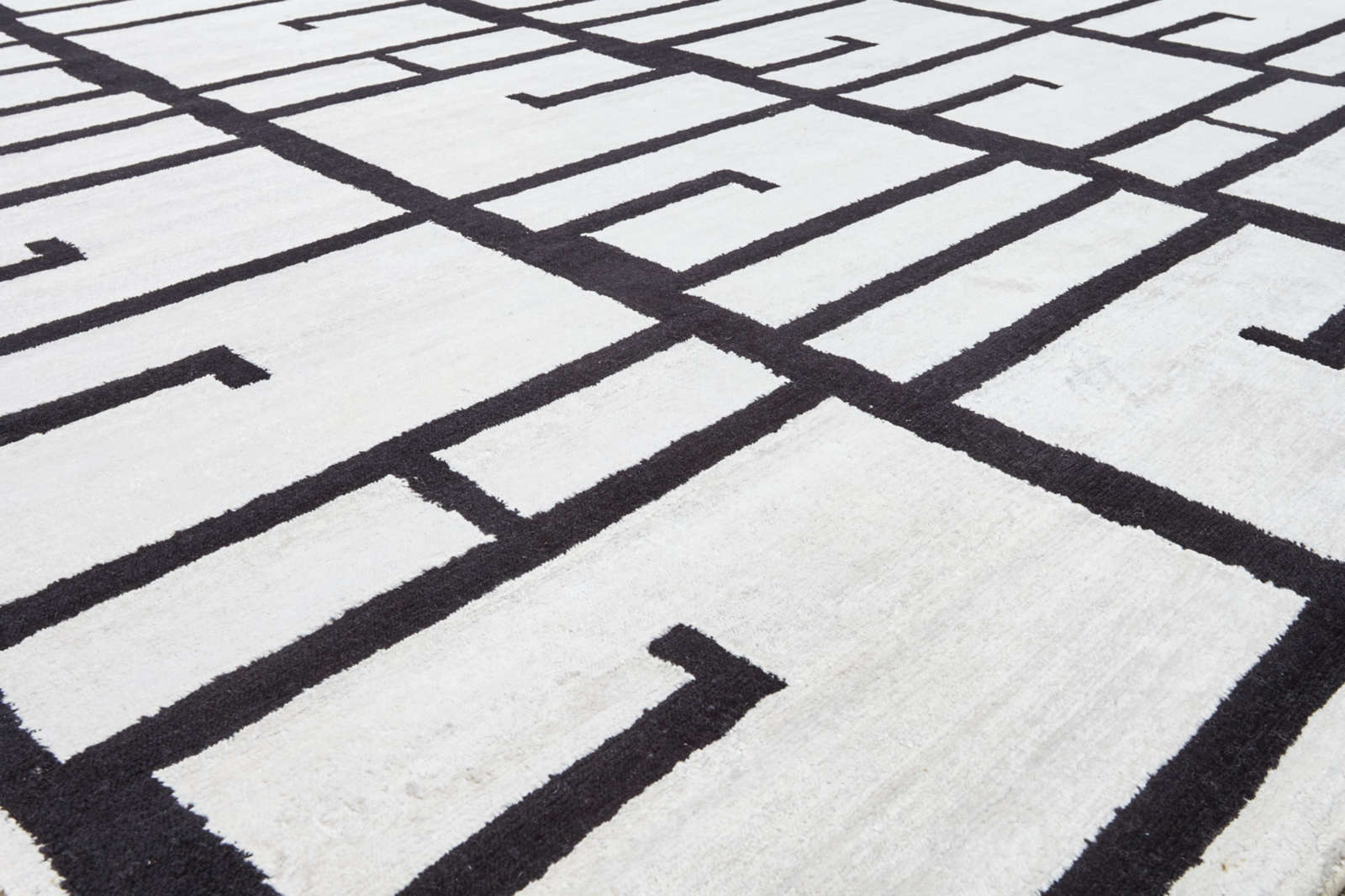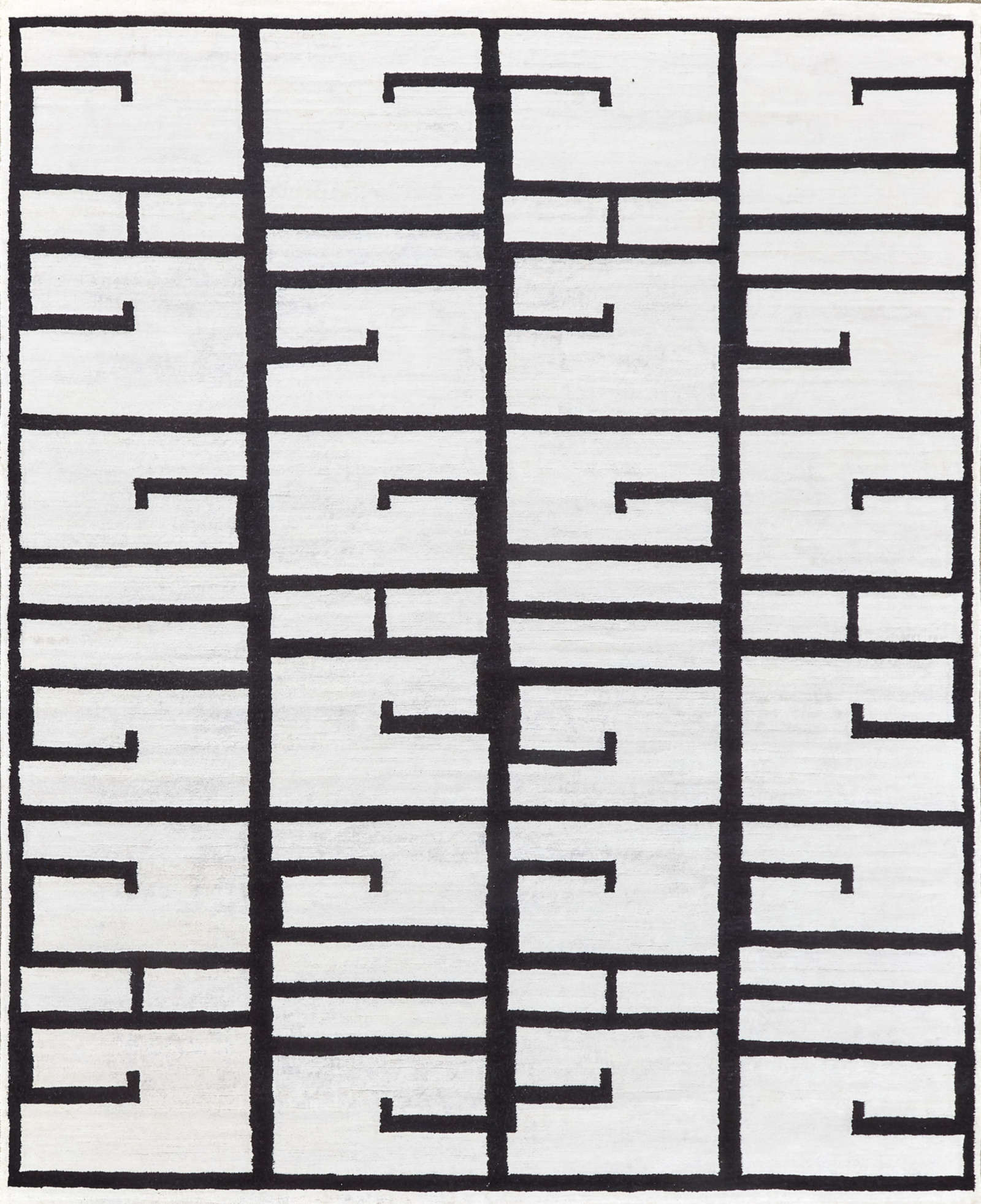 Графичный ковёр с контрастным чёрно-белым рисунком напоминает абстрактный орнамент или современную архитектуру. Чёткие линии и ритм форм создают динамику, которая оживляет интерьер и подчёркивает его современный характер.