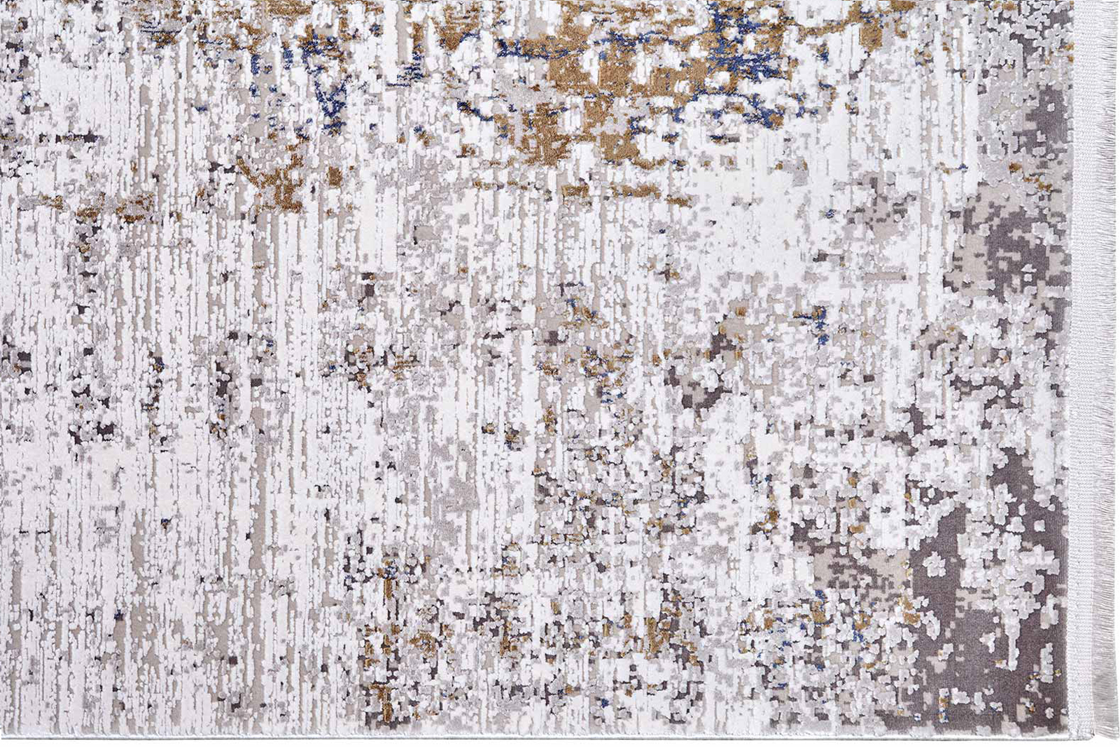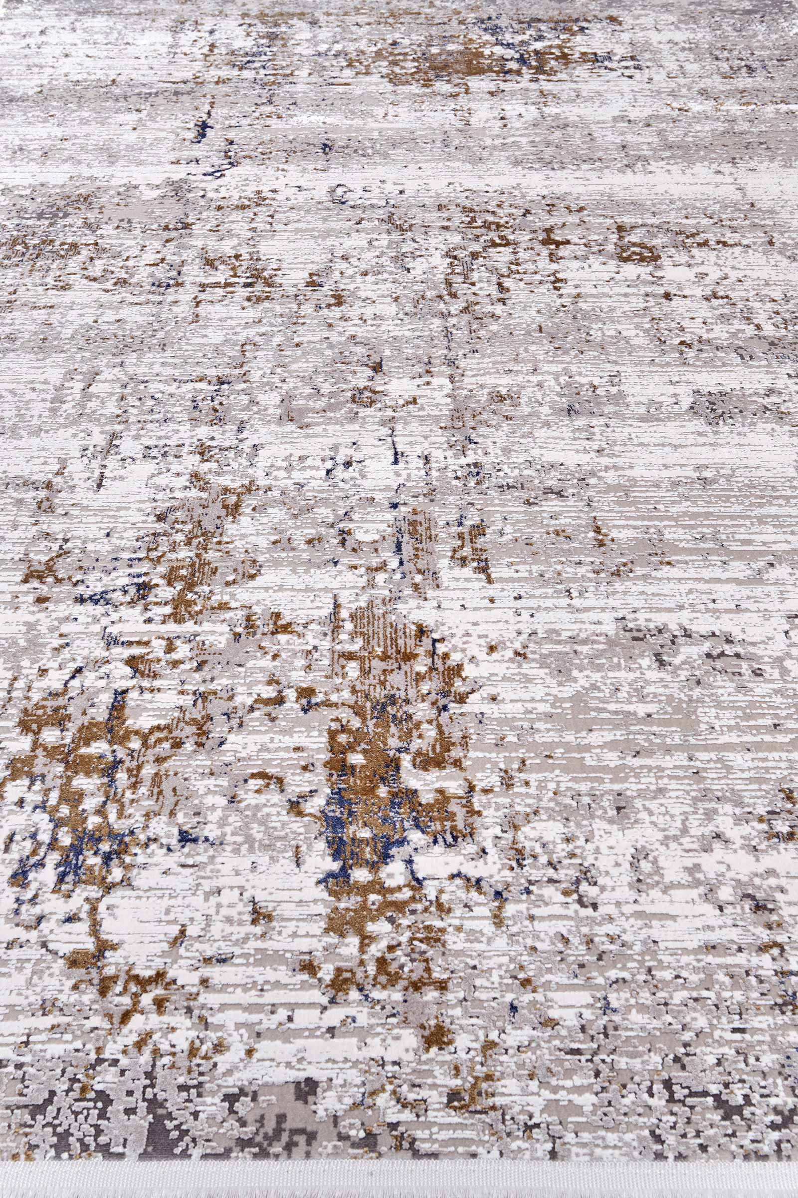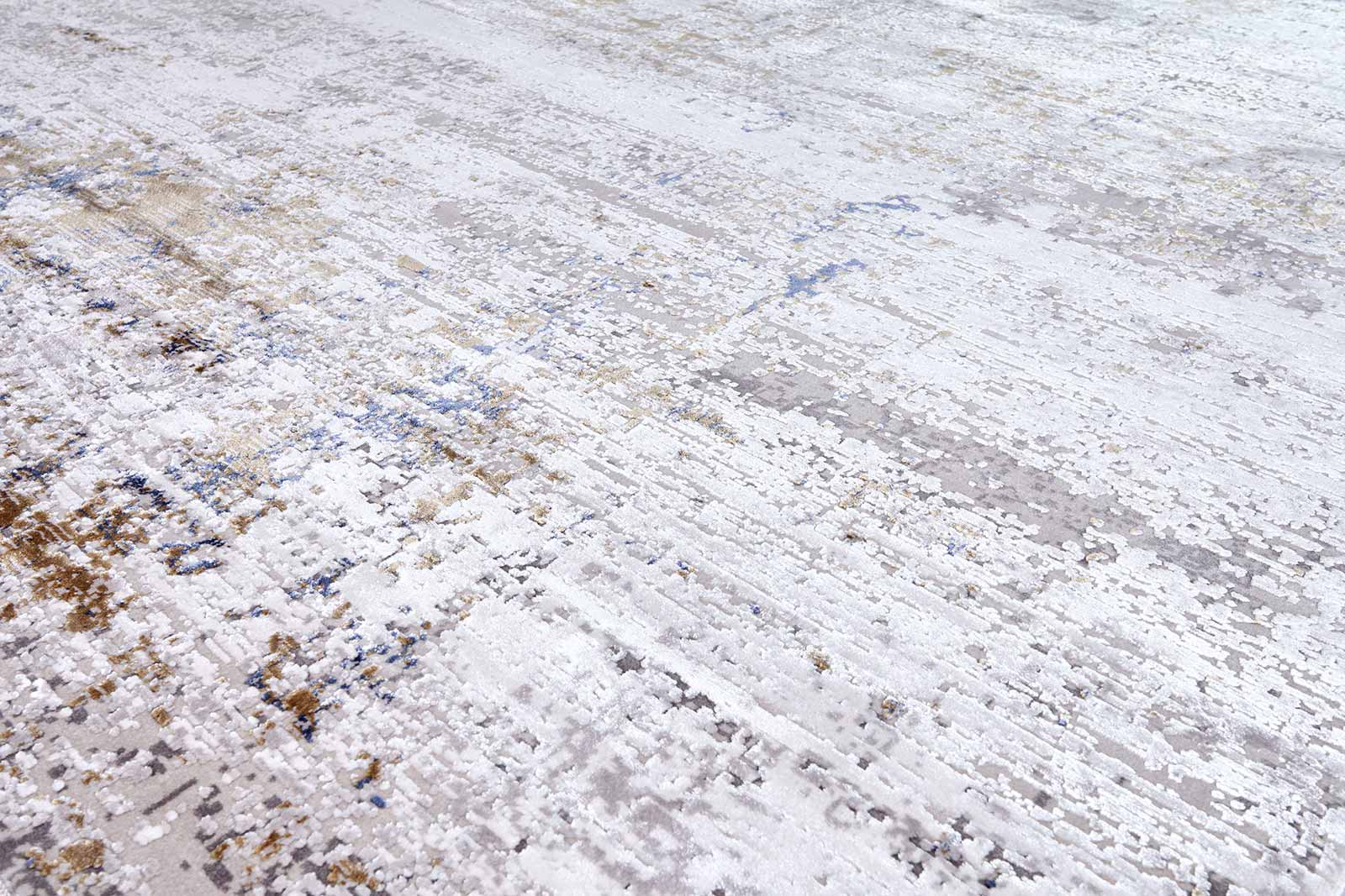 Ковёр с бежевой основой и тонкими вкраплениями синего и коричневого напоминает фактуру выветренного камня или потёртой стены. Ненавязчивый рисунок создаёт атмосферу уюта и спокойствия, подчёркивая эстетику интерьера без лишней драматургии.