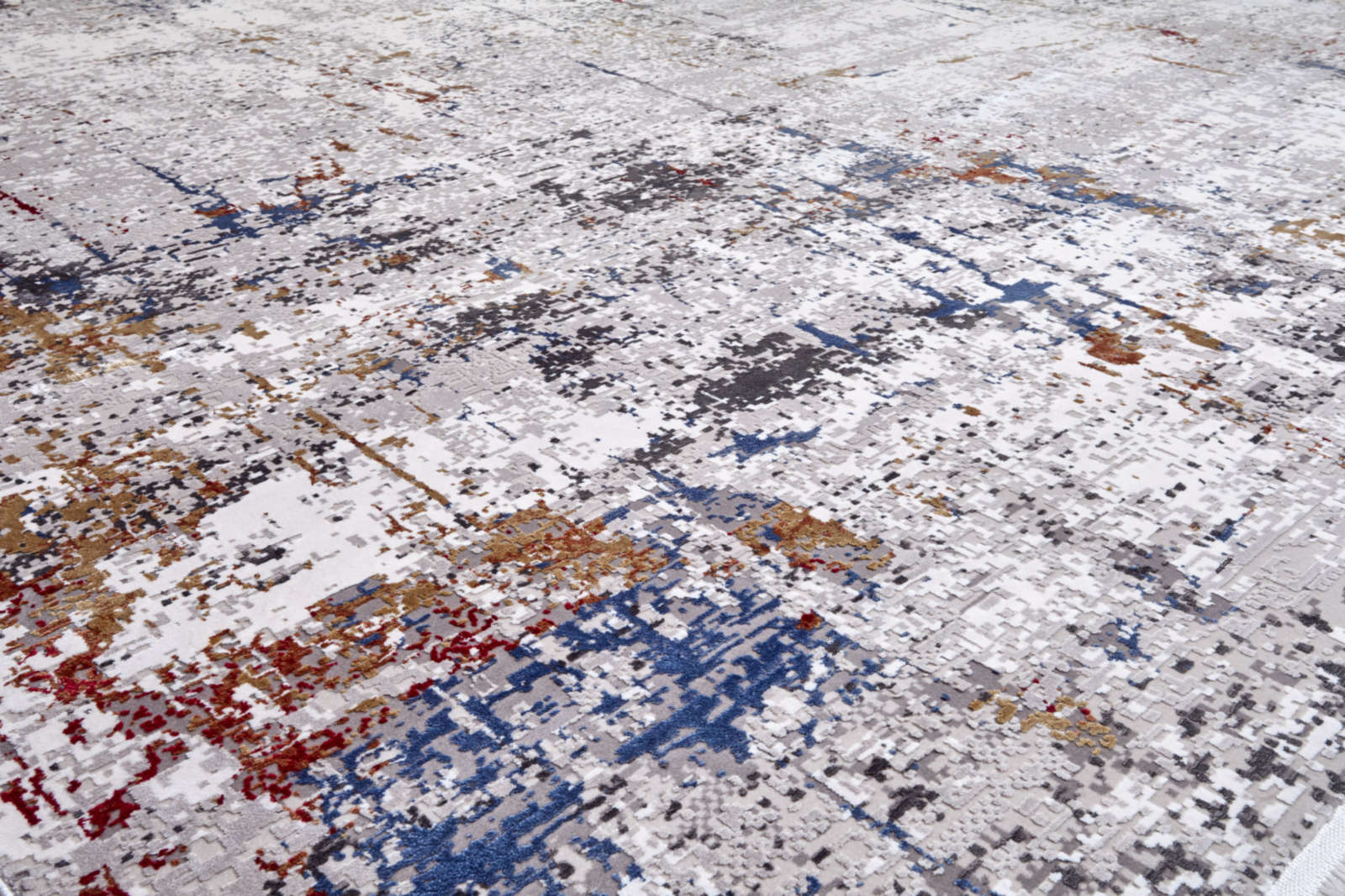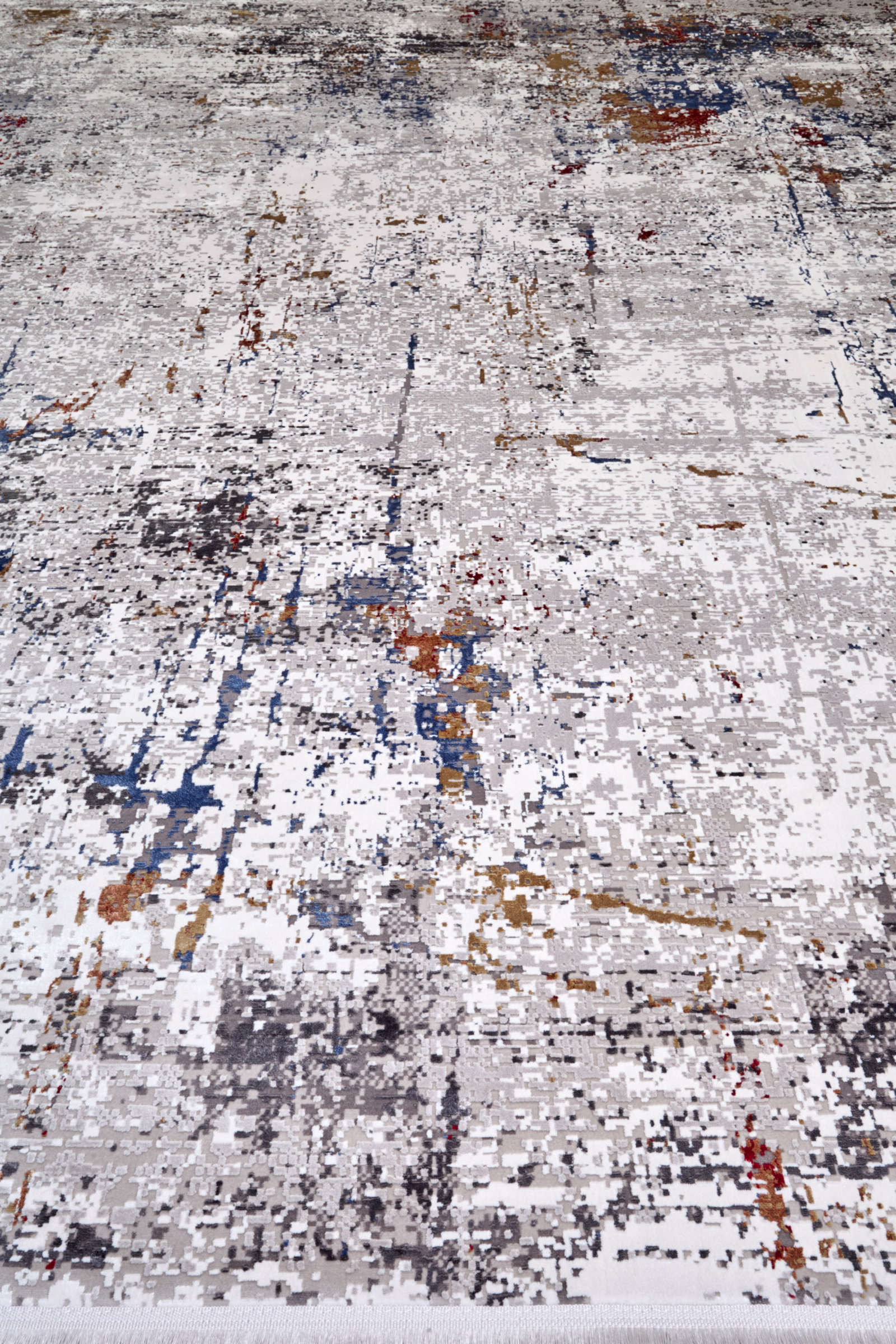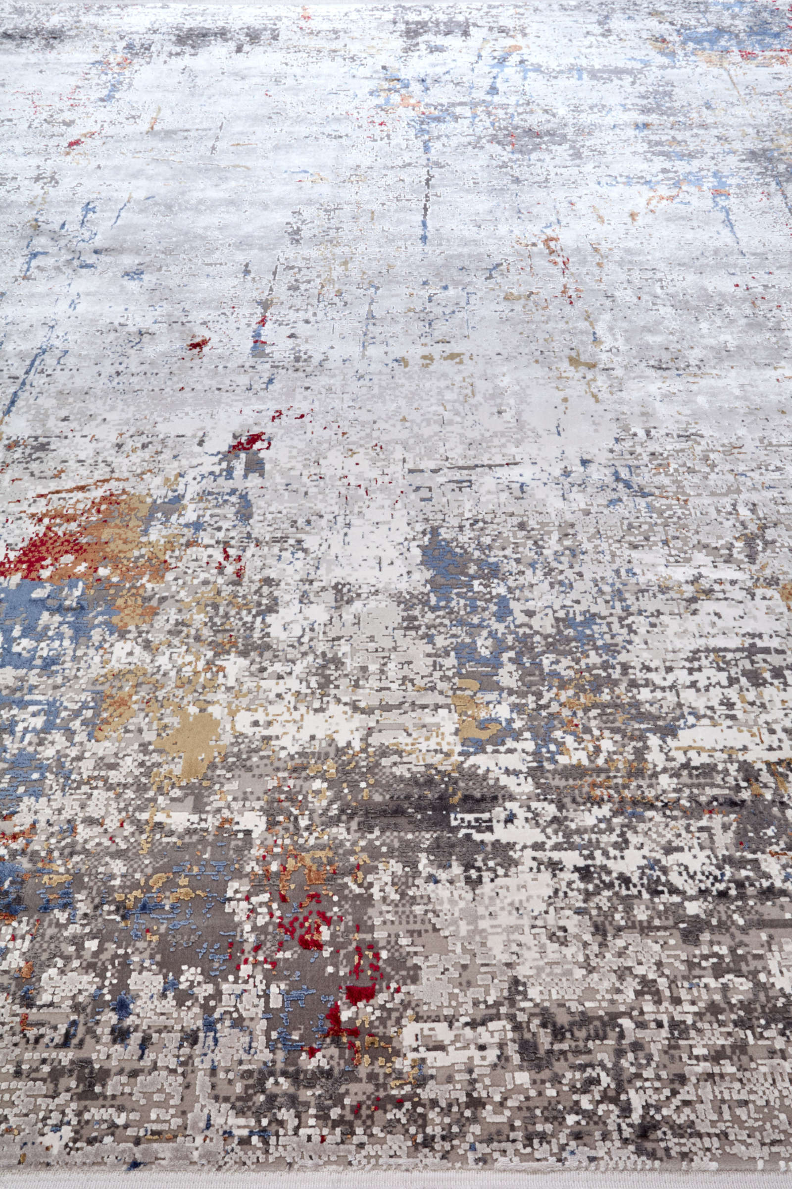 Этот ковёр словно абстрактная картина: мазки серого, синего, охры и алого переплетаются, как следы времени на стенах старого города. Он хранит дыхание улиц после дождя, где каждое пятно — ожившая история, а хаос превращается в гармонию.