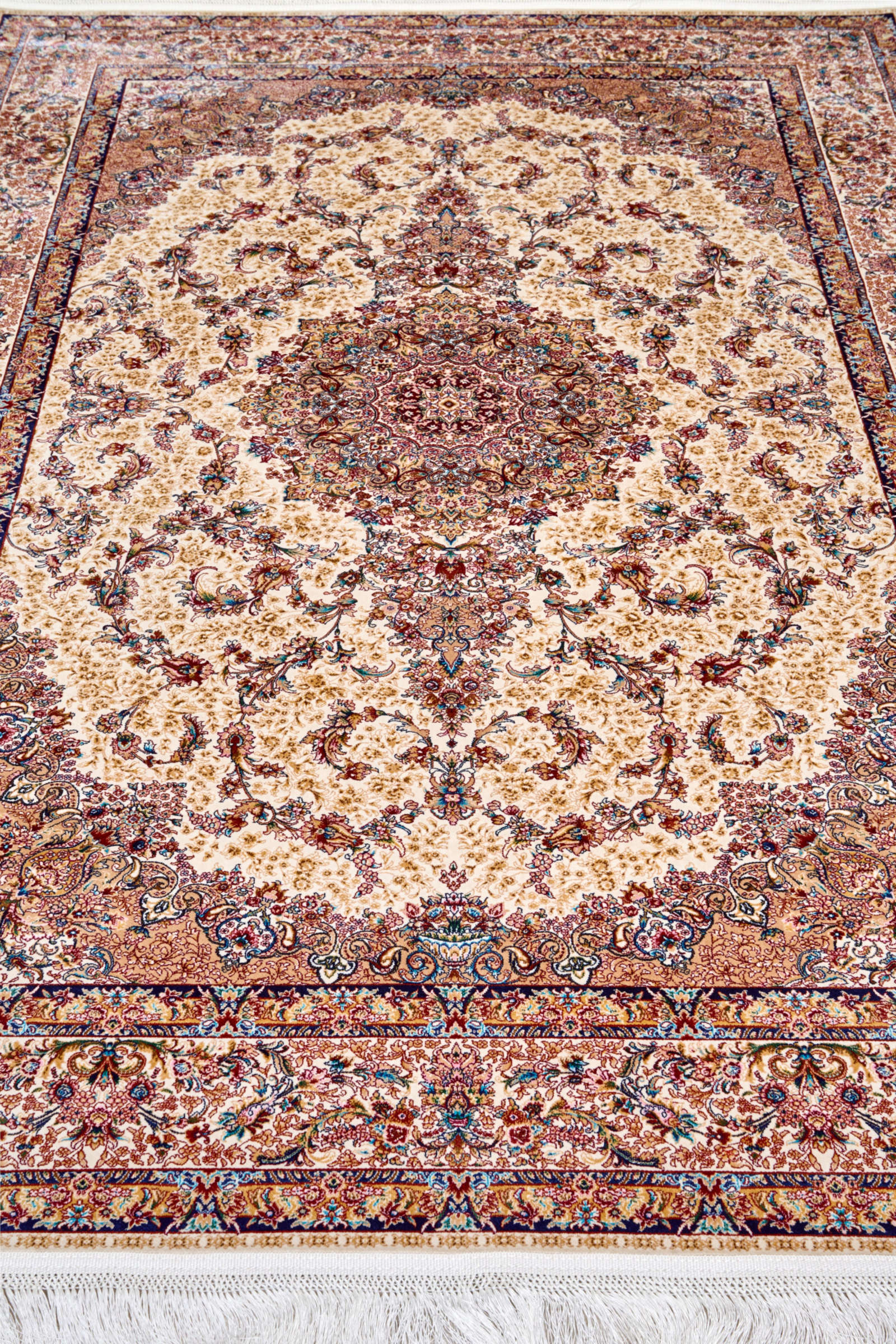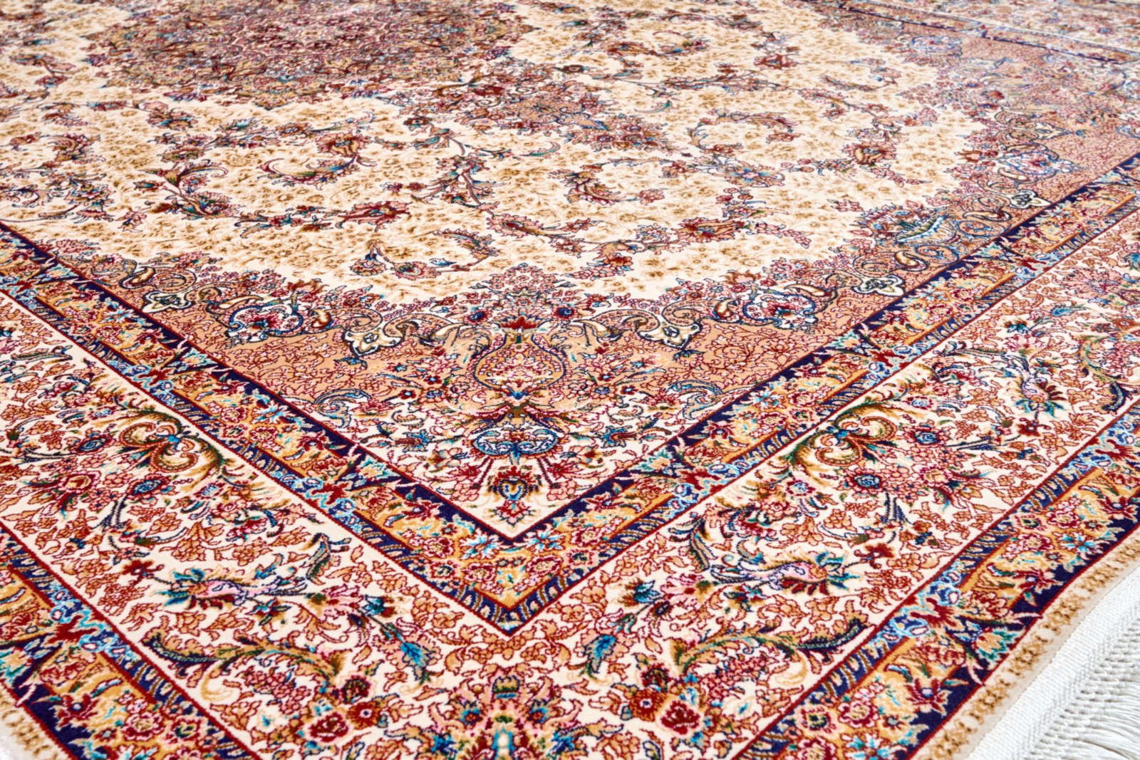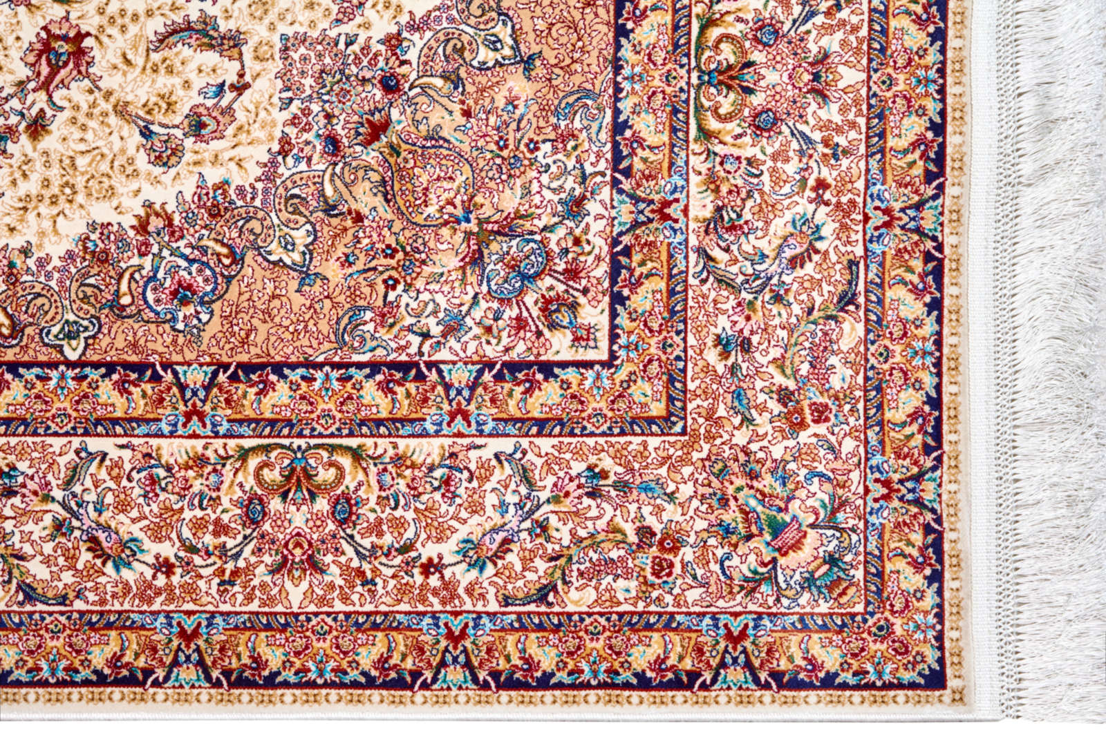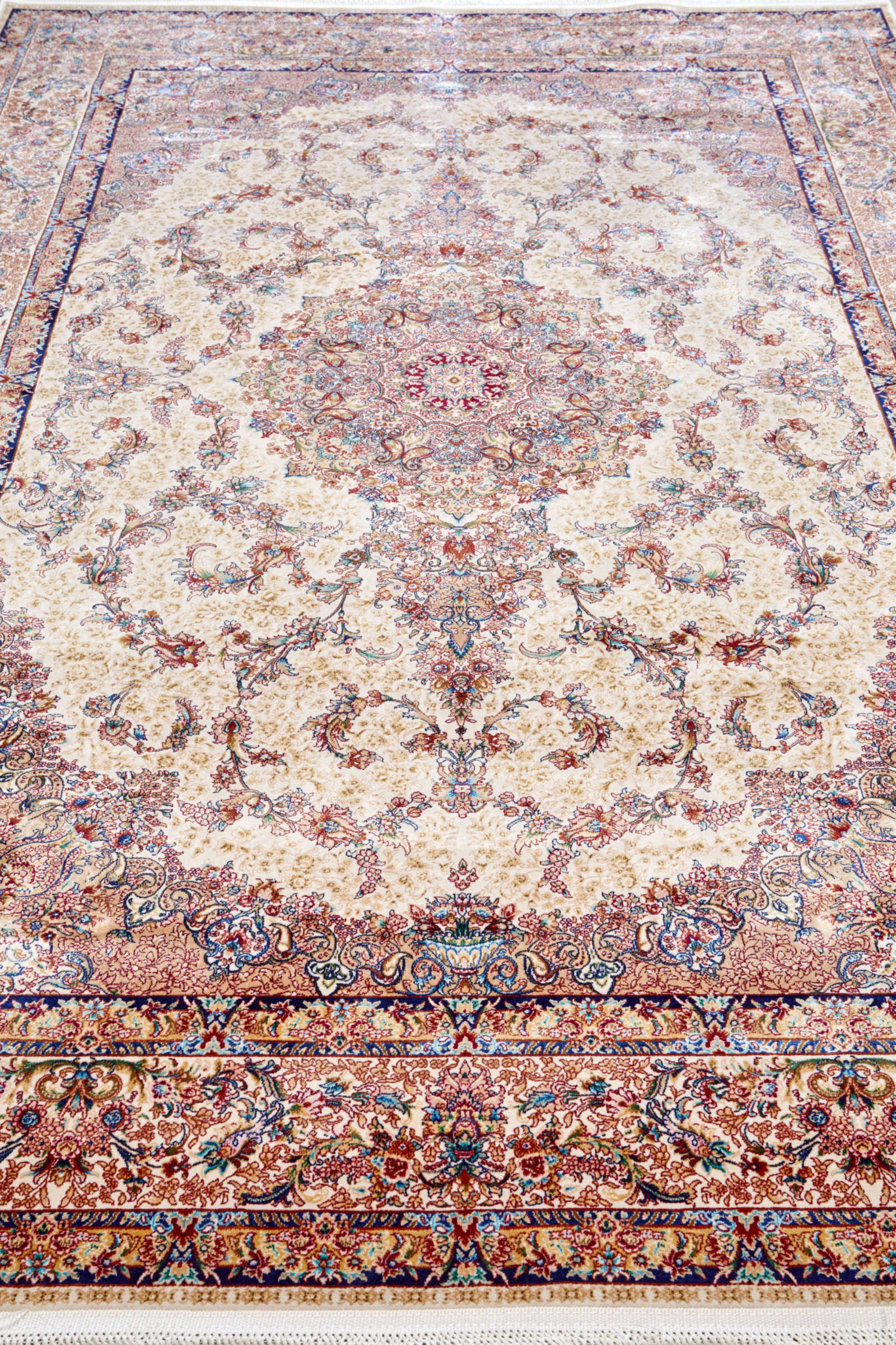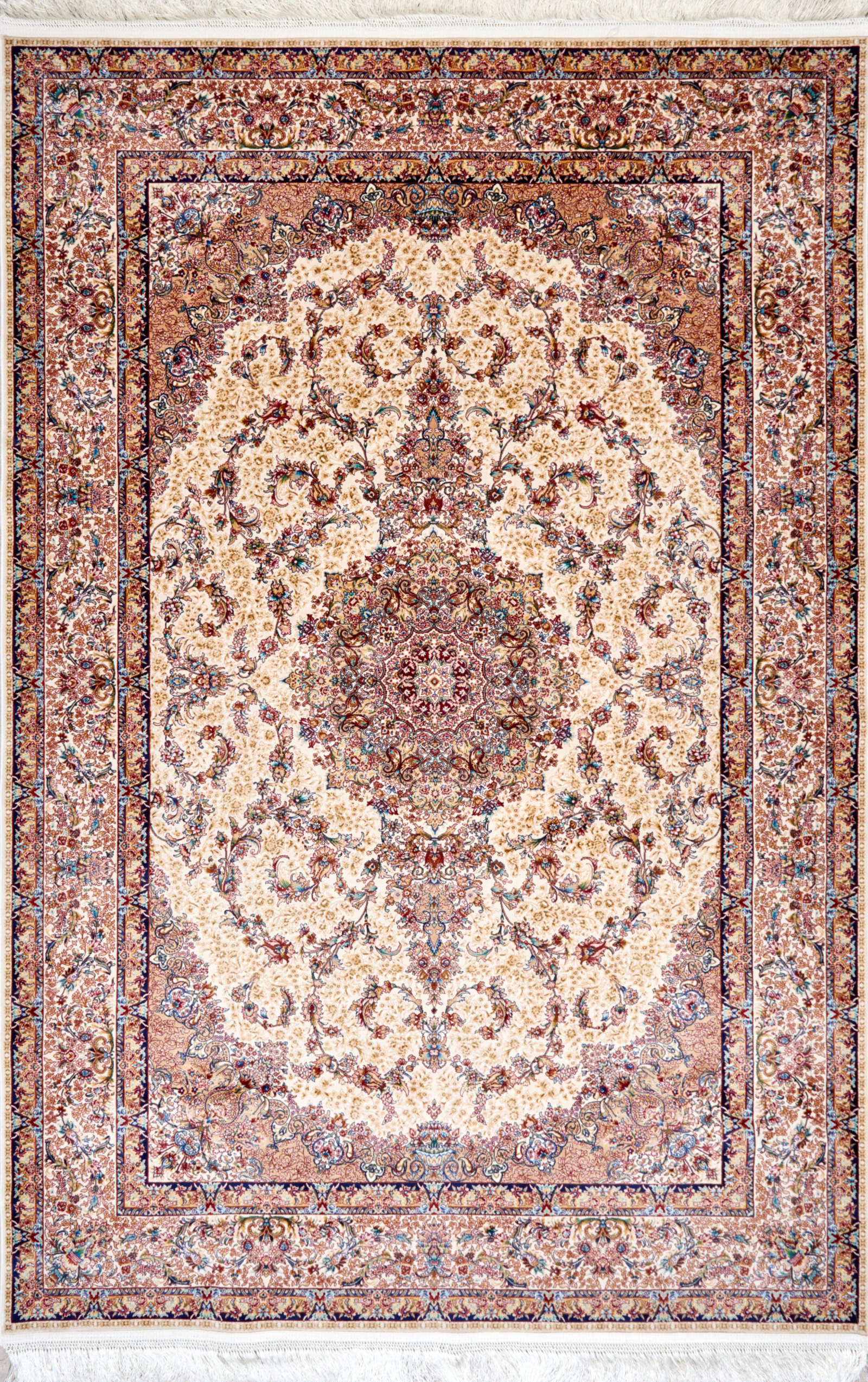 Этот ковёр — настоящий гимн восточному искусству. Его медальон в центре напоминает драгоценный камень, окруженный тончайшими узорами. Палитра сочетает тёплые кремовые оттенки с насыщенным бордовым, создавая гармонию и глубину. Такой ковёр станет главным акцентом гостиной или кабинета, придав пространству атмосферу роскоши. Он идеально сочетается с деревянной мебелью, позолоченными деталями и мягким светом люстр. В спальне он добавит торжественности и уюта, а в столовой подчеркнет атмосферу гостеприимства. Этот ковёр словно переносит в старинные дворцы Востока, где каждый элемент был символом изобилия и красоты.