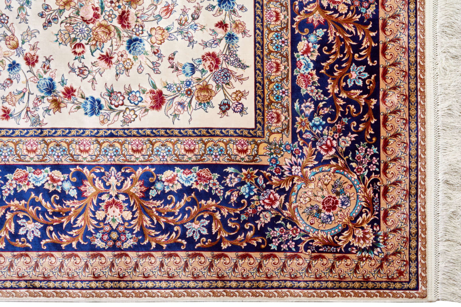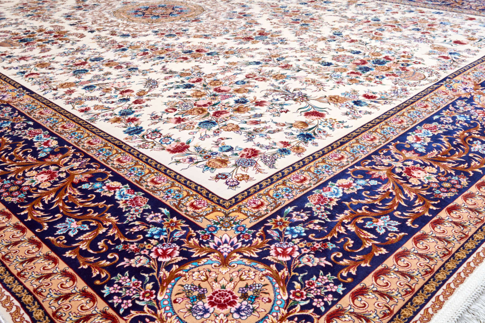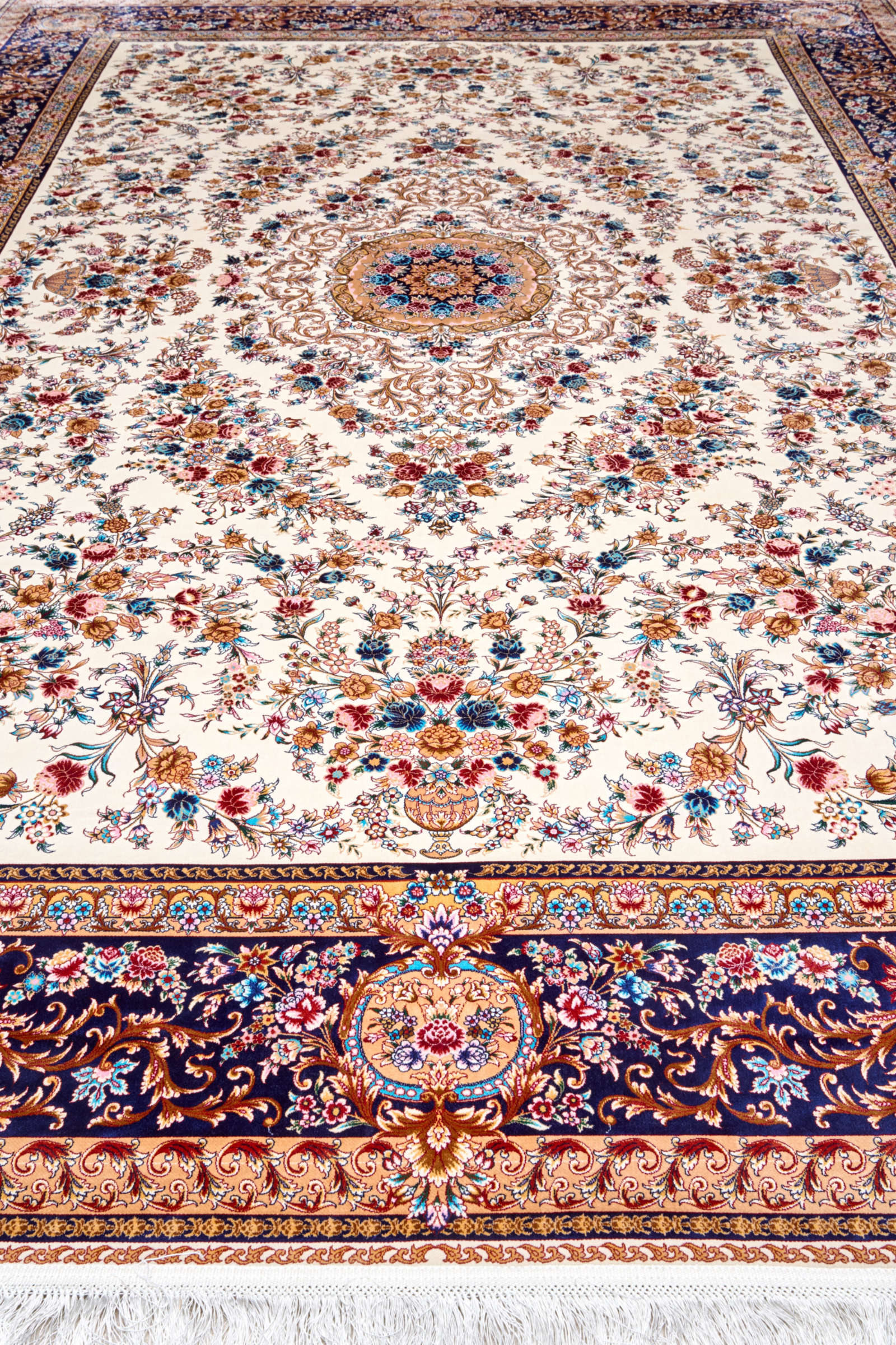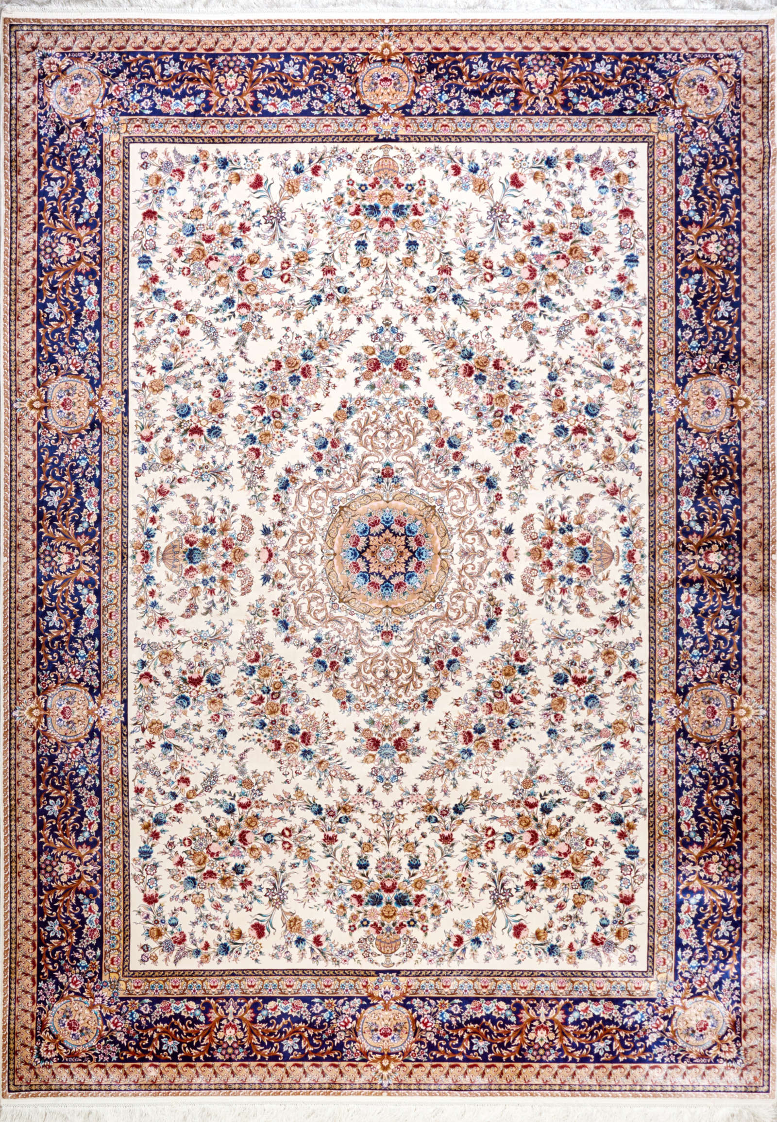 Перед вами ковёр, в котором соединились древняя восточная традиция и поэзия природы. Его светлое поле расцветает орнаментами, будто сад, полный благоухающих роз и жасмина. Центральный медальон похож на таинственный цветок, раскрывающий лепестки в тишине ночи. Каждый элемент узора кажется живым: витиеватые ветви переплетаются с бутонами, создавая ощущение бесконечного движения. Синий бордюр обрамляет композицию, словно небесная грань, удерживающая это богатство в рамках гармонии. Такой ковёр переносит в атмосферу дворцовых залов, где каждый шаг по мягкому ворсу напоминал прогулку по райскому саду. Он подойдёт для классического интерьера, придаст ему благородства и торжественности, станет главным акцентом комнаты, вокруг которого легко выстроить целостный и утончённый образ пространства.