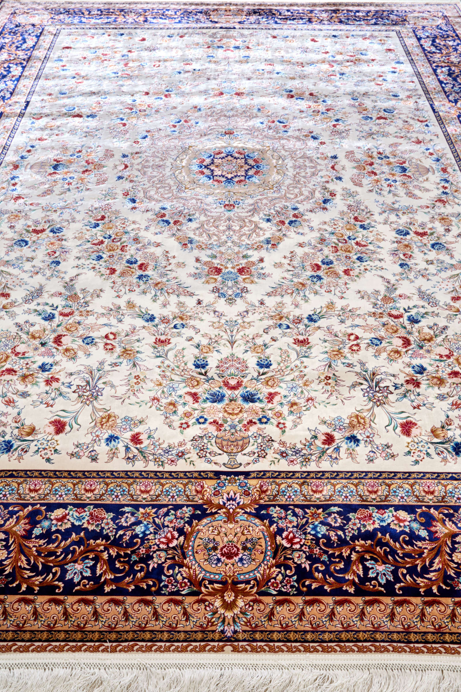Этот ковёр напоминает о персидских садах, где каждый цветок вплетён в гармонию узора. Светлый фон подчёркивает изящество тонких линий, а насыщенный синий бордюр словно обрамляет целый мир орнаментов, превращая его в картину, полной жизни и вдохновения.