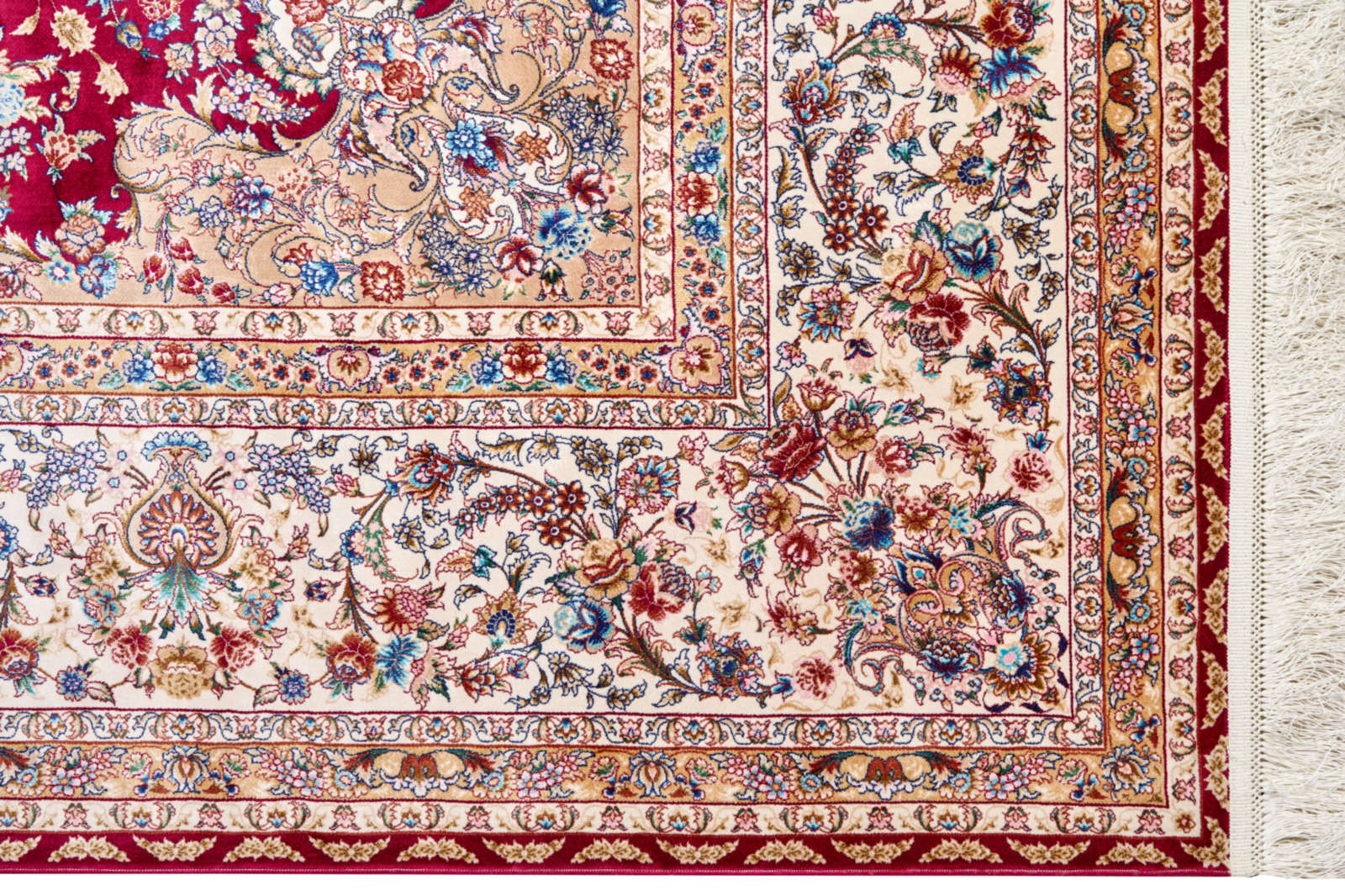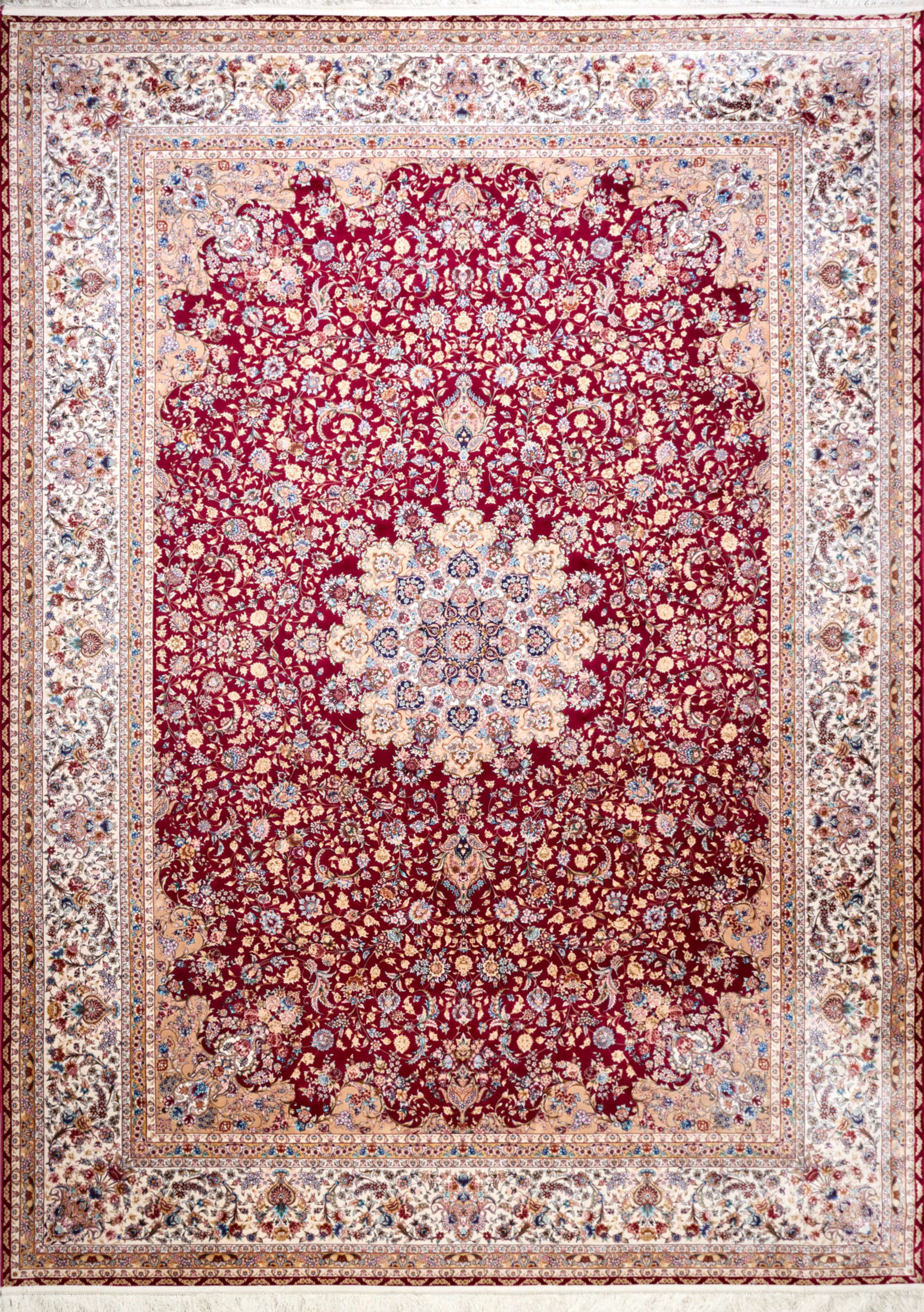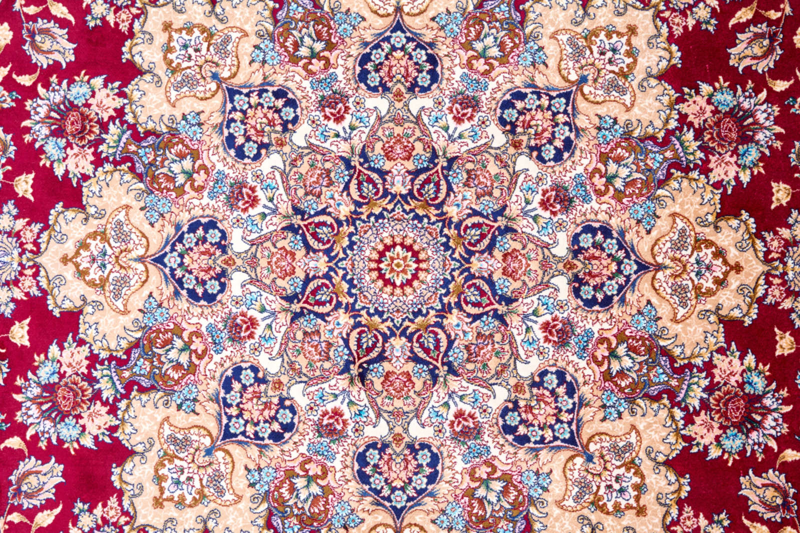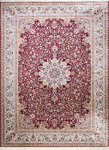Этот круглый ковёр словно создан для того, чтобы стать центром композиции в интерьере. Глубокий бордовый цвет напоминает роскошные ткани дворцов, а сложный орнамент в виде мандалы будто открывает окно в бесконечность. Изящные переплетения цветов и ветвей отсылают к древним персидским традициям, где каждый элемент символизировал гармонию и благополучие. Ковёр будет эффектно смотреться в гостиной с классической мебелью, подчеркнёт эстетику кабинета или создаст атмосферу торжественности в столовой. Его круглая форма добавит мягкости пространству, уравновесив строгие линии интерьера.