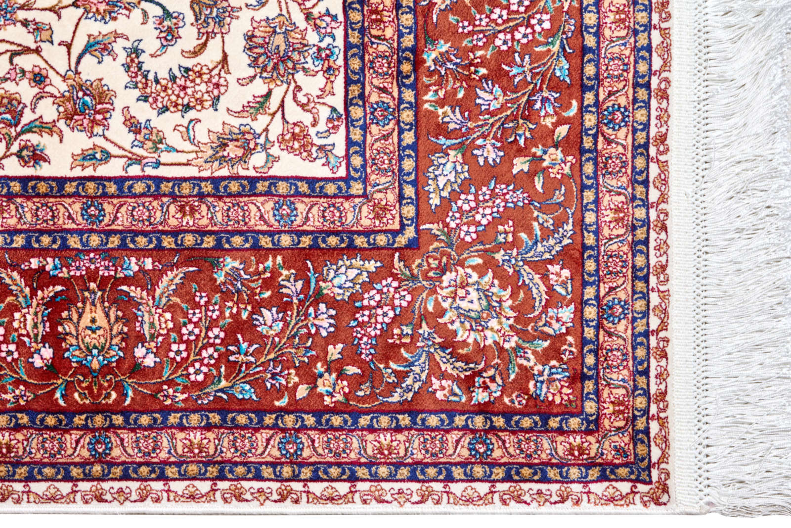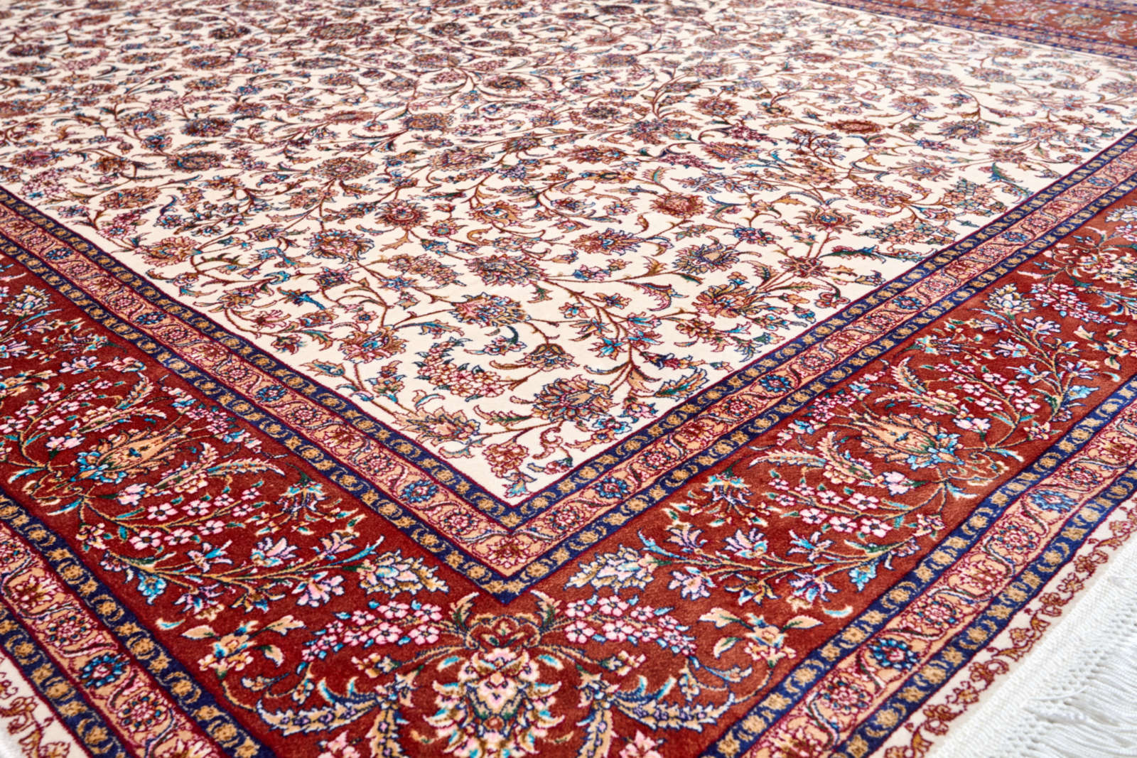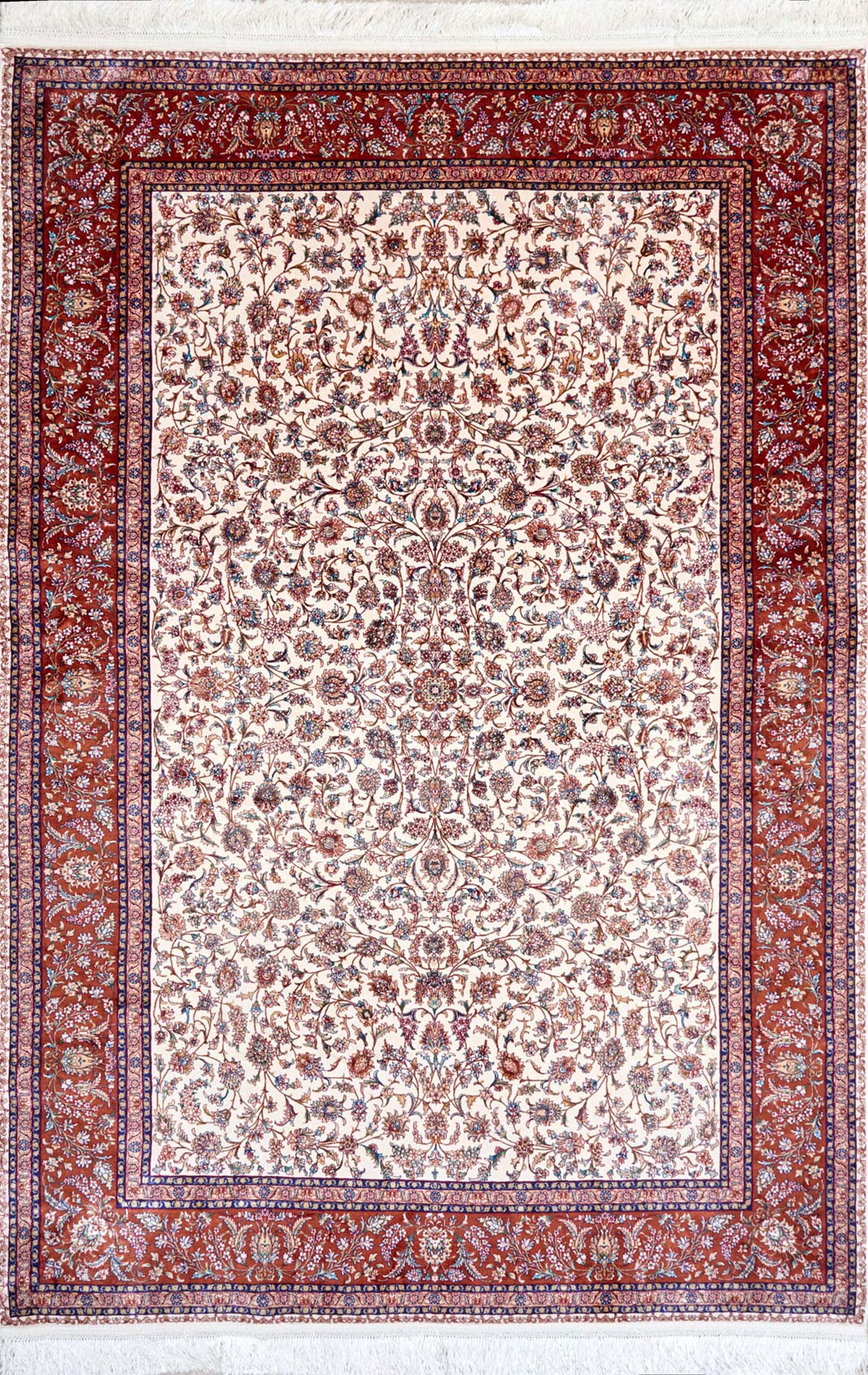 Светлое поле ковра украшено изящными узорами, а красная кайма обрамляет композицию, словно рама картину. Он хранит дыхание традиции и наполняет интерьер теплом и торжественностью.