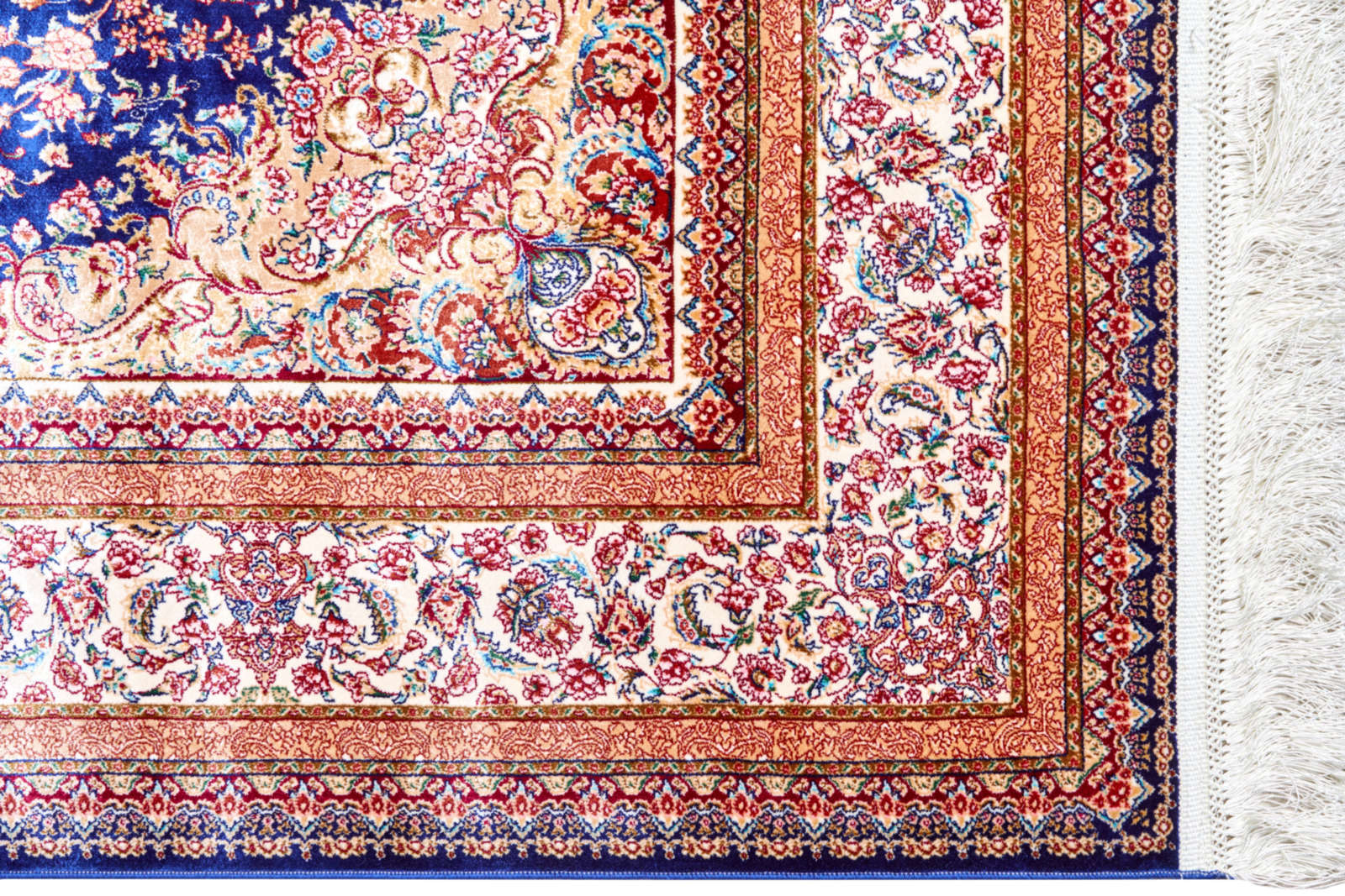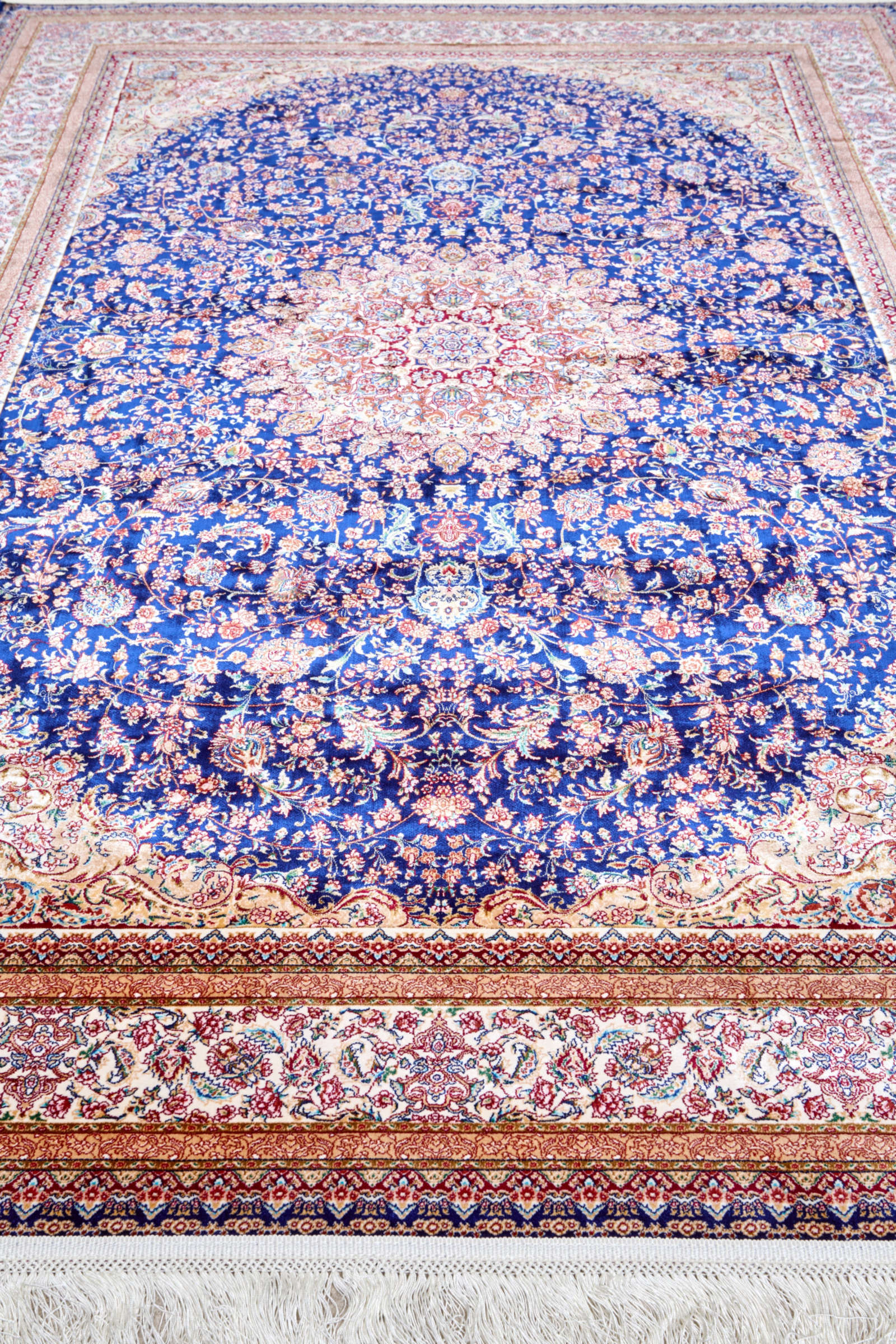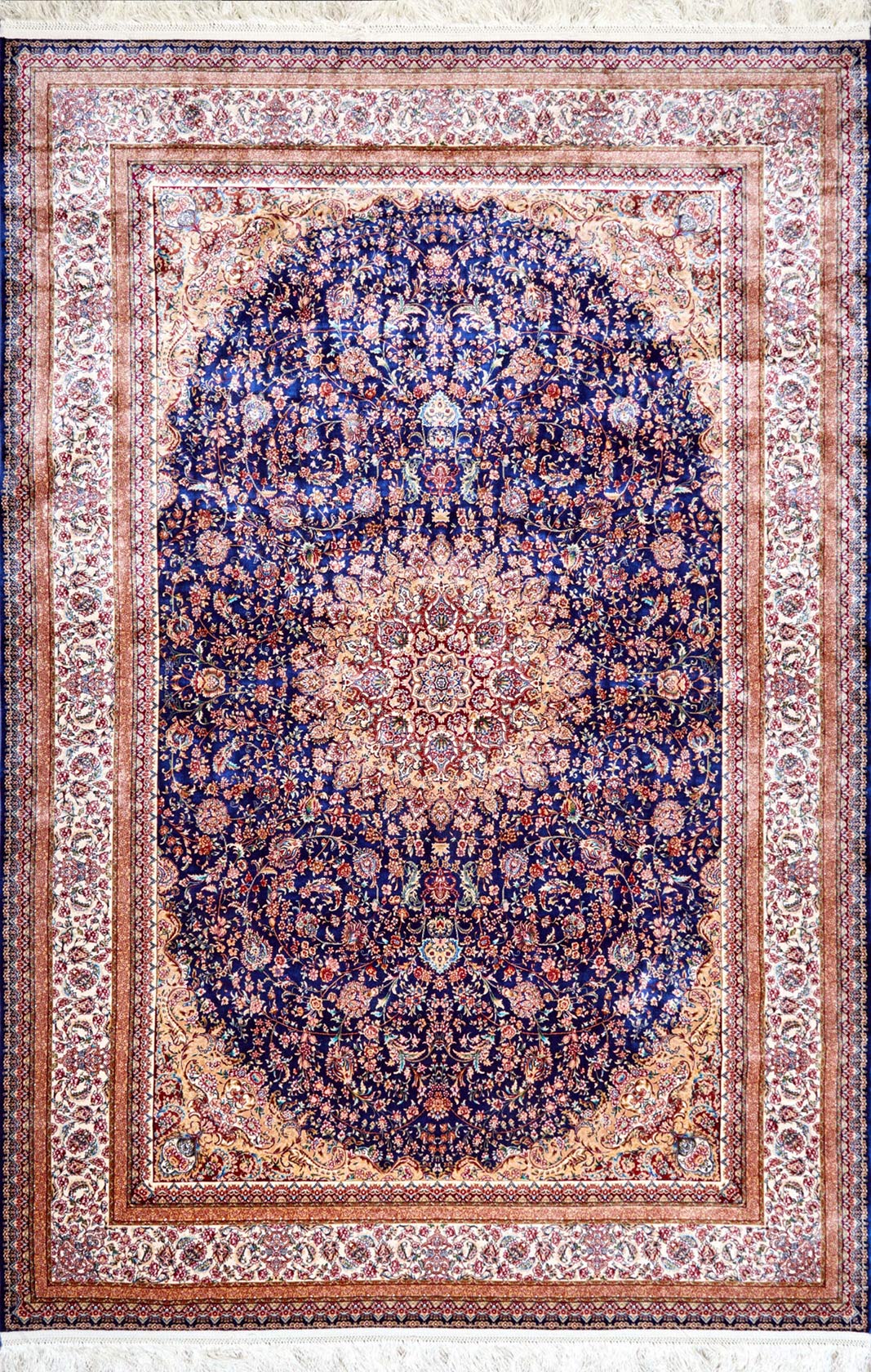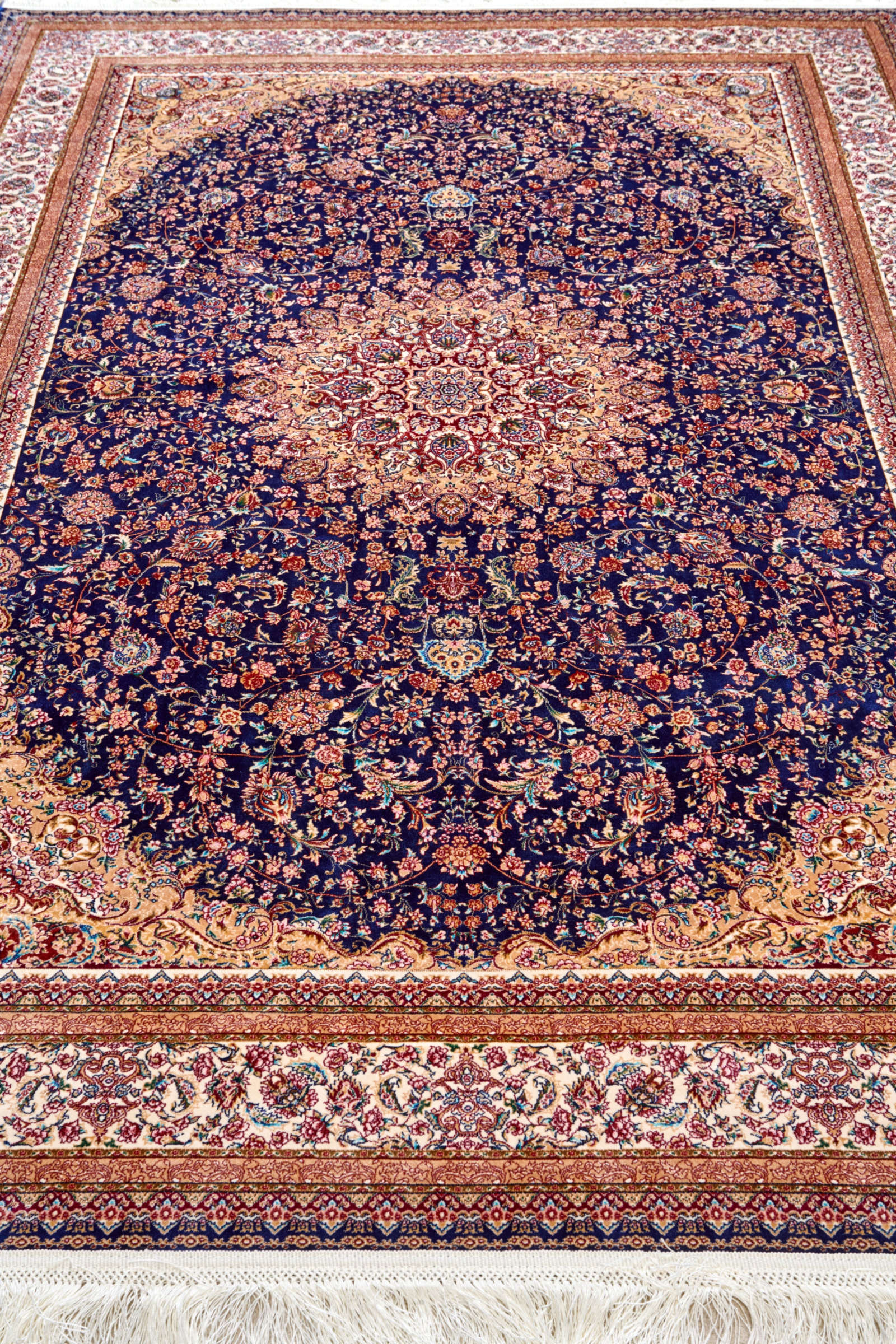 Этот ковёр словно небесное полотно, где в центре сияет звезда-медальон. Тёмно-синий фон напоминает бездонное ночное небо, а сложные узоры — переплетения созвездий. Контрастные оттенки бордового и кремового подчёркивают богатство композиции. Такой ковёр станет символом изысканности и роскоши. В гостиной он создаст торжественную атмосферу, а в кабинете подчеркнёт статус владельца. Его сложный орнамент гармонирует с мебелью из натурального дерева, позолоченными элементами и светом хрустальных люстр. Этот ковёр — словно приглашение в мир гармонии и вечных традиций Востока.