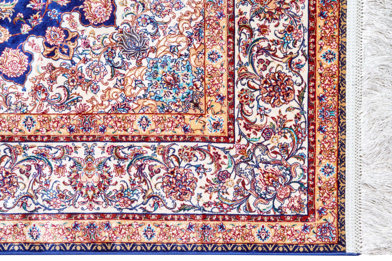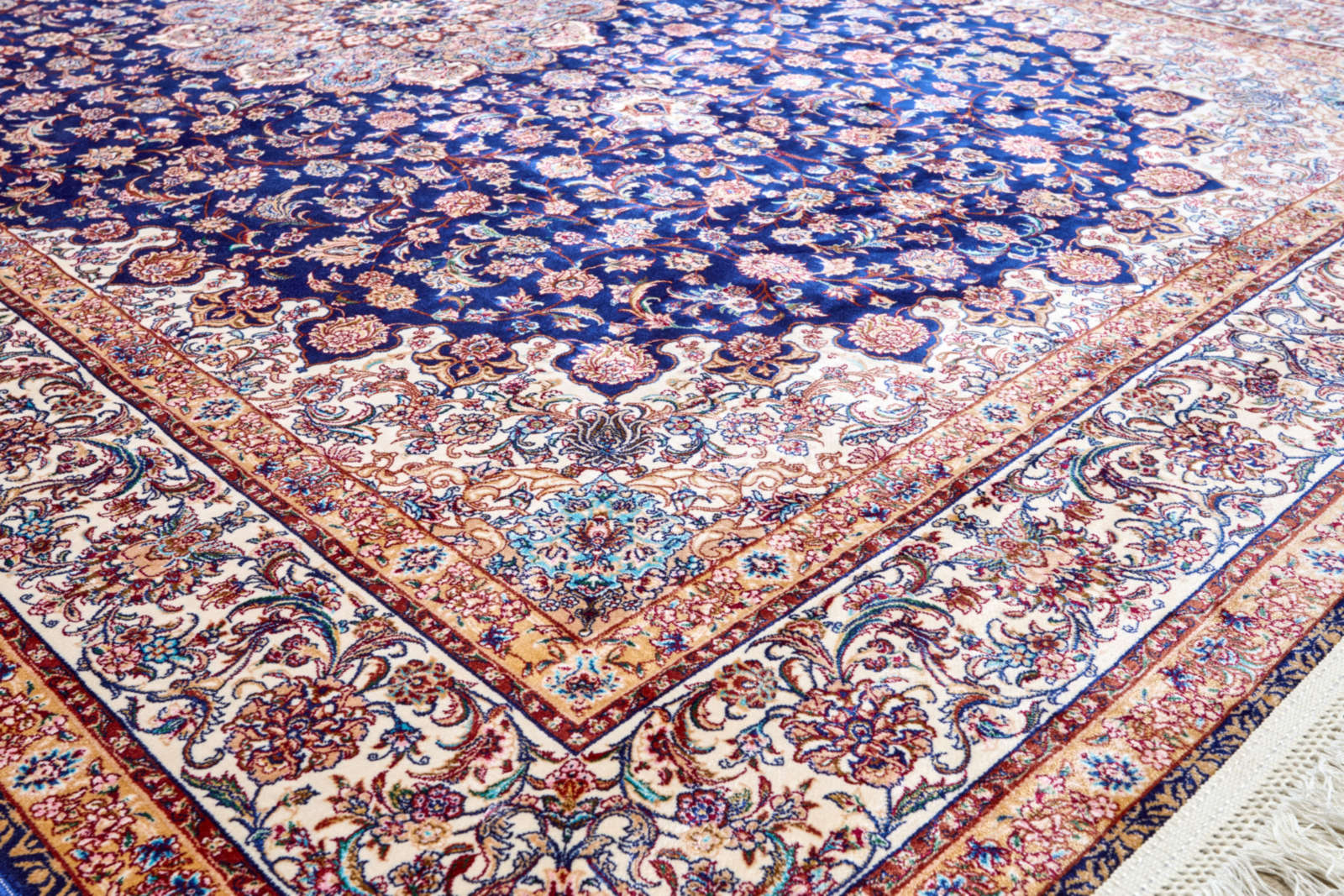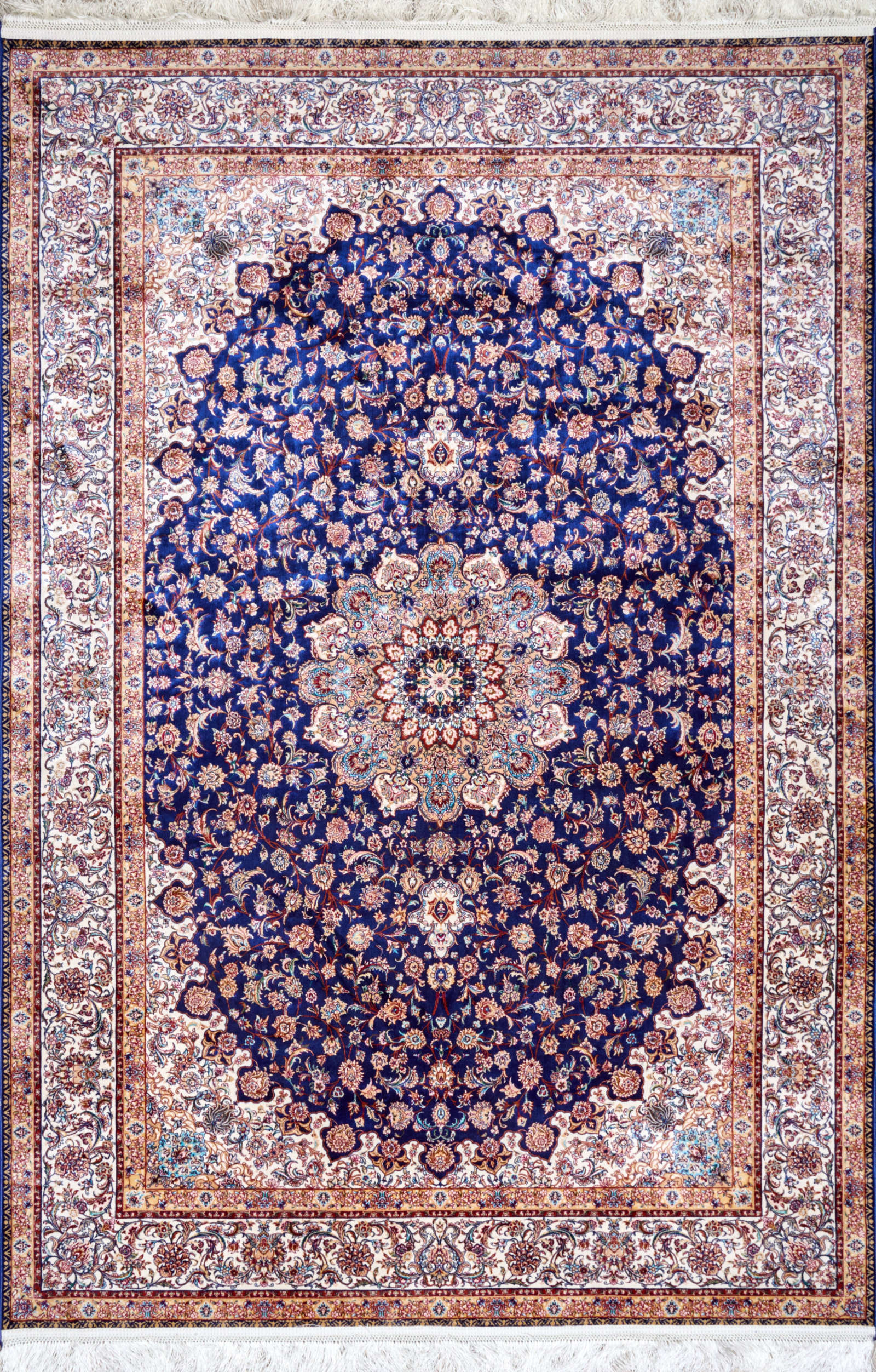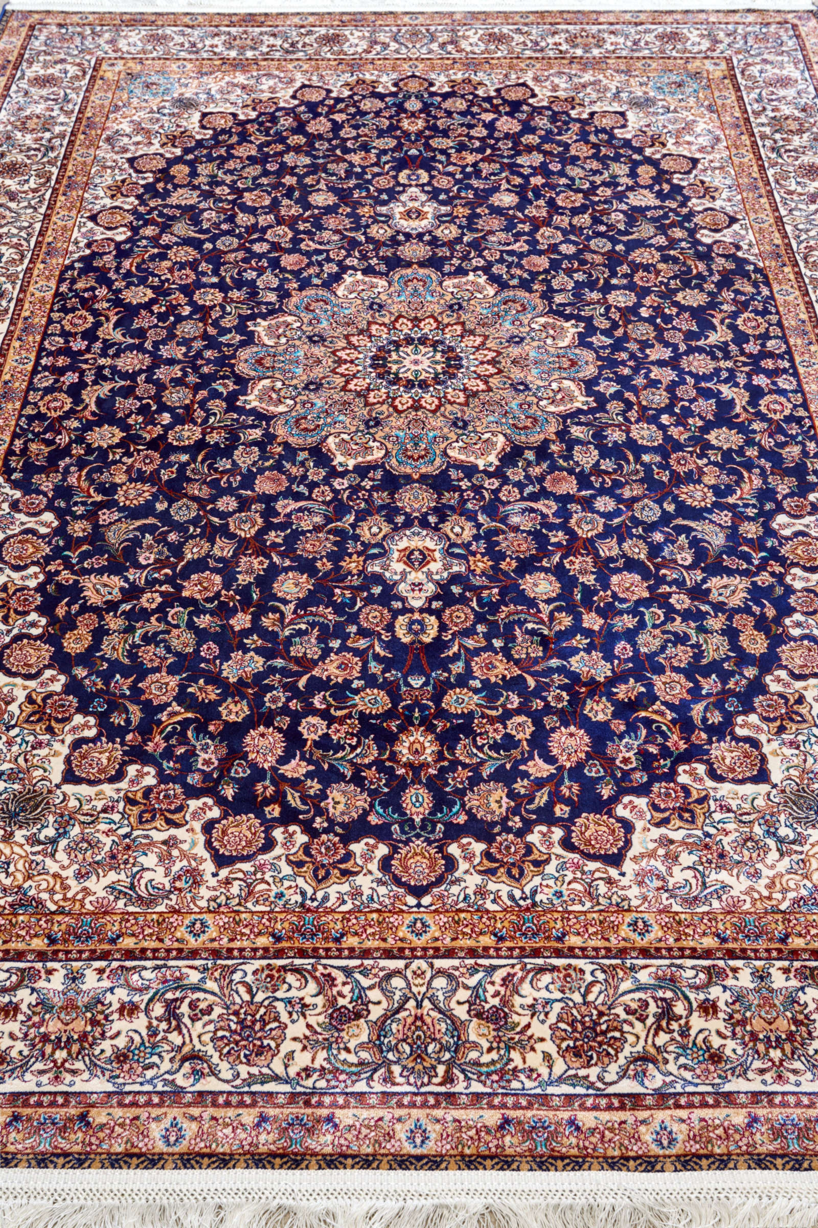 Этот ковёр напоминает звёздное небо Востока, где каждое созвездие вплетено в узор. Его глубокий синий фон — как бархат ночи, а цветочные мотивы на нём мерцают, словно звёзды, оживляя пространство. В центре расположен крупный медальон, напоминающий небесную розу, раскрывающую лепестки в бесконечность. Рисунок поражает точностью и ритмом: каждый цветок, каждый завиток становится частью единого космического орнамента. Такой ковёр наполняет интерьер особой энергией — он одновременно торжественный и тёплый, строгий и поэтичный. В гостиной он создаст атмосферу вечера при свете свечей, в кабинете подчеркнёт сосредоточенность и глубину мысли. Этот ковёр несёт в себе аллюзию на бесконечность вселенной и напоминает, что искусство может быть проводником в мир гармонии и созерцания.