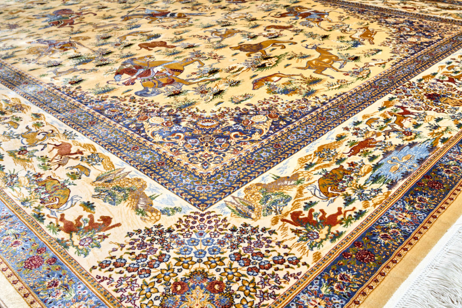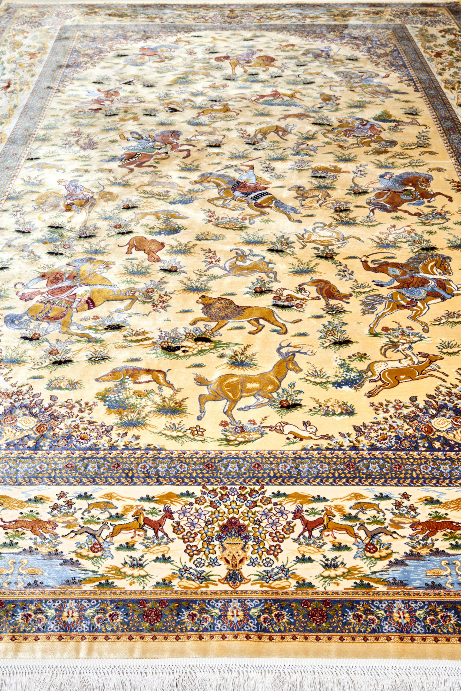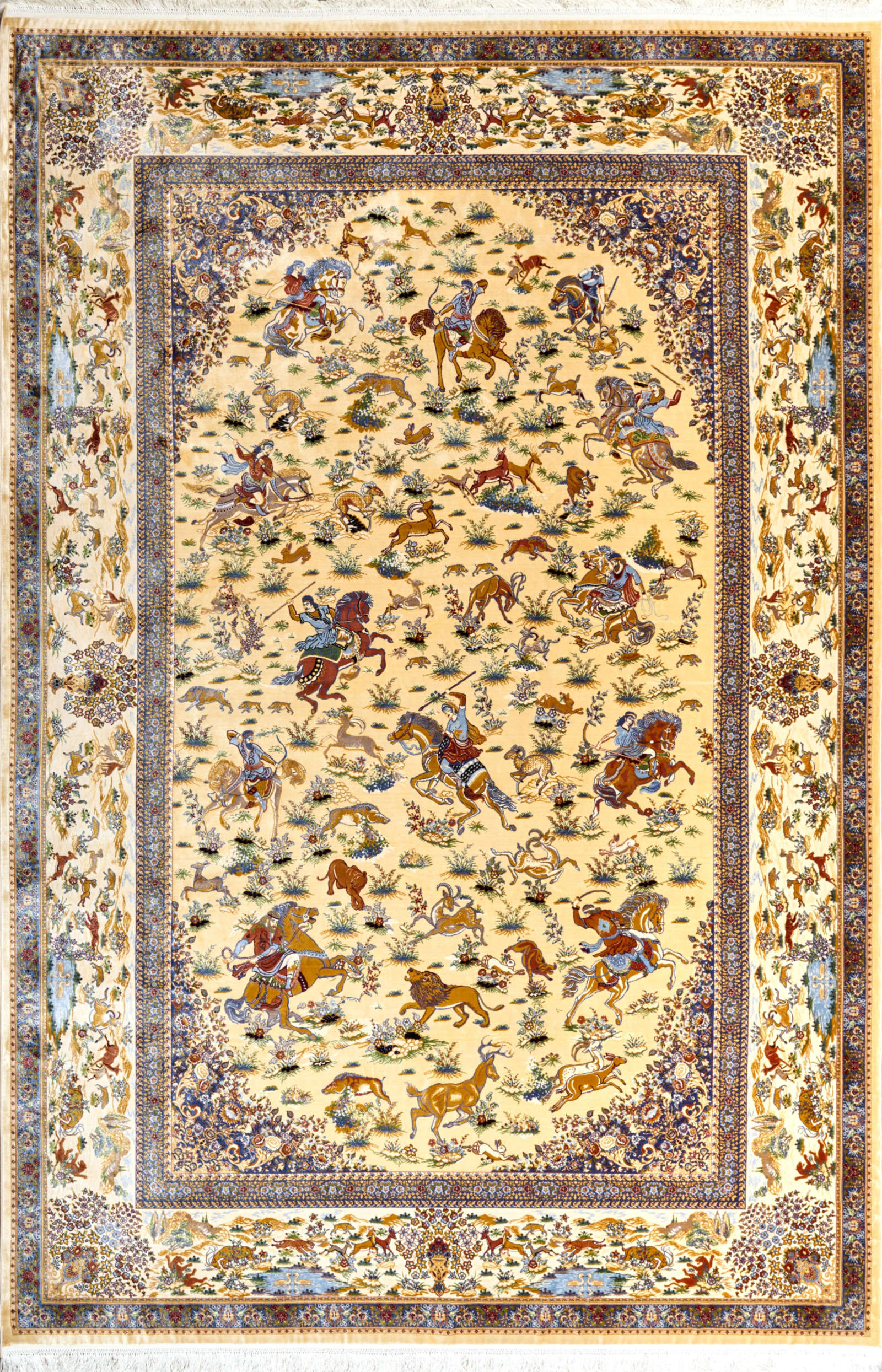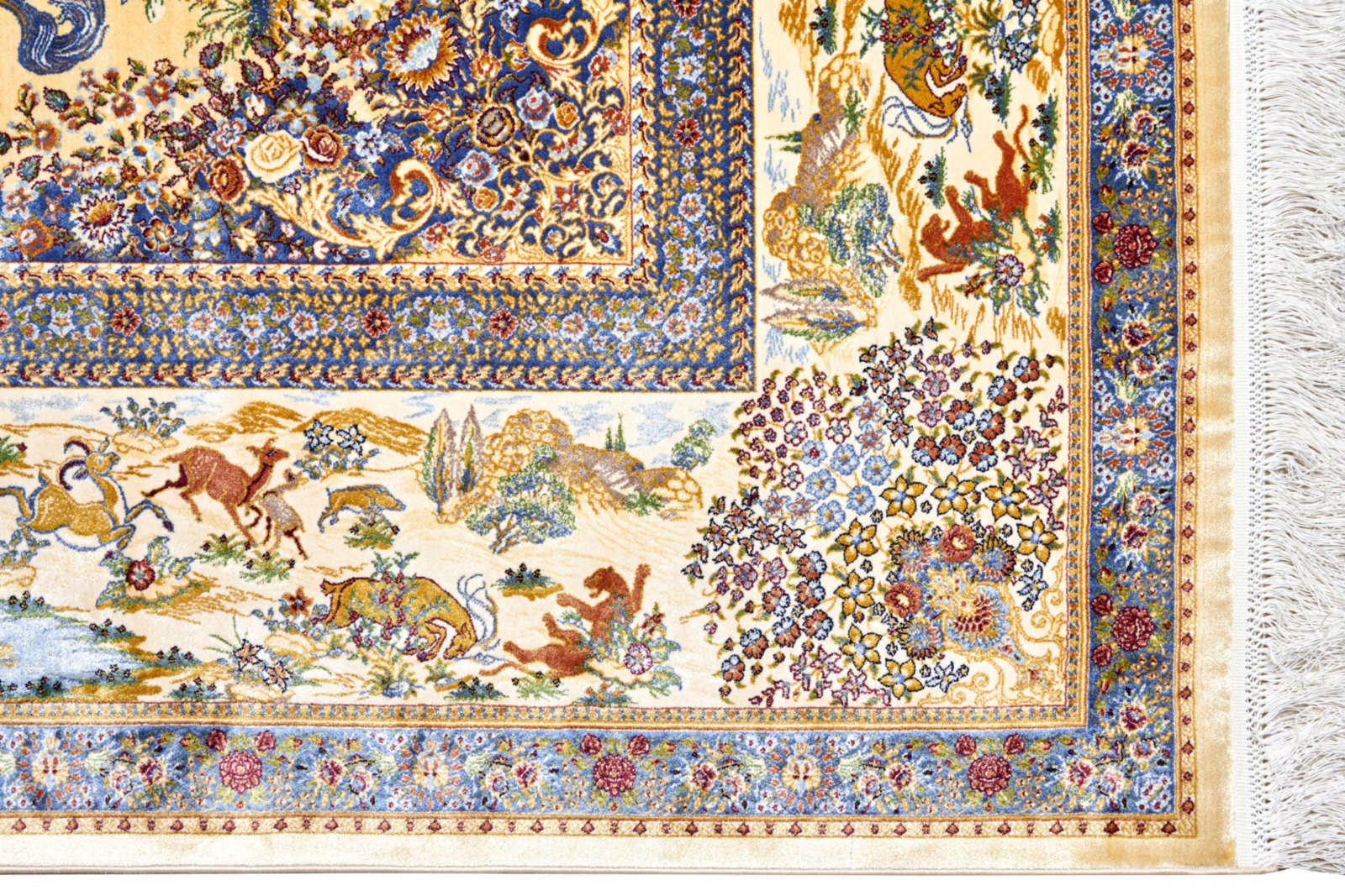 Этот ковёр будто сошёл со страниц восточной сказки — в его центре сияет овальный орнамент, выполненный в тончайших оттенках бледно-жёлтого, словно выцветшего от времени золота. Обрамление ковра — жемчужно-серое, мягкое и приглушённое, напоминает о тихом туманном утре в покрытом росой саду.