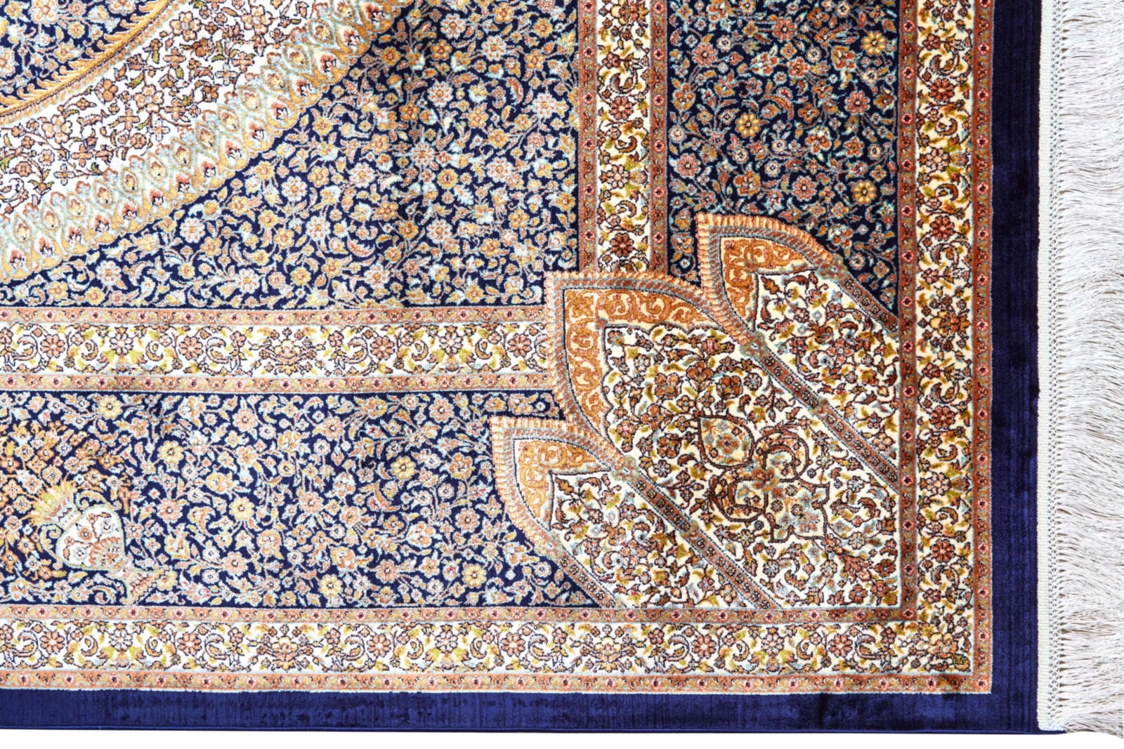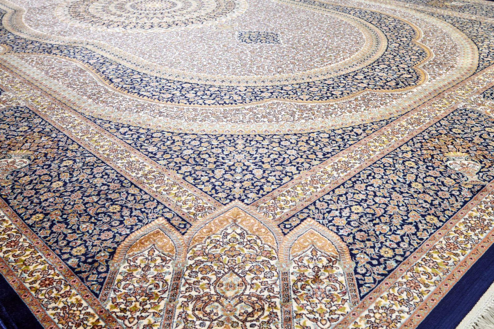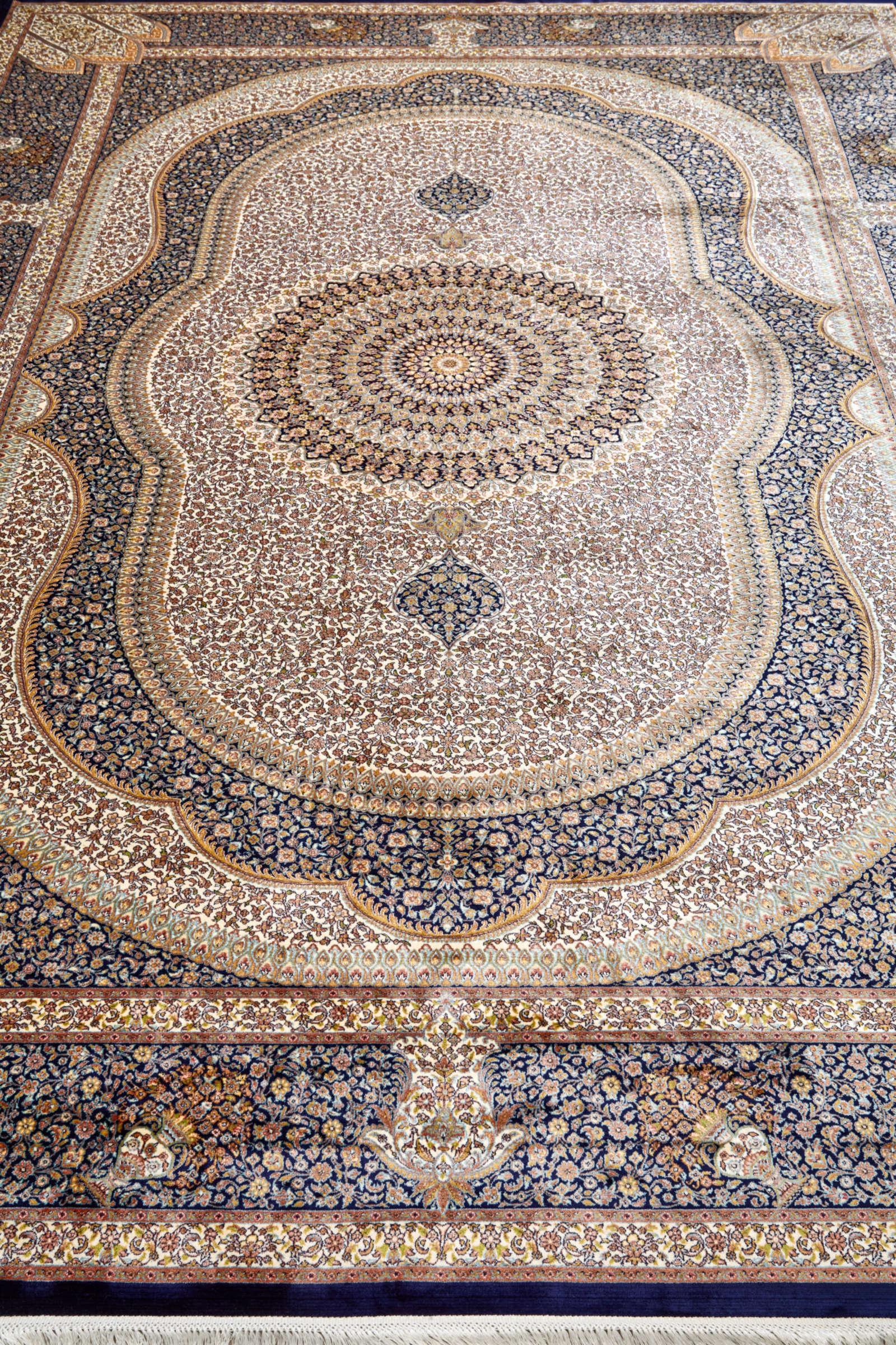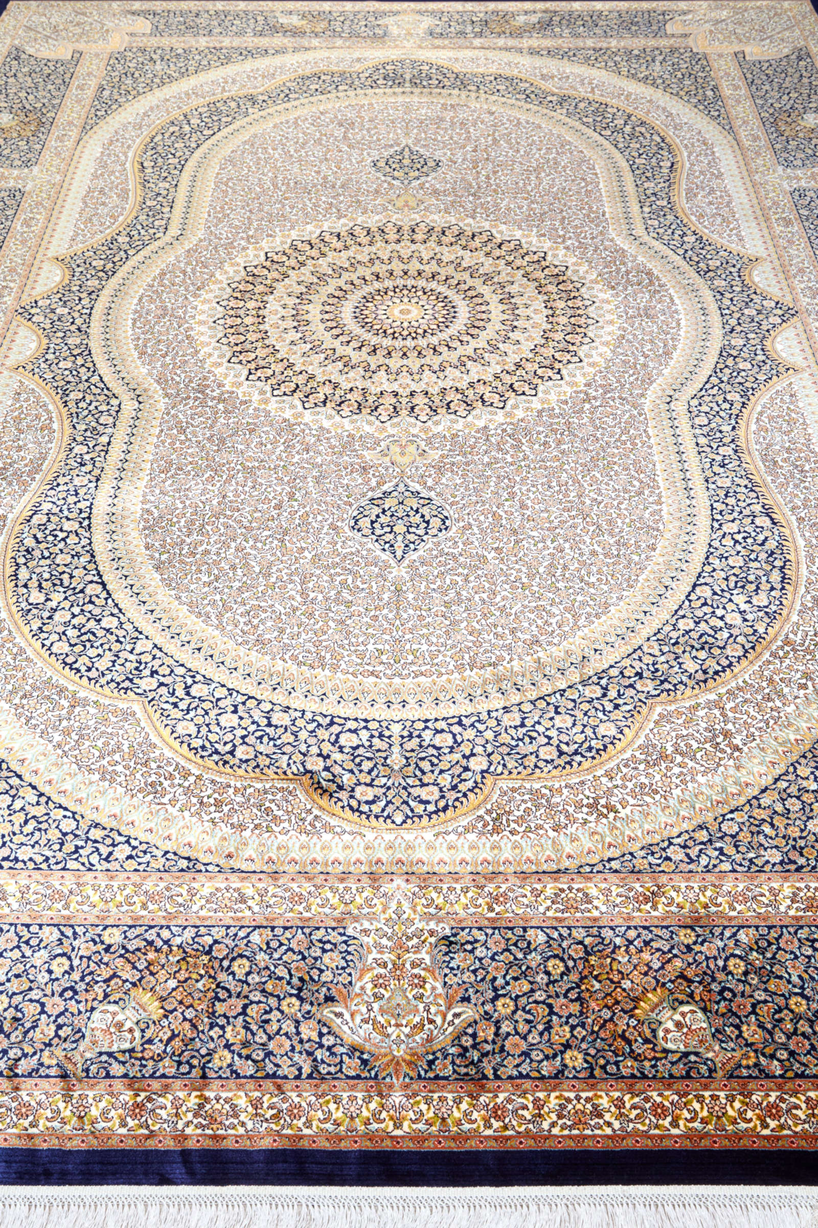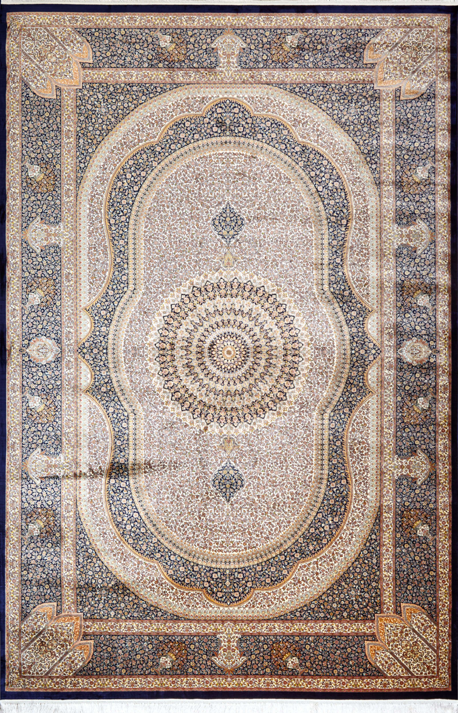 Этот ковёр стилистически перекликается с антикварными тканями Востока: в центре — овальный узор насыщенного тёмно-синего цвета, глубокого и спокойного, как вечернее небо. Он словно собирает вокруг себя пространство, создавая визуальный фокус. По краям — мягкие бежево-песочные тона, напоминающие светлый бархат или выгоревший на солнце шёлк.