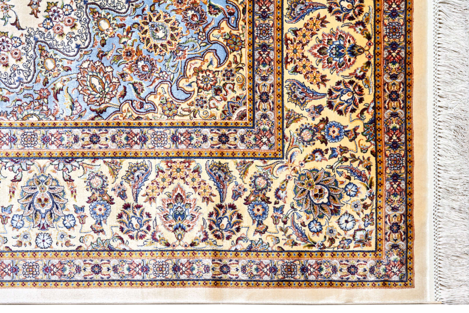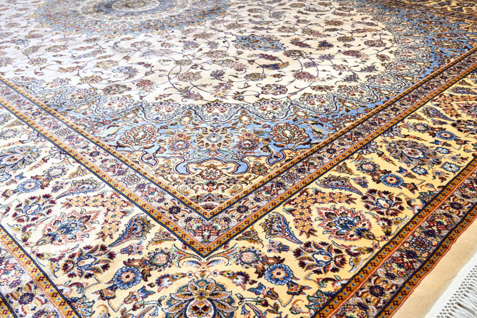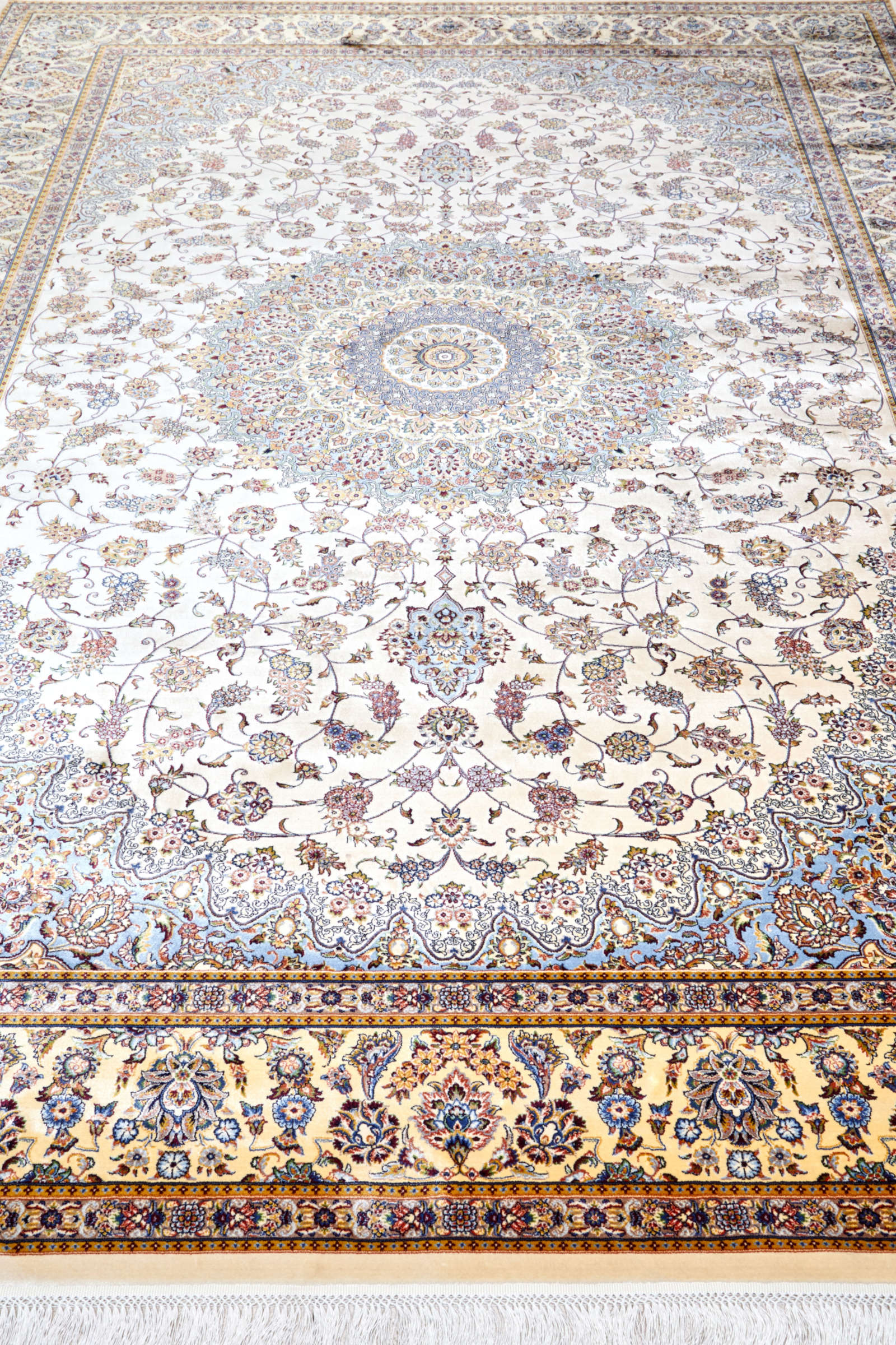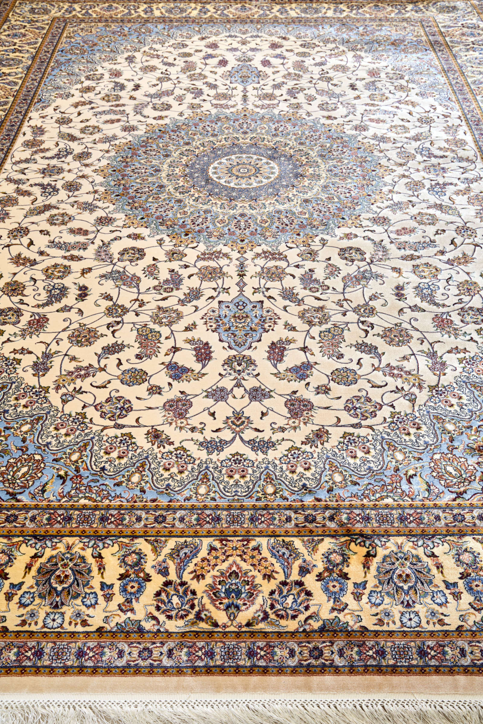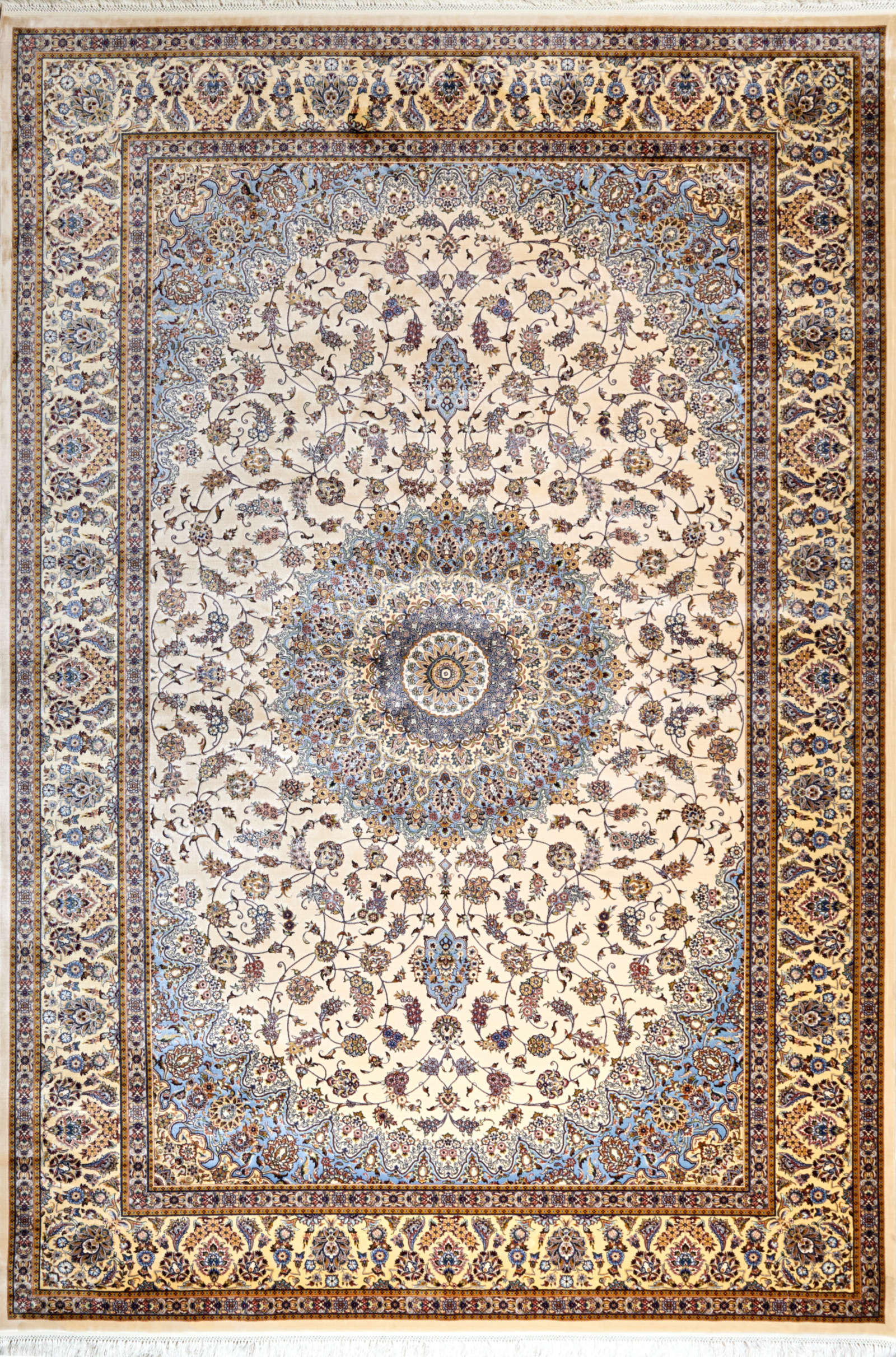 Перед вами не просто ковёр — это персидский орнаментальный рассказ, здесь каждый завиток хранит древнюю тайну. Светлый фон — как пергамент, на котором рука мастера написала бесконечную симфонию из цветочных мотивов, плавно переходящих в овальный медальон в центре. Золотистые, серые и бордовые акценты создают ощущение тёплого свечения, как будто ковёр озарён мягким светом старинной лампы.