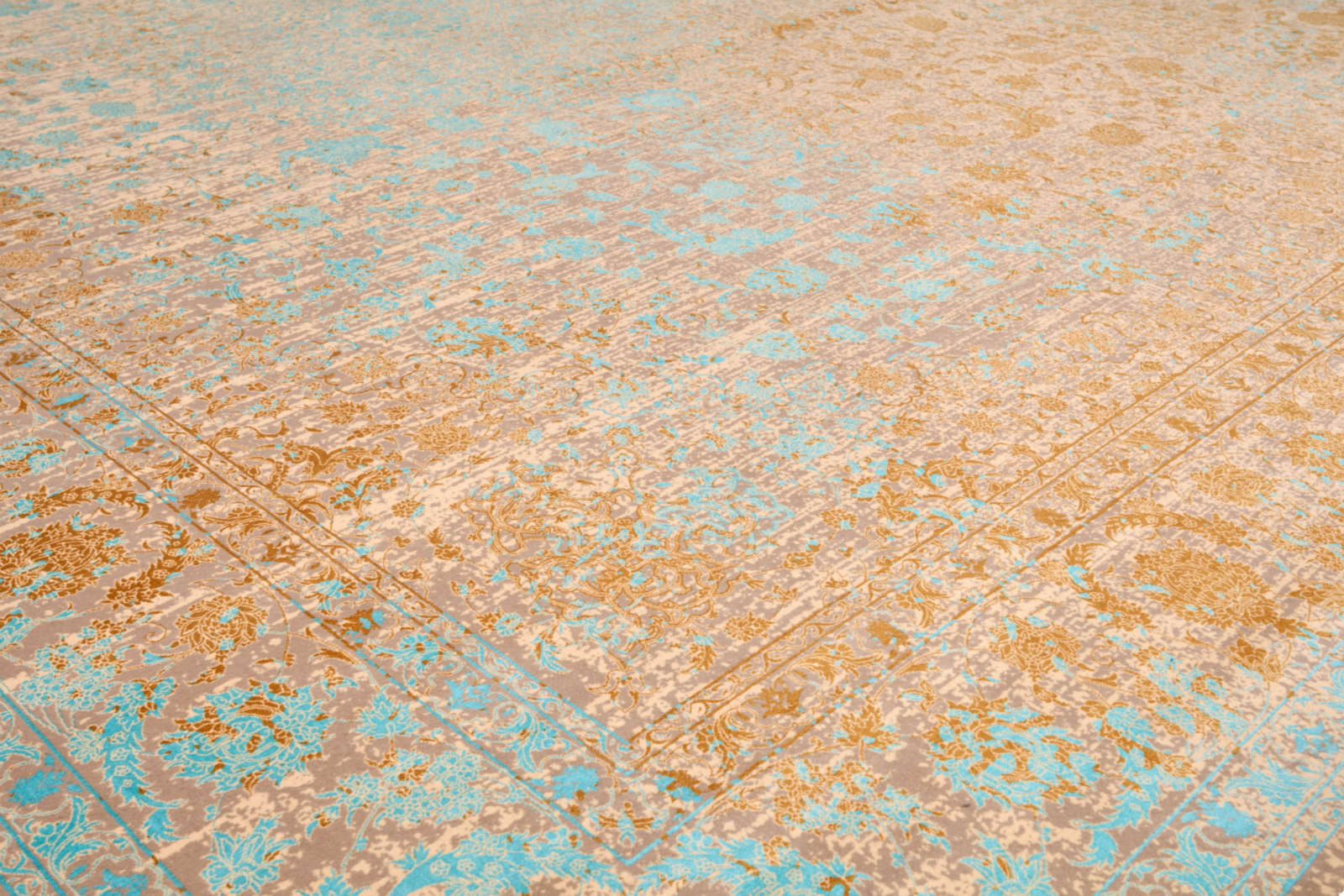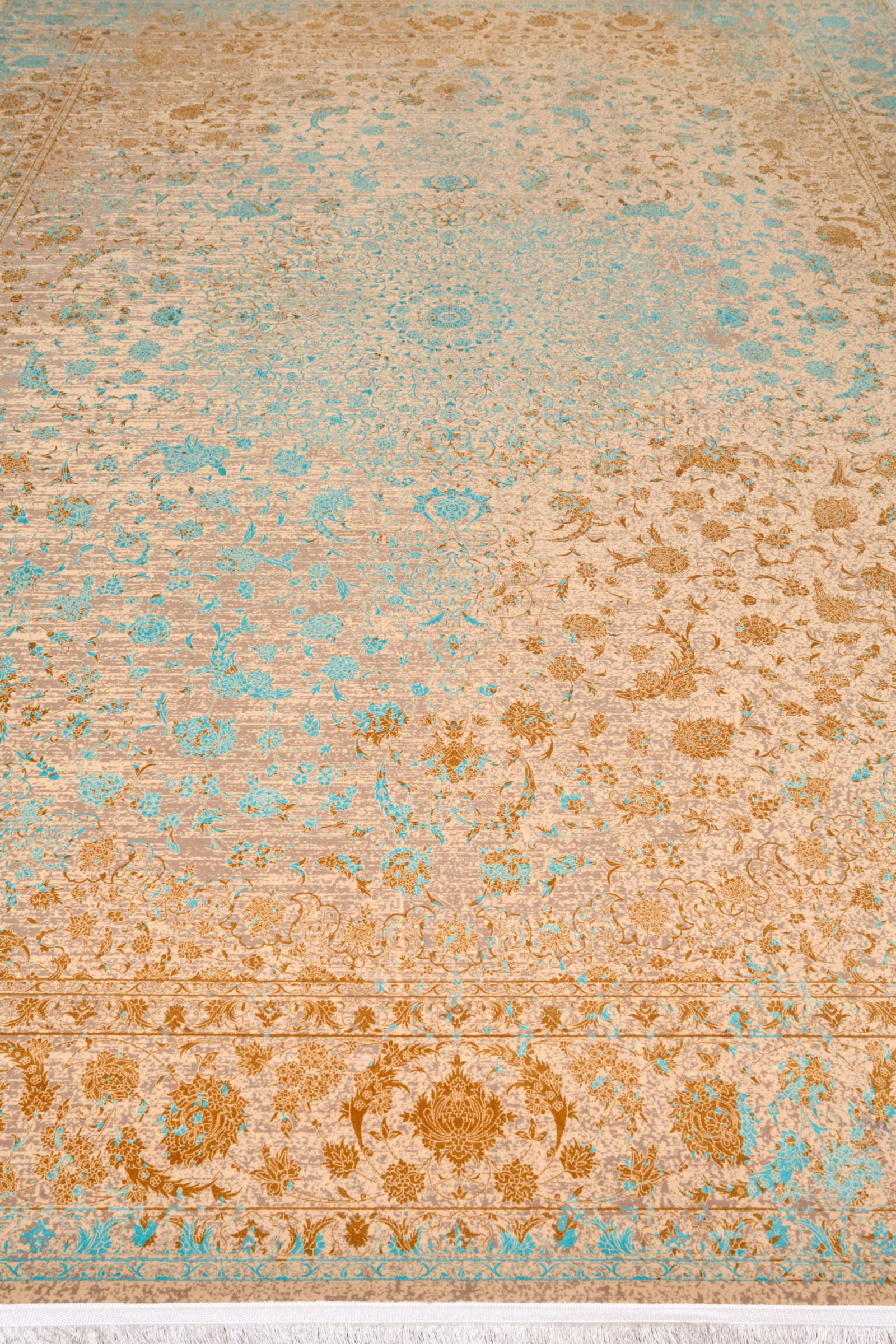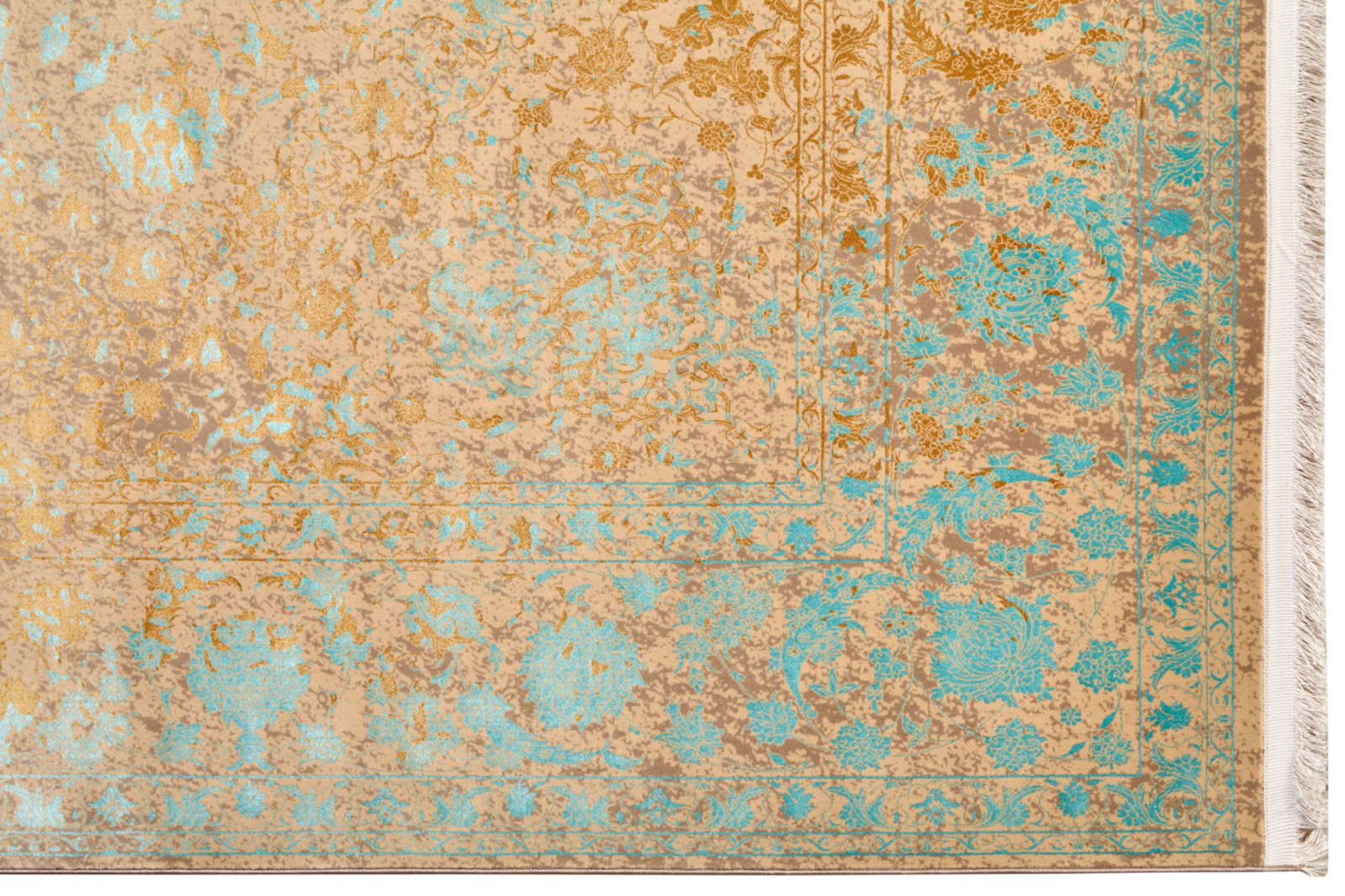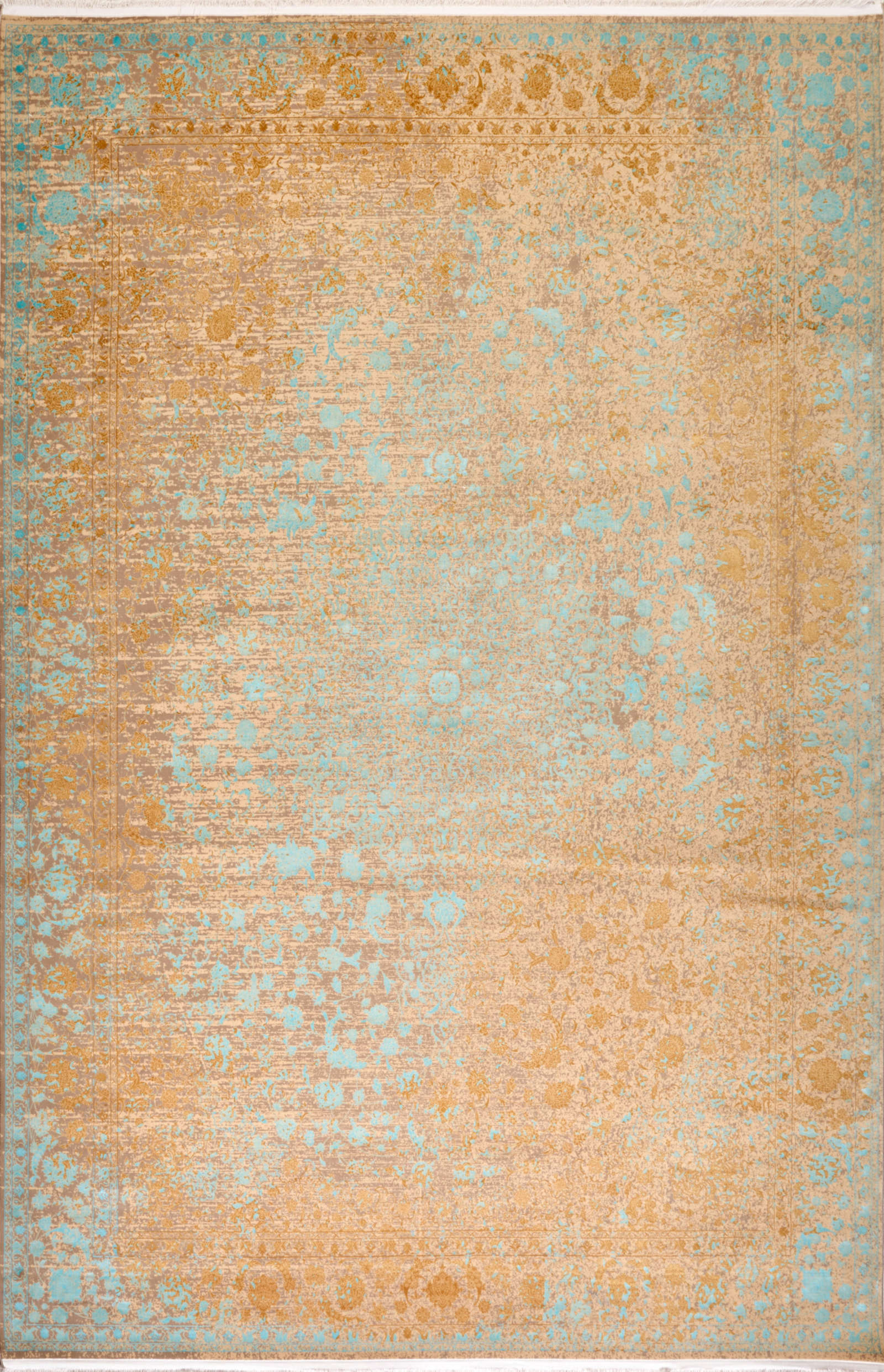 Этот ковёр — словно полотно современного художника, где каждый мазок живёт своей жизнью. Его абстрактный рисунок, подобный застывшим вспышкам рассвета, создаёт завораживающую игру оттенков и переливов на фоне нежно-лазурного неба. Мягкая поверхность дарит незабываемые тактильные ощущения, а золотистые вкрапления наполняют пространство сиянием и благородством, в котором угадываются и брызги весеннего дождя, и лучи утреннего солнца, и галактические скопления звёзд.